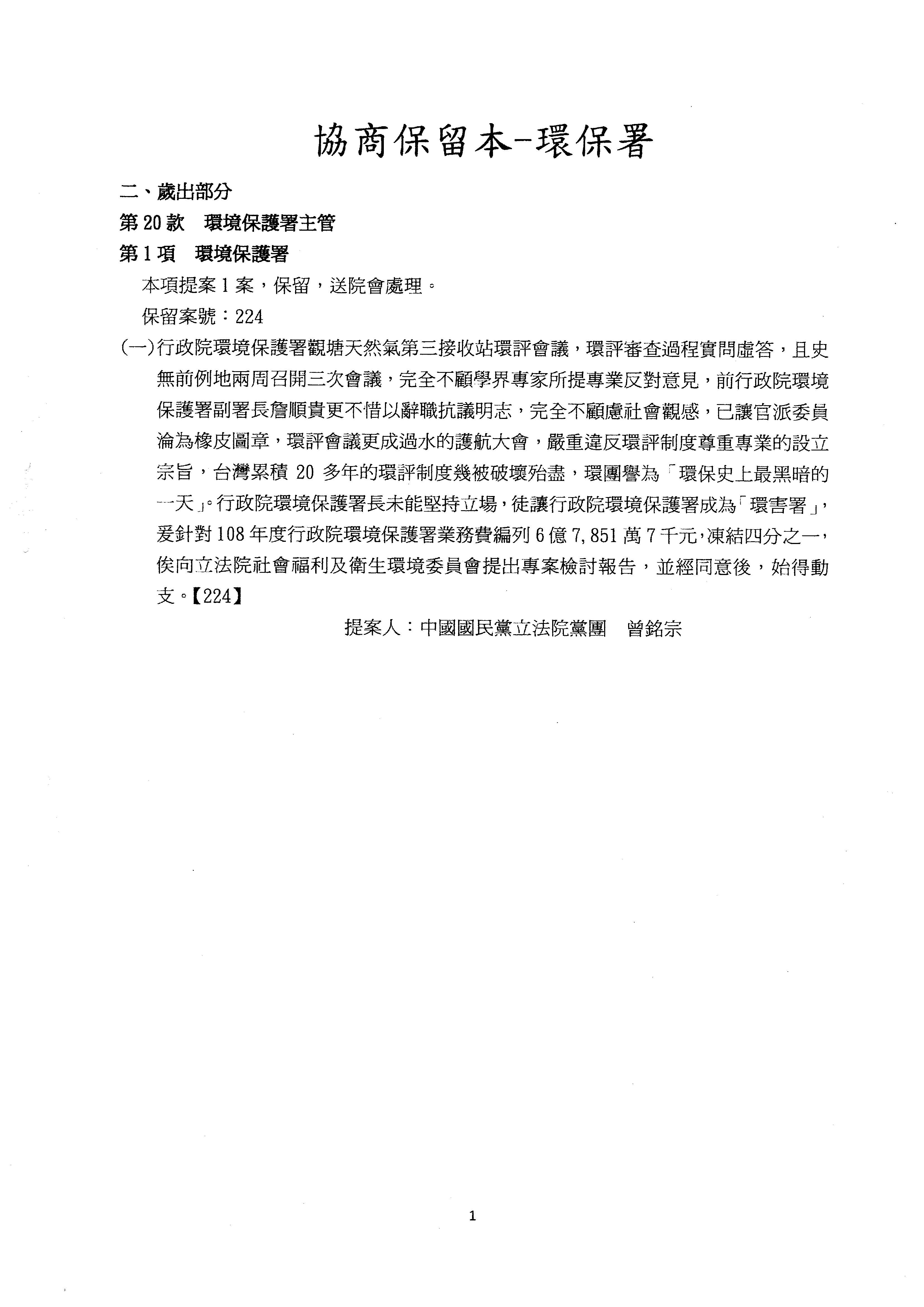 陳委員宜民:(17時20分)主席、各位同仁。今天國民黨立院黨團針對環保署的業務費提案凍結四分之一,主要的原因是在於環保署在觀塘第三天然氣接收站的環評會議沒有堅持立場,淪為橡皮圖章,因此在沒有提出報告之前,我們提案凍結四分之一的業務費。