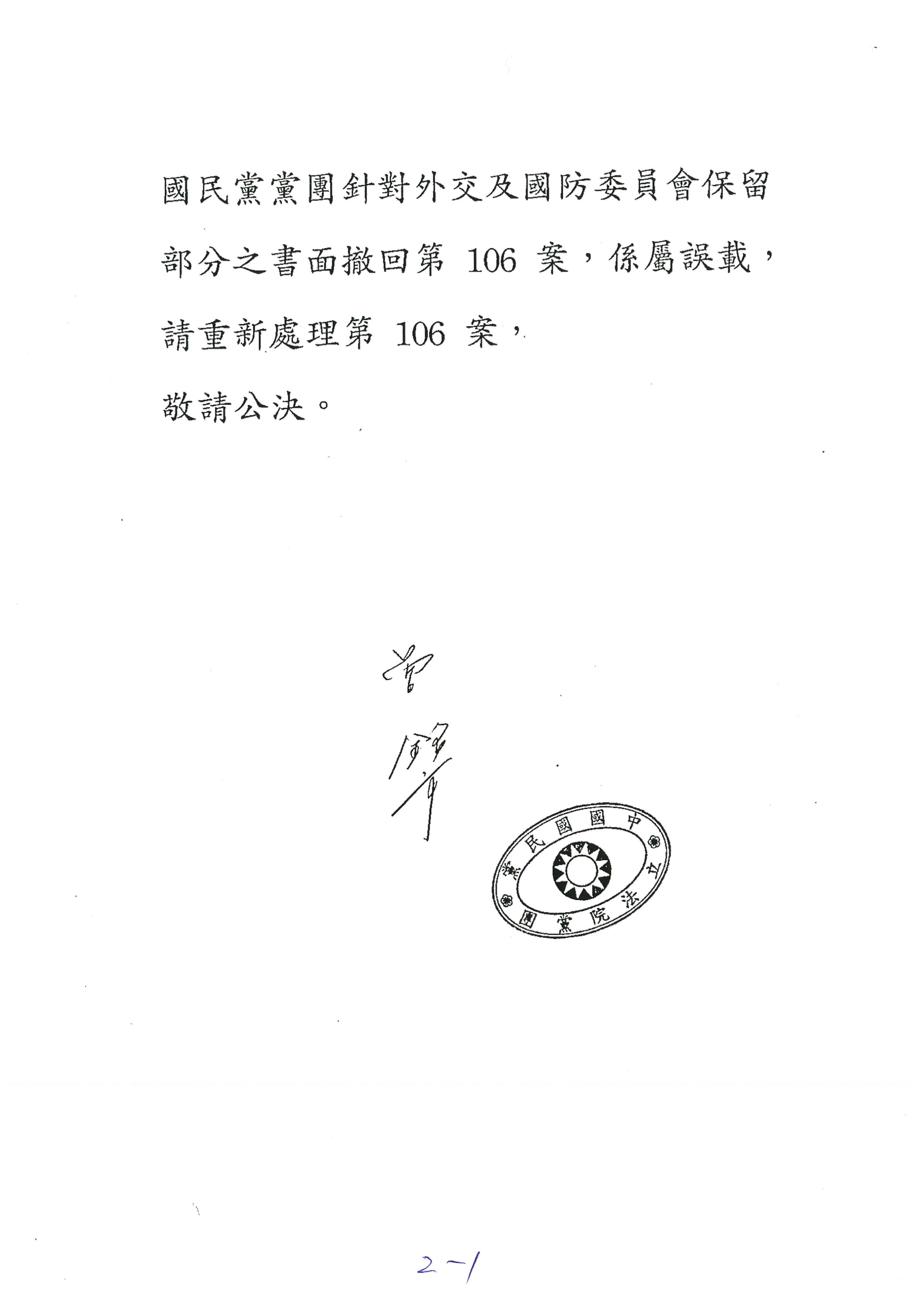 我們重新宣告:國民黨黨團新增第2案撤案,不予處理。