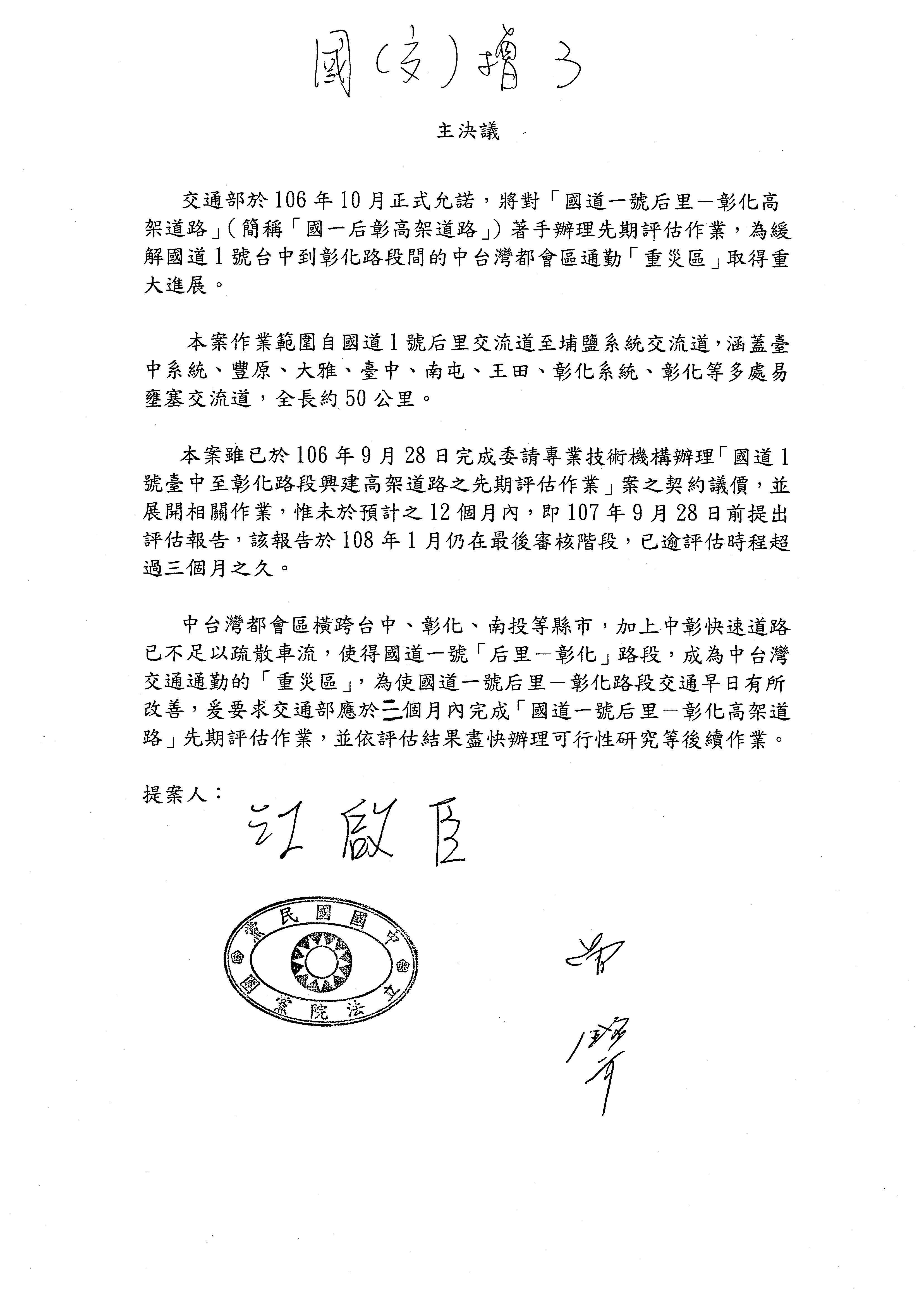 主席:請問院會,對國民黨黨團提案,有無異議?(無)無異議,現在進行第106案之處理。