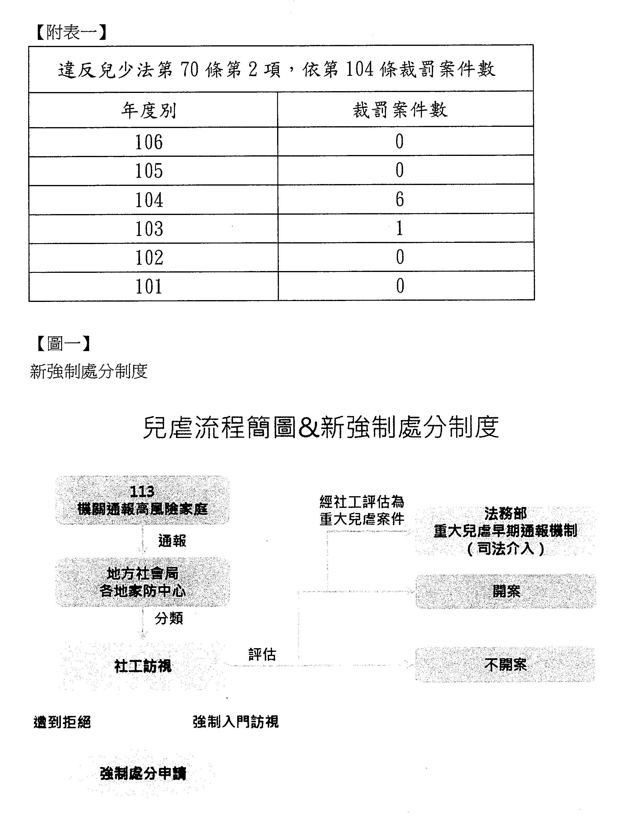 鍾委員孔炤:我知道,行政執行法第三十六條、刑事訴訟法第一百二十八條及第一百三十一條都有相關規範,但是請問有用嗎?社工人員可以依據這兩個法聲請入門嗎?實務上沒有!我現在是跟你講,法條有用,但是實務上形同具文,在這種情況下,如何讓社工人員能夠在第一時間保護到這些受虐兒童?當然你也可以跟我講有罰款啊!根據第一百零四條有相關處分,可以罰6,000元以上3萬元以下的罰款,請問罰了多少?面對這些問題,我要跟副司長強調的是,即便兒權法第七十條規定家長及有關機關有配合提供相關資料之義務,第一百零四條也有相關的罰款規定,但是你認為家長在通報後、有人檢舉後或社工人員訪視時會打開門嗎?家長如果不開門,社工人員如何進去?我們如何預防兒童受虐時面臨的身體上、生理上、心理上、精神上的迫害?