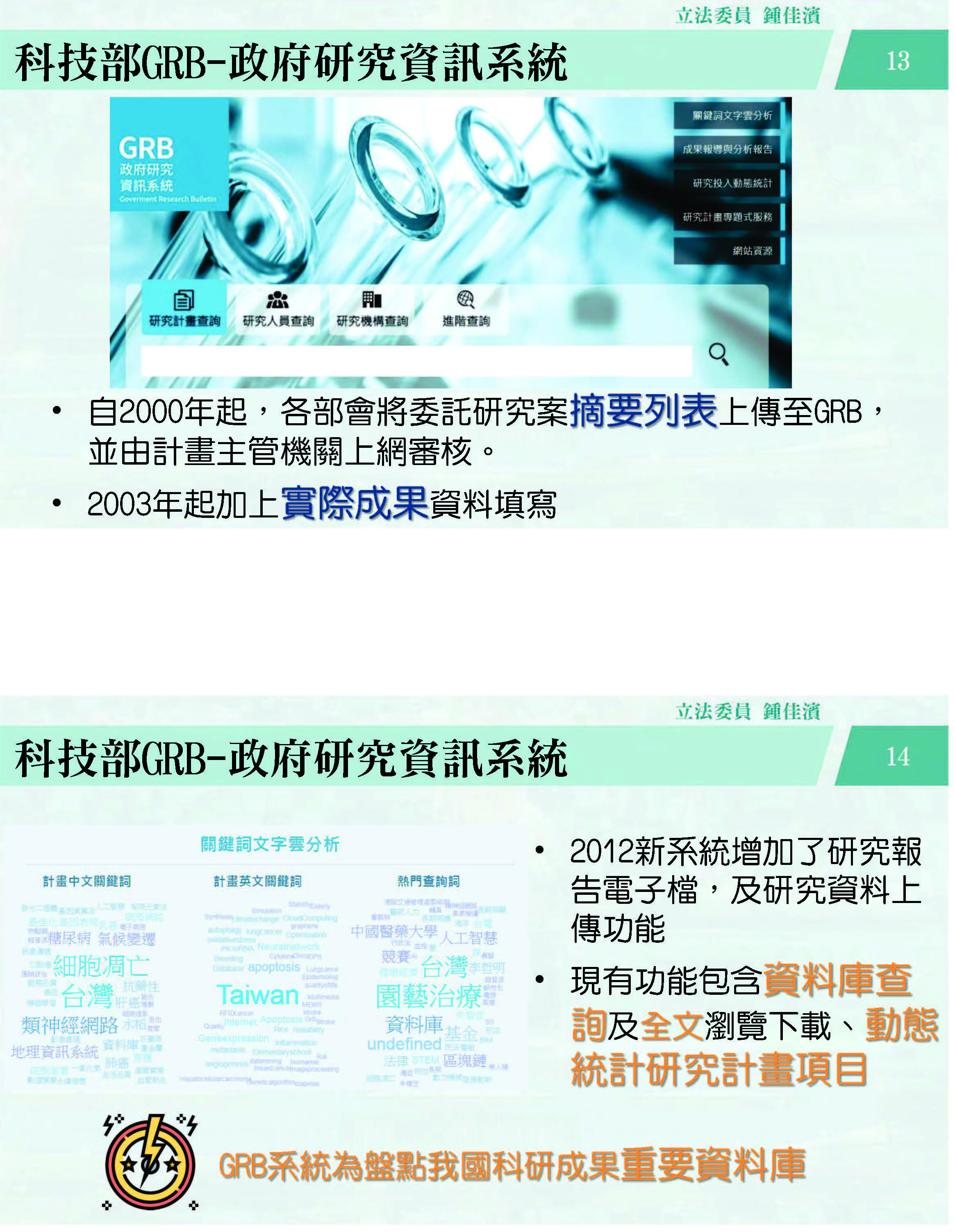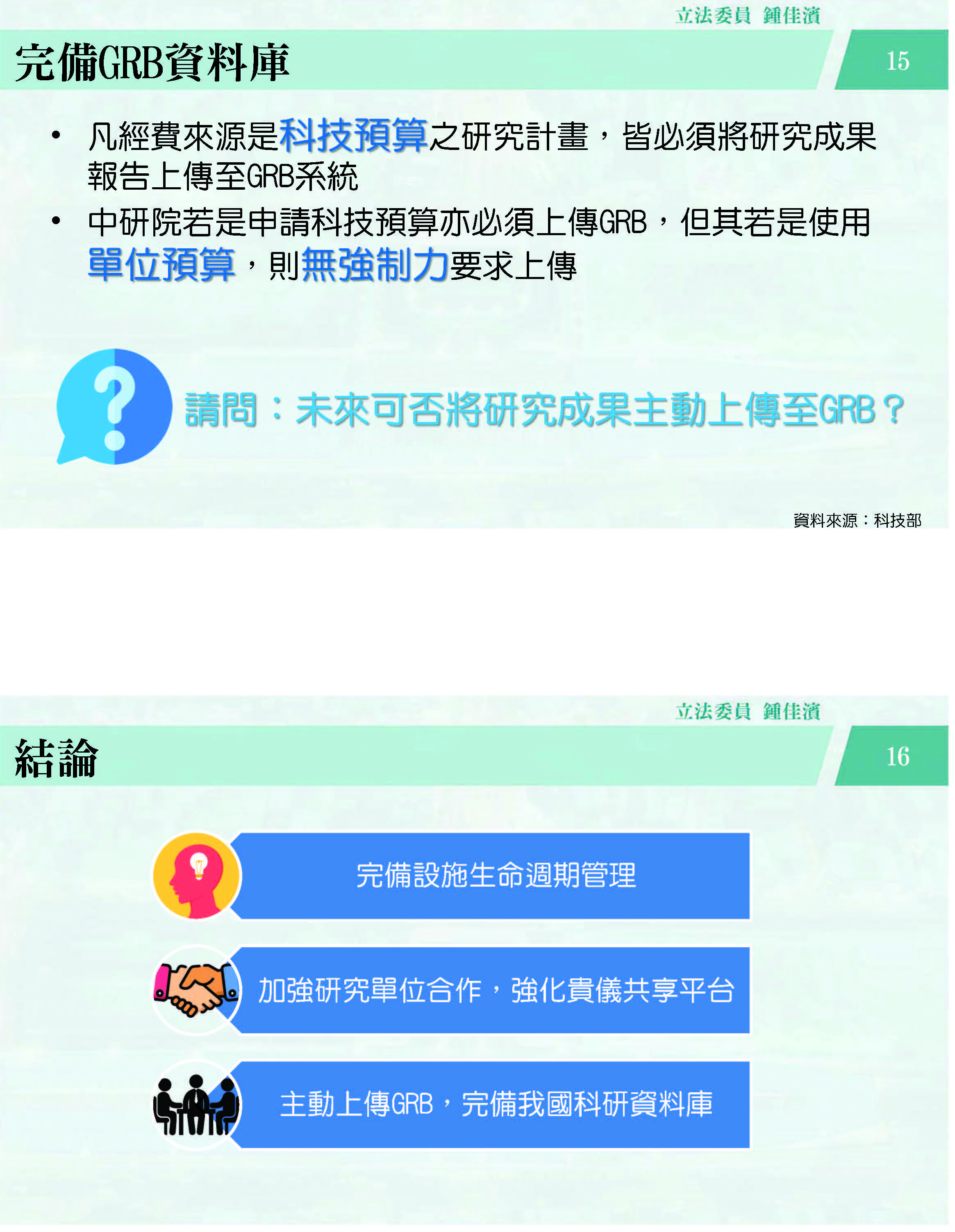 院長,我剛剛提醒您,我們的研究單位跟學者們可能沒有那麼多的時間,但是你們可以橫向聯繫科技部、教育部、文化部,其實就執行你們知識內容、知識體系最重要的管道,好不好?把大家聯繫起來,謝謝。