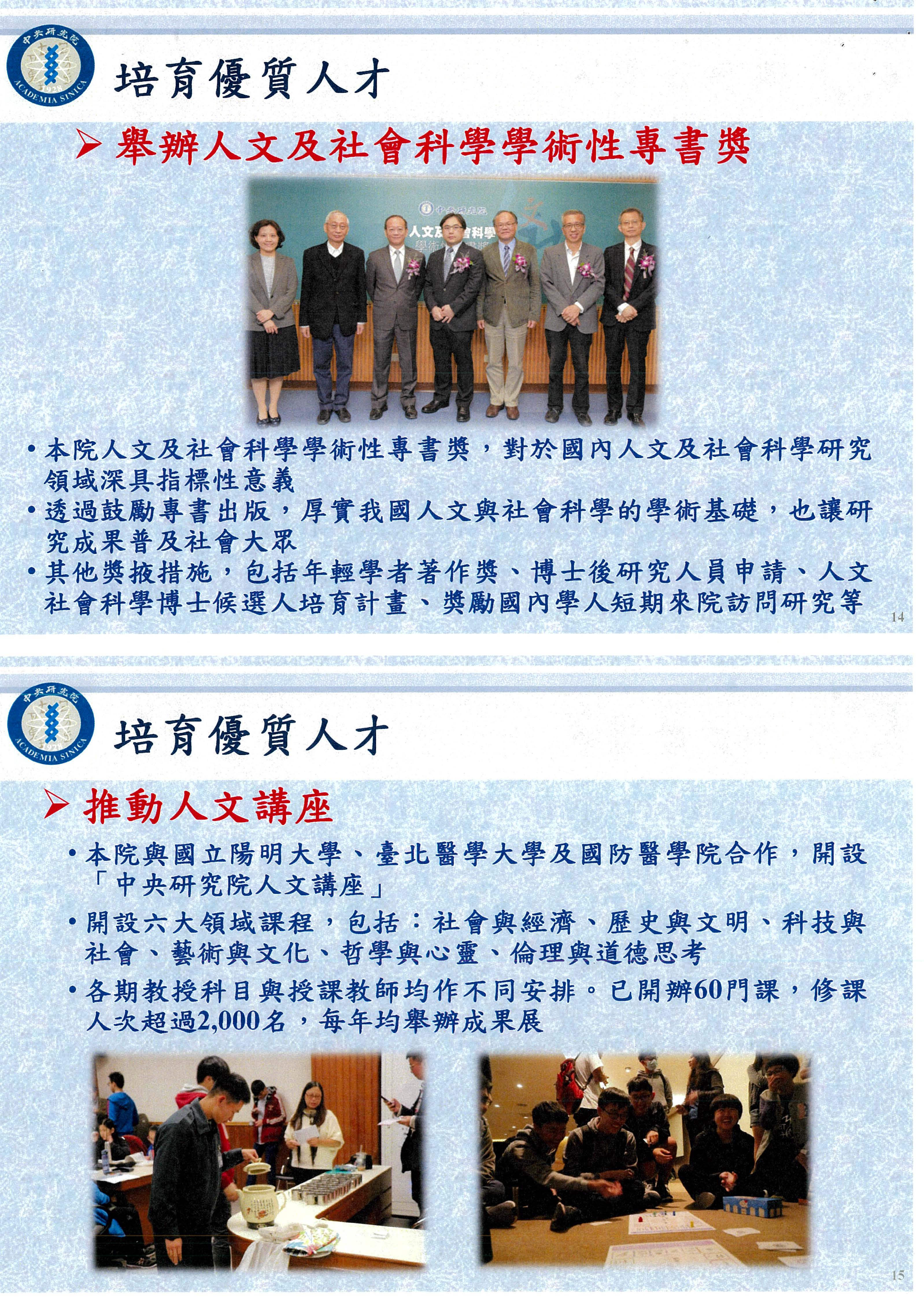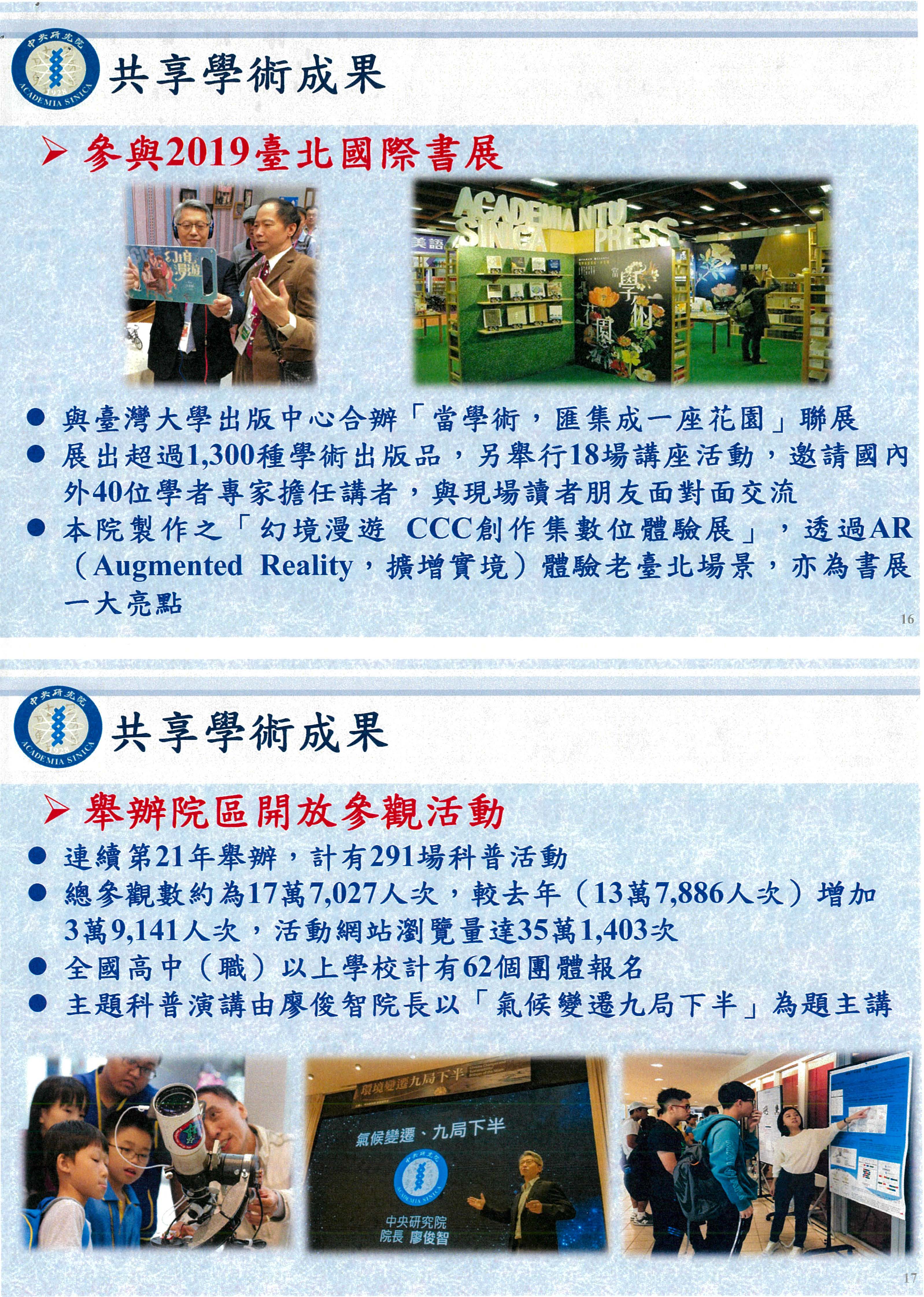 再看下一頁。剛才很多委員提到,這次的台北書展,你們特別跟台大合作展出一千三百多本這類型的出版。你看,中研院的研究能量、學術能量跟知識能量這麼龐大,我剛才只不過舉了時語所跟民族所研究員有一些研究,是跟我們的產業尤其是文化產業,包括電影、電視、編劇或遊戲相關,現在的遊戲不是打打殺殺的一個程式,它是有一些內容的、一些特殊的部分,像這樣的內容,台灣以外的國家哪一個做得出來?這就是我們的特殊,而且它不是亂胡想的,它是有一些根據、有學術依據的,有些學者對這些有研究,他不會去鼓勵迷信。
