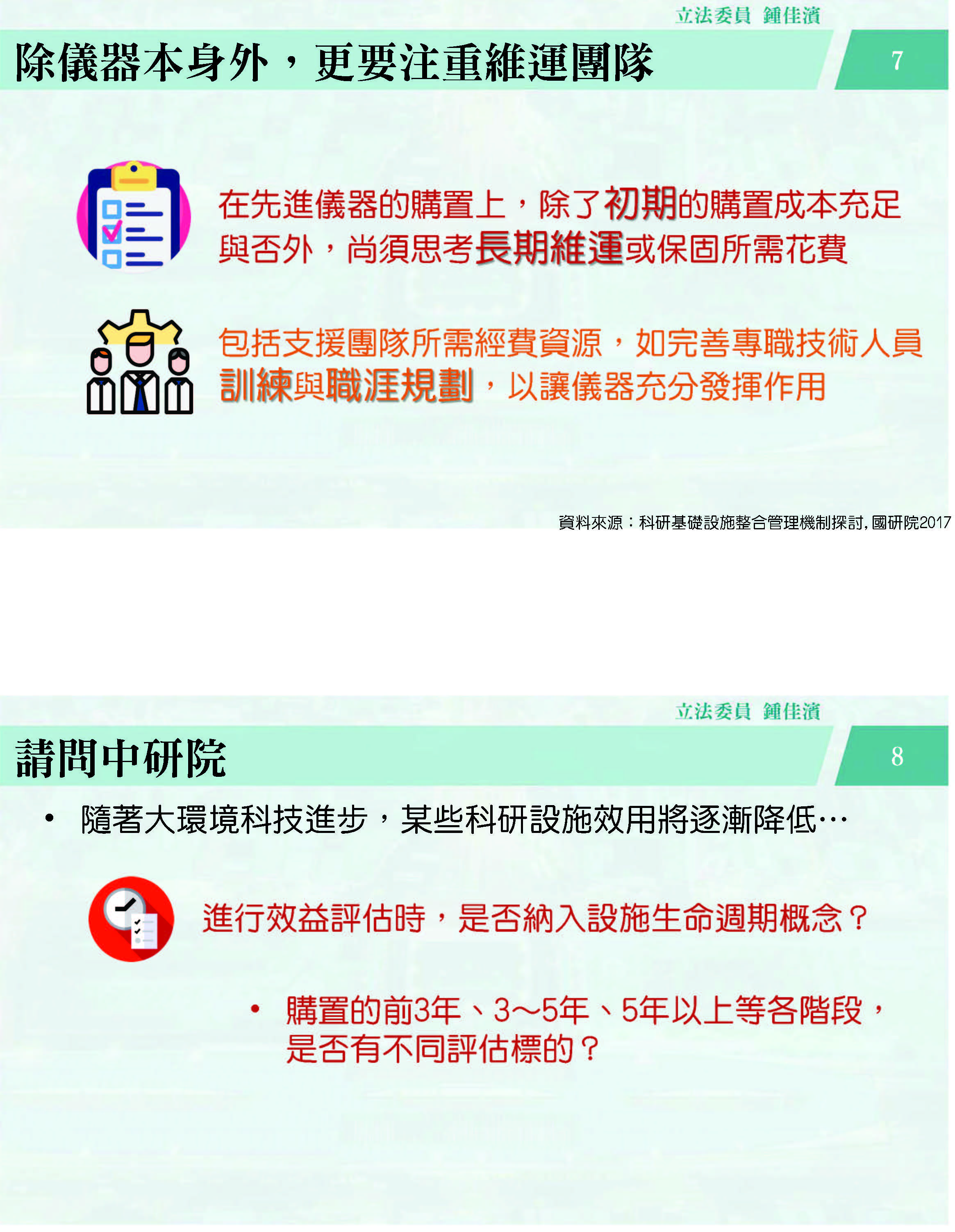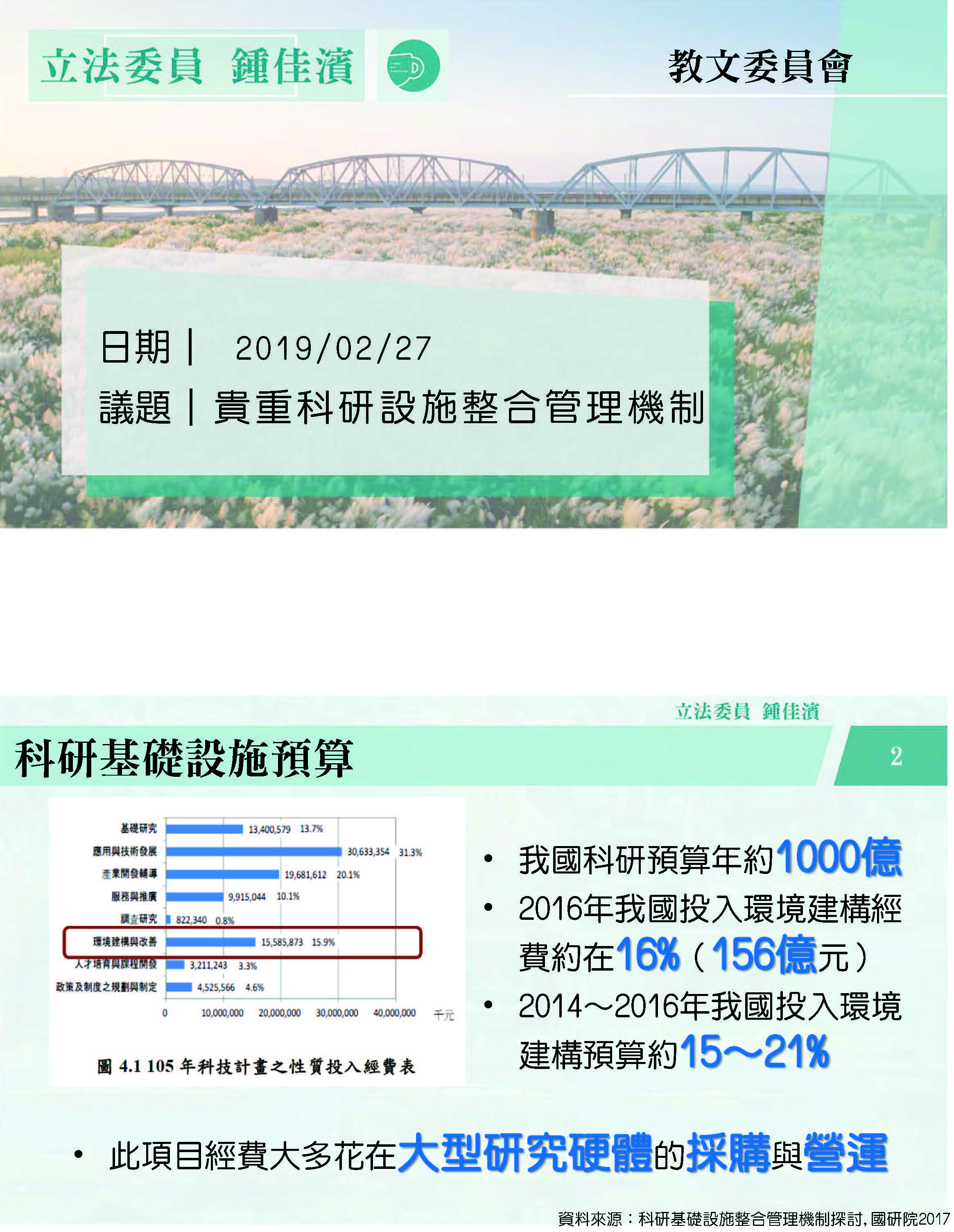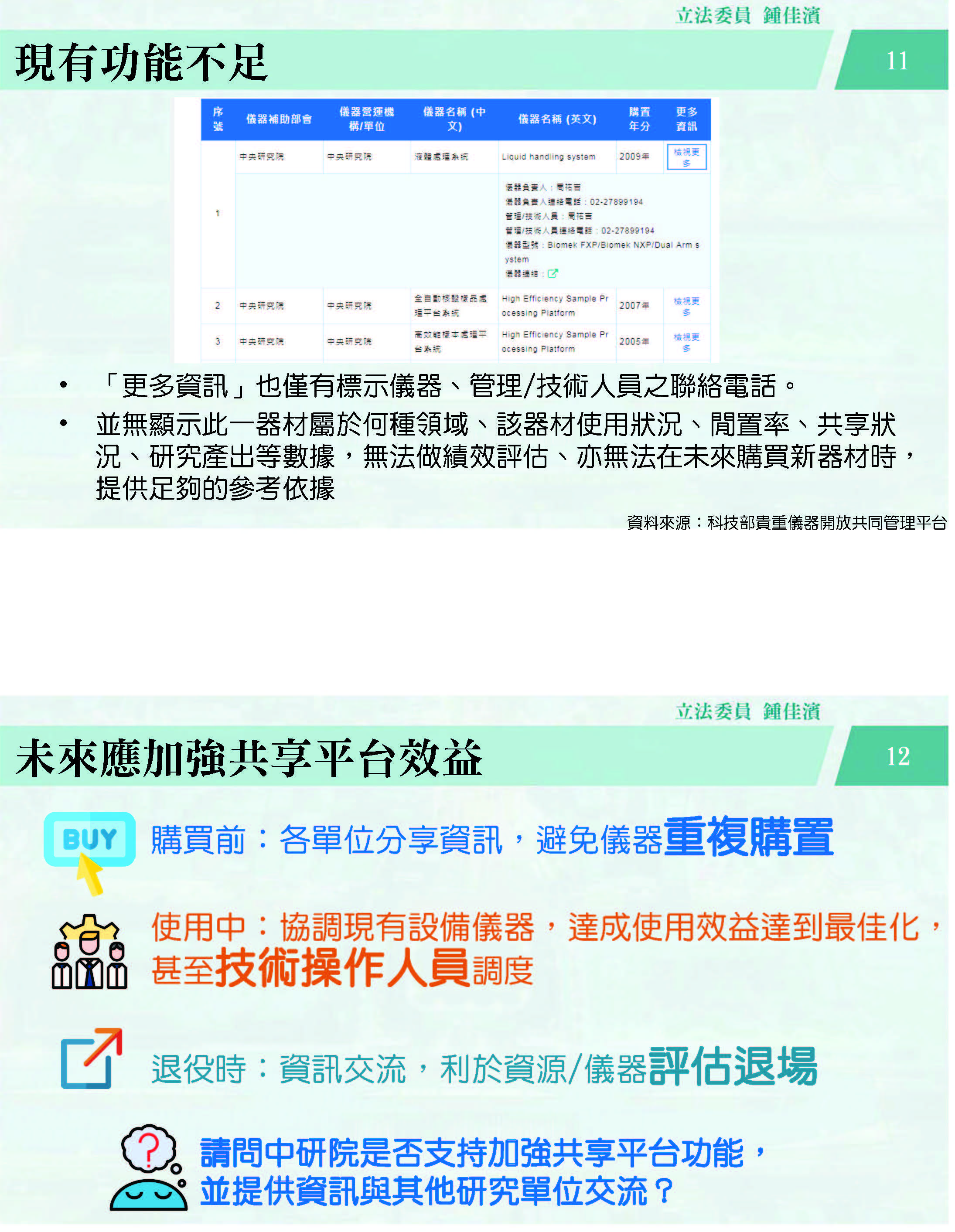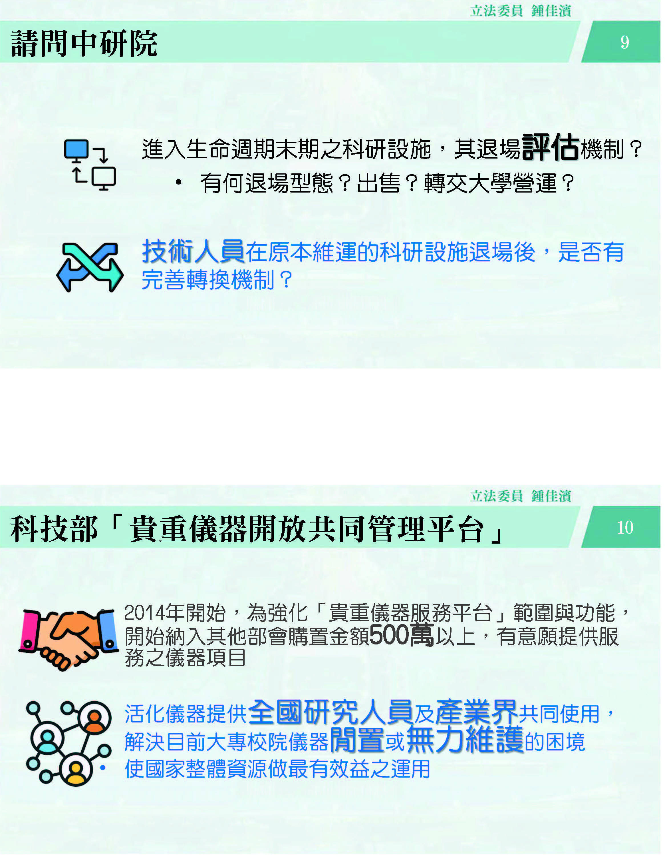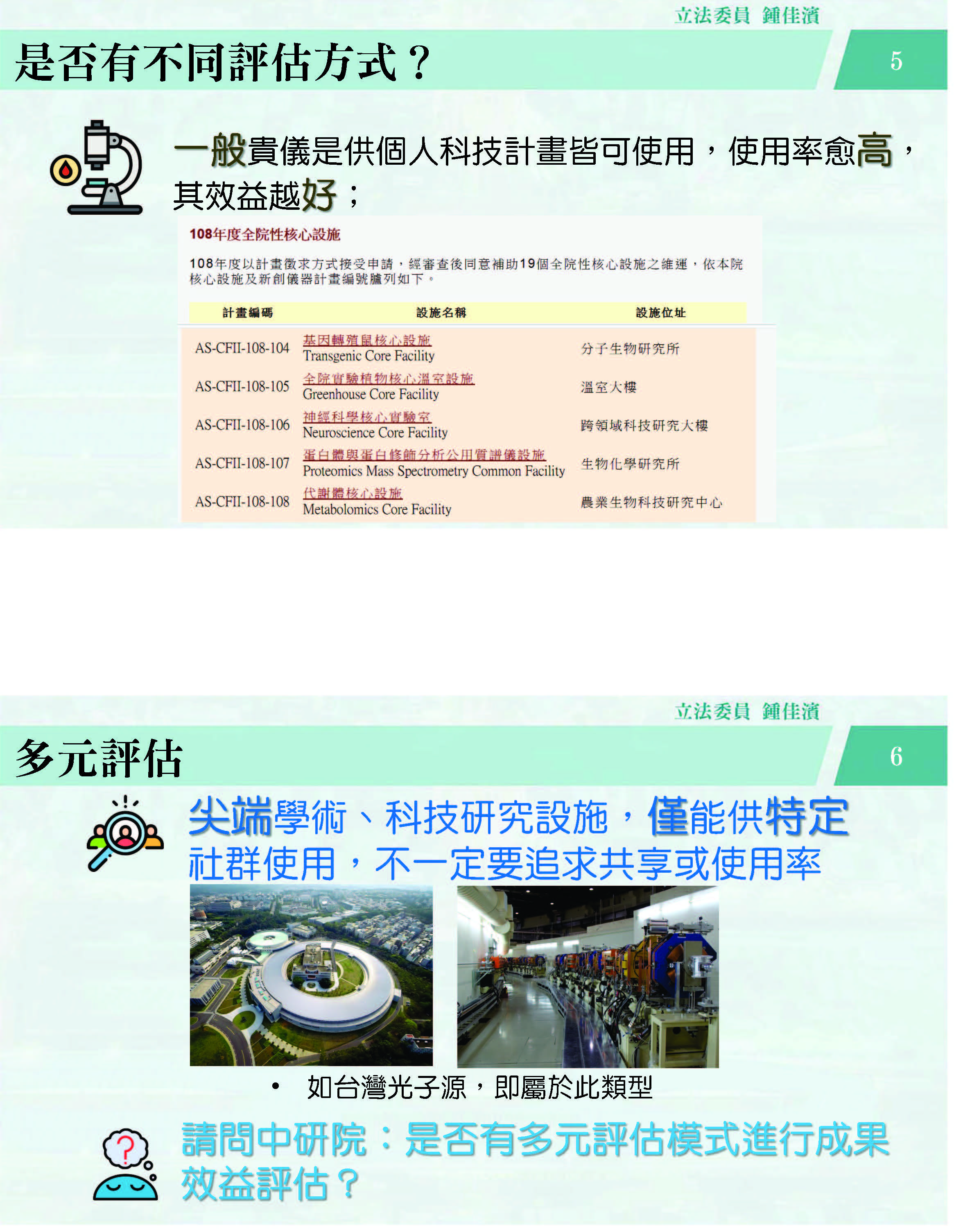 鍾委員佳濱:主席、各位列席官員、各位同仁。院長好,方才您接受柯委員質詢時曾經提及,目前中研院最重要的任務就是做好研究,對不對?