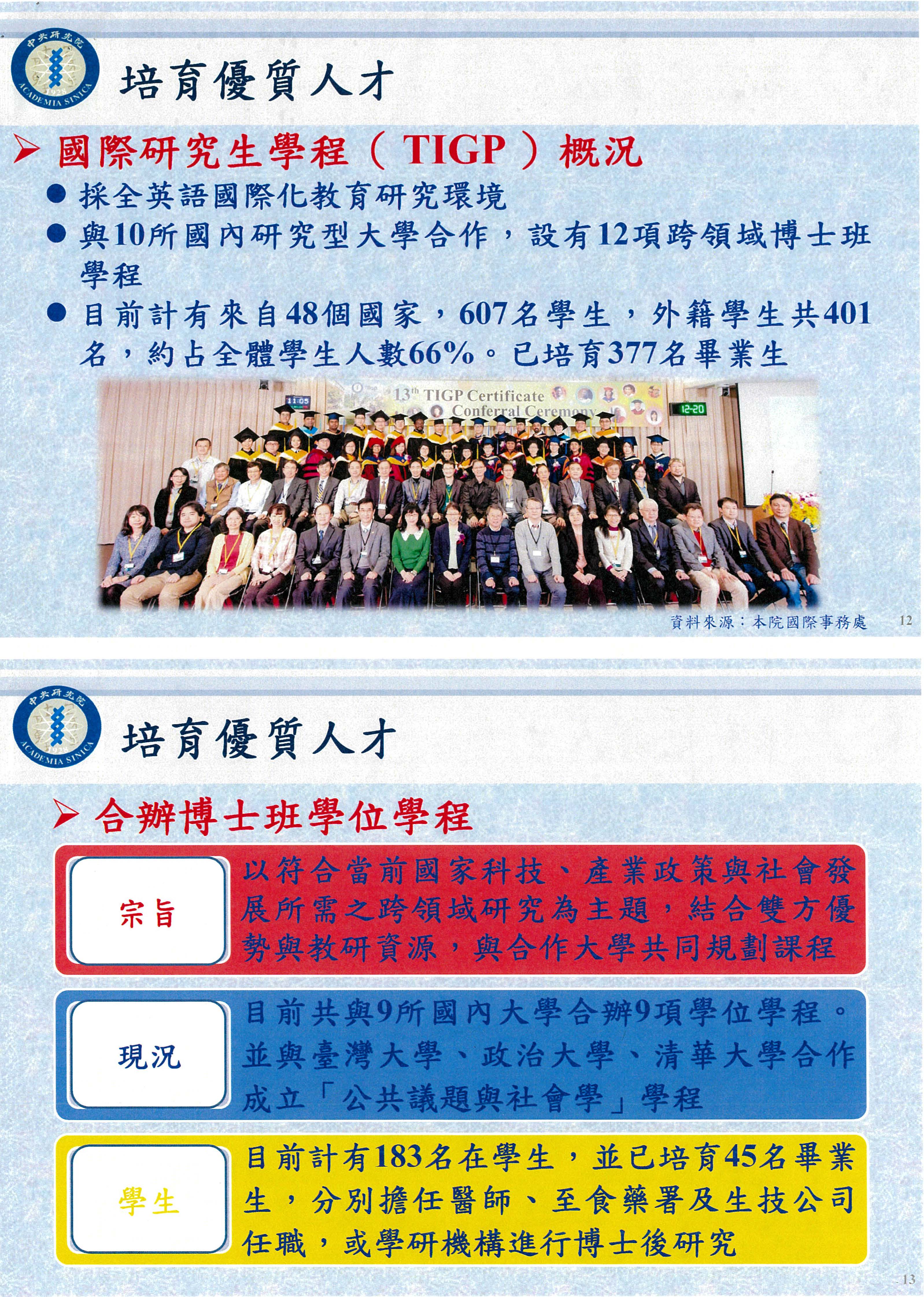廖院長俊智:基本上,我們的政策、目標是替國家培育人才,我們希望人才培育之後能到別的地方去用,這對我們來說也是一個很大的貢獻,我們希望人才能夠流用、流通,而不是保留在中研院。