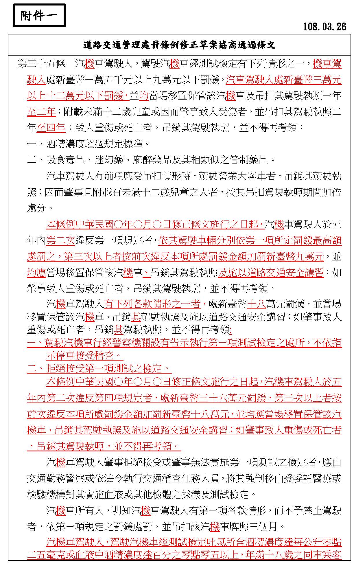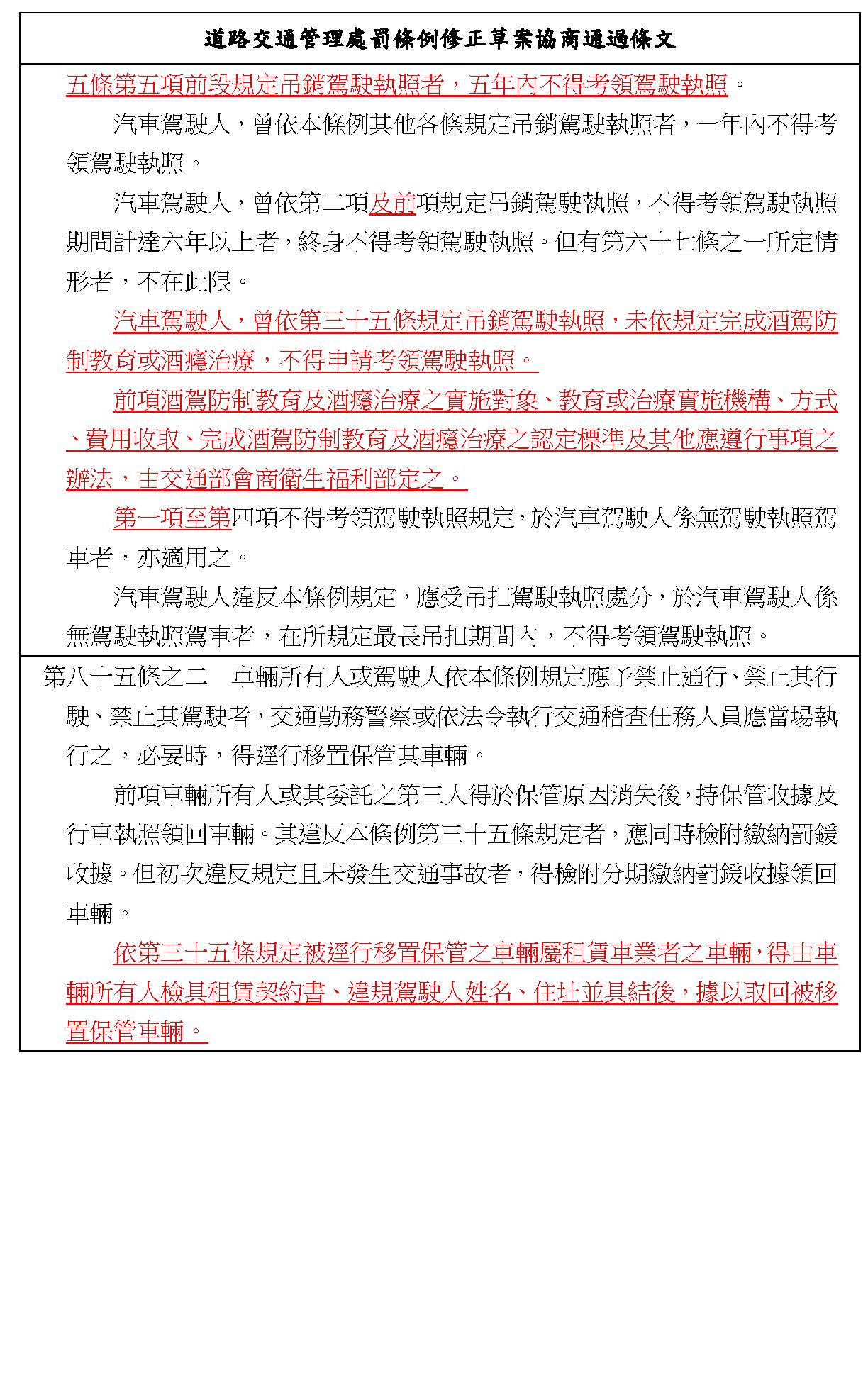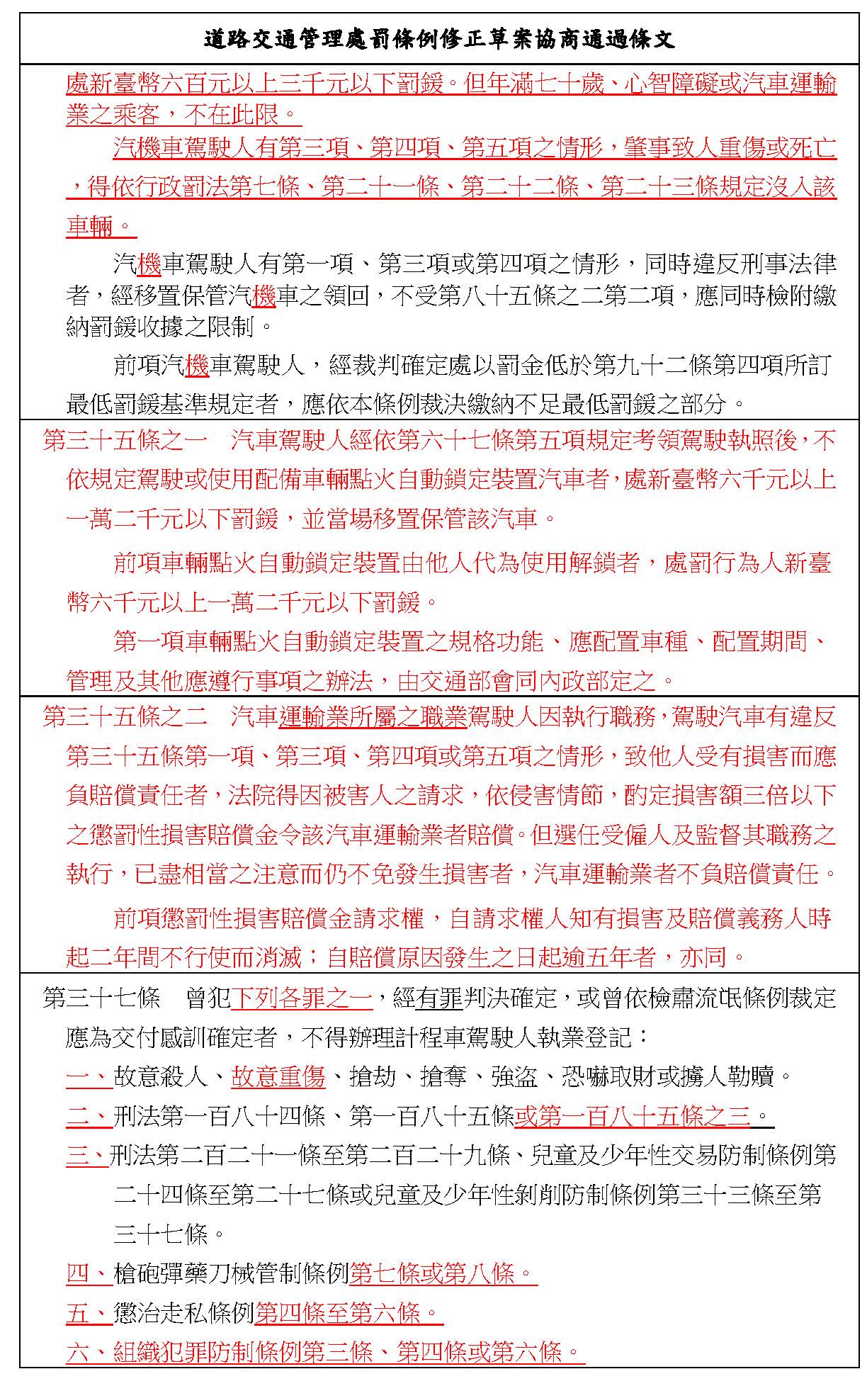 陳委員怡潔:針對第三十五條,親民黨有提出一項修正動議,就修正的部分而言,我們主張無論汽機車都是處罰三萬元至九萬元,因為我們認為這本質上都是酒駕,所以用提高罰鍰的方式來因應與防範。另外是累犯者罰三十六萬元,第三次起按次加罰十八萬元,如果造成重傷或死亡的話,就直接沒入車輛。再者是有關連坐法的部分,也就是處罰汽車所有權人及同車乘客,這部分是親民黨黨團比較堅持的,這部分的罰鍰是六千元至三萬元,包括對肇事者也賦予相對的連帶責任。