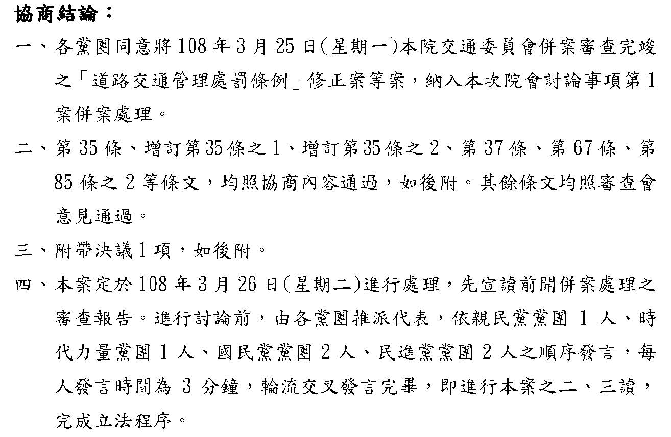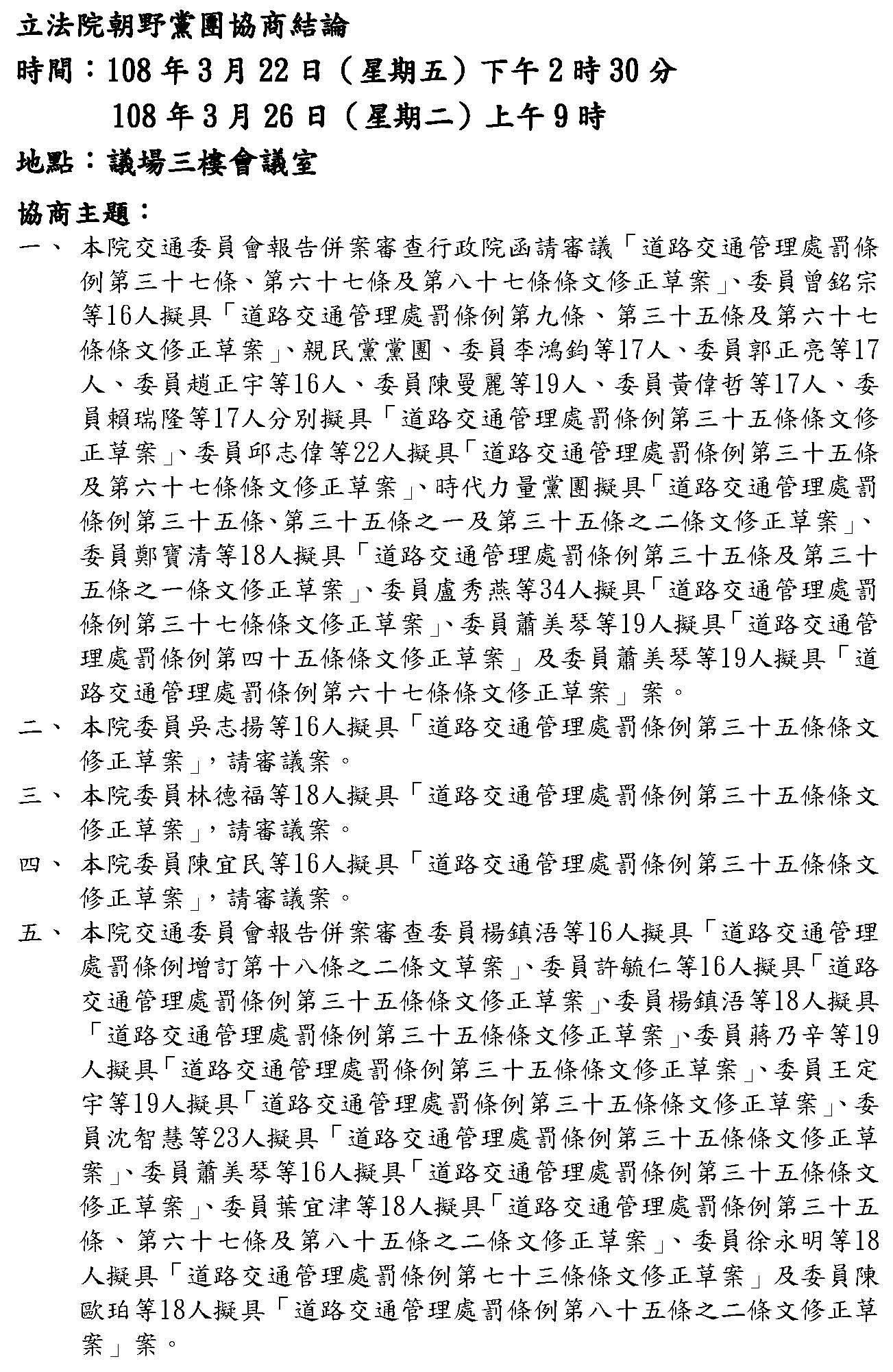 一、各黨團同意將108年3月25日(星期一)本院交通委員會併案審查完竣之「道路交通管理處罰條例」修正案等案,納入本次院會討論事項第一案併案處理。因為要處理昨天會議之宣告,所以我們要併案處理。