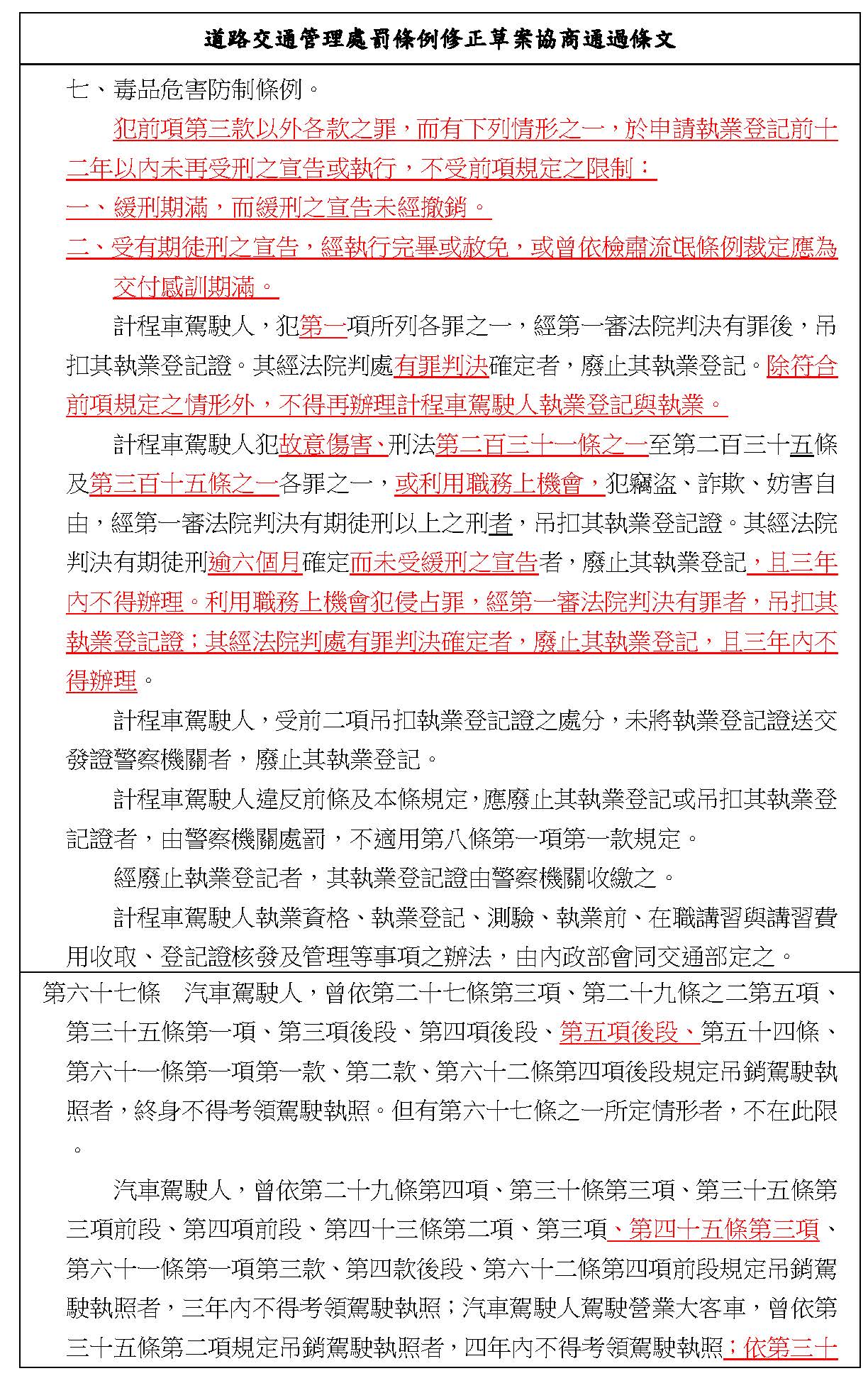 其次,委員版本在2月26日協商時,原條文當中的主文不見了,所以我必須再次強調有關酒精鎖的主文為「一、酒精濃度超過規定標準。二、吸食毒品、迷幻藥、麻醉藥品及其相類似之管制藥品。」,然後再加上「汽車駕駛人有前項第一款之情形者,其駕駛之車輛應加裝酒精氣敏點火自鎖裝置。」,酒精氣敏點火自鎖裝置就是俗稱的酒精鎖,這是關於這部分的修法,第三十五條原本的修正內容就是在這裡。