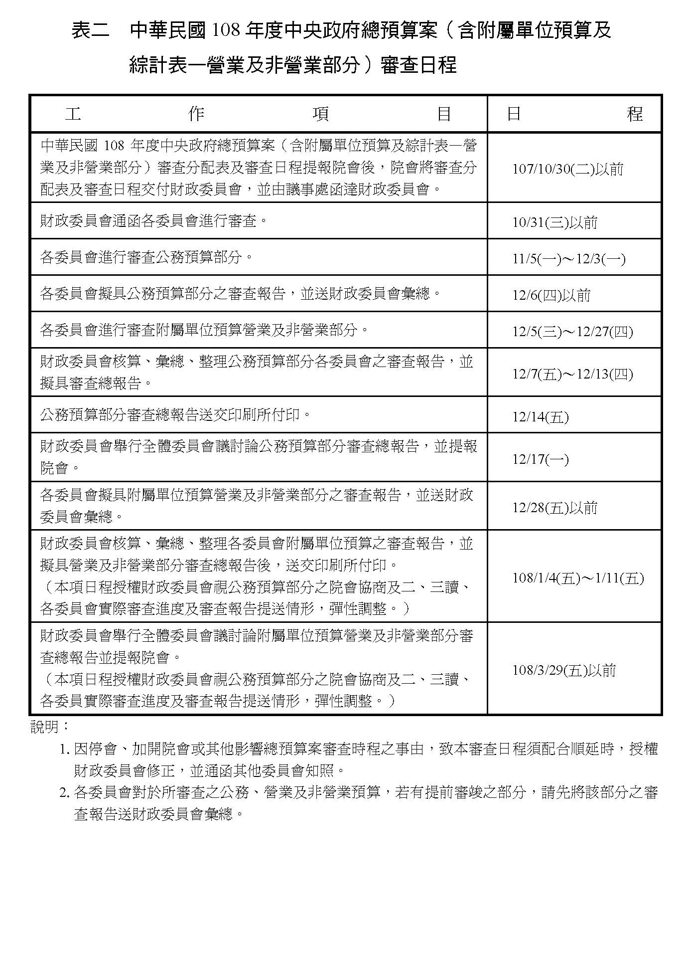 行政院於中華民國107年8月31日以院授主預彙字第1070102139號函略以中華民國108年度中央政府總預算案(含附屬單位預算及綜計表—營業及非營業部分)業已依法編製竣事,並於107年8月16日經行政院第3613次會議通過,附同施政計畫送請本院審議,關於外交、國防及僑務機密部分,請作機密件處理。另本院財政委員會依據中央政府總預算案審查程序第3條第2項規定研擬中華民國108年度中央政府總預算案(含附屬單位預算及綜計表—營業及非營業部分)審查日程暨審查分配表草案,經提第9屆第6會期財政委員會第7次全體委員會議(107.10.25)決議照草案通過,提報院會。復經提本院第9屆第6會期第6次會議(107.10.26)報告後決定:「併108年度中央政府總預算案處理。」另同次會議亦邀請行政院院長、主計長及財政部部長等列席報告該預算案編製經過,並答復委員質詢後決定:「108年度中央政府總預算案(含附屬單位預算及綜計表—營業及非營業部分)交財政委員會依分配表及日程分送各委員會審查」。