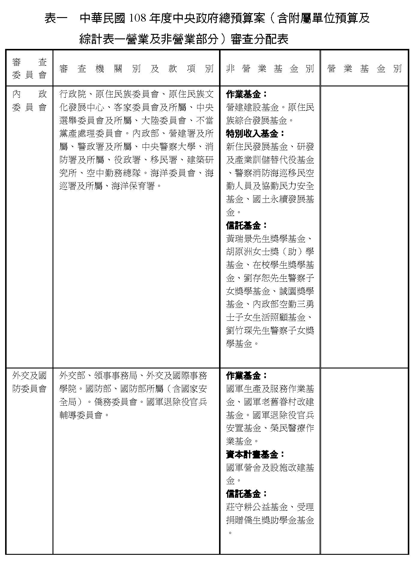 茲因中華民國108年度中央政府總預算案先行審議單位預算,其涉及附屬單位預算營業及非營業部分,均暫照列,俟附屬單位預算審議確定後再行調整。各委員會爰依據中華民國108年度中央政府總預算案(含附屬單位預算及綜計表—營業及非營業部分)審查分配表及審查日程,於公務預算部分審查完竣後,繼續進行附屬單位預算營業及非營業部分之審查工作。