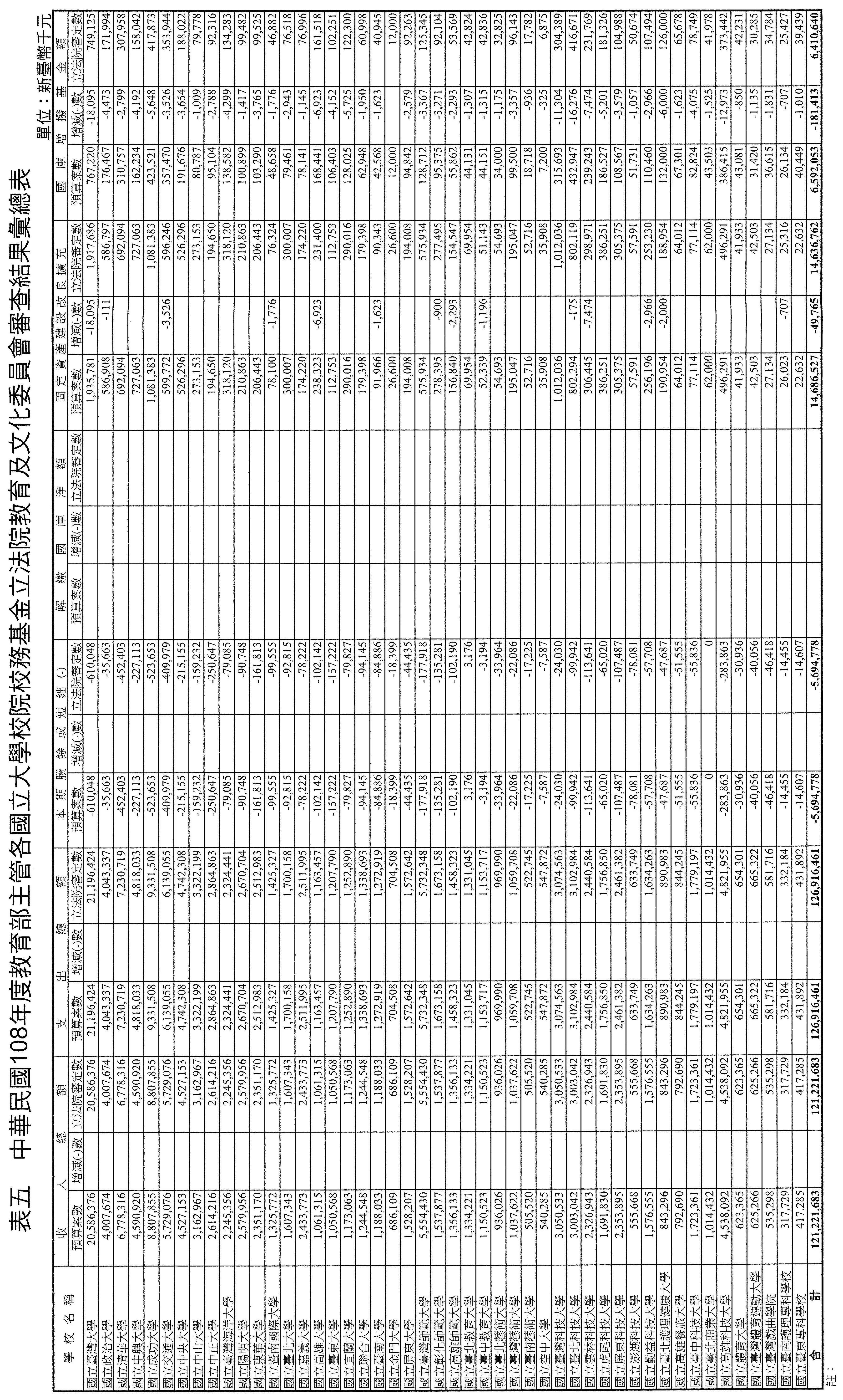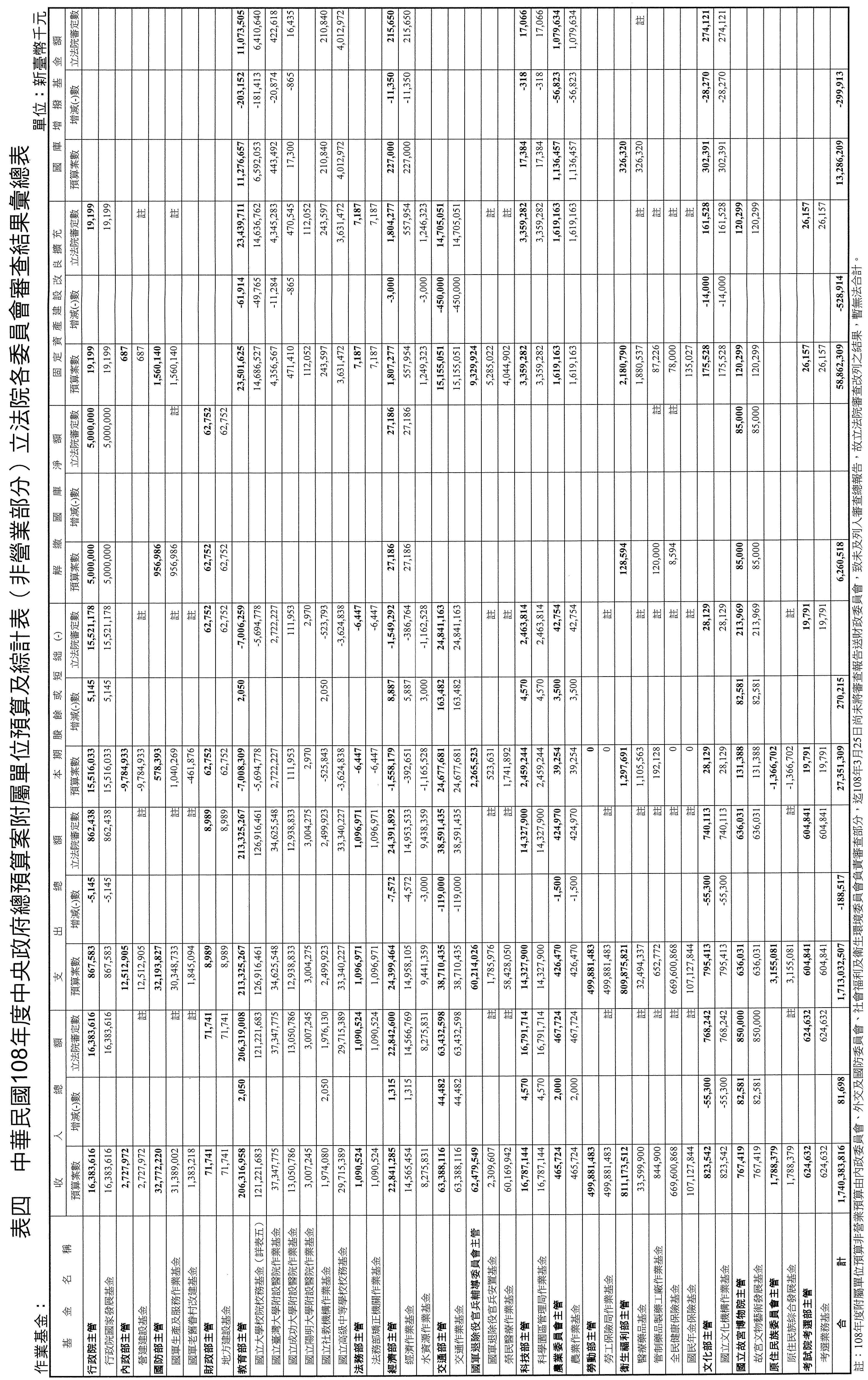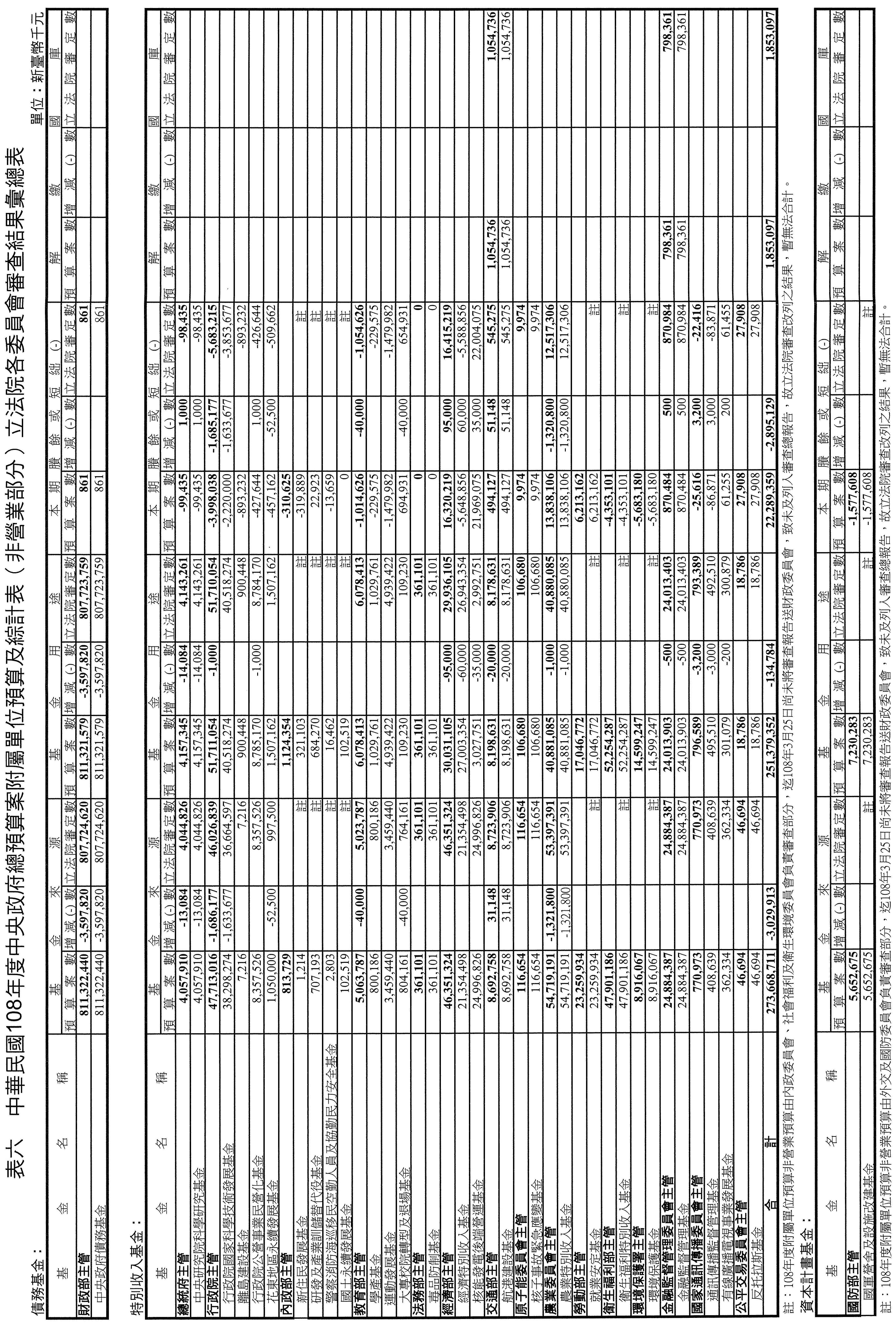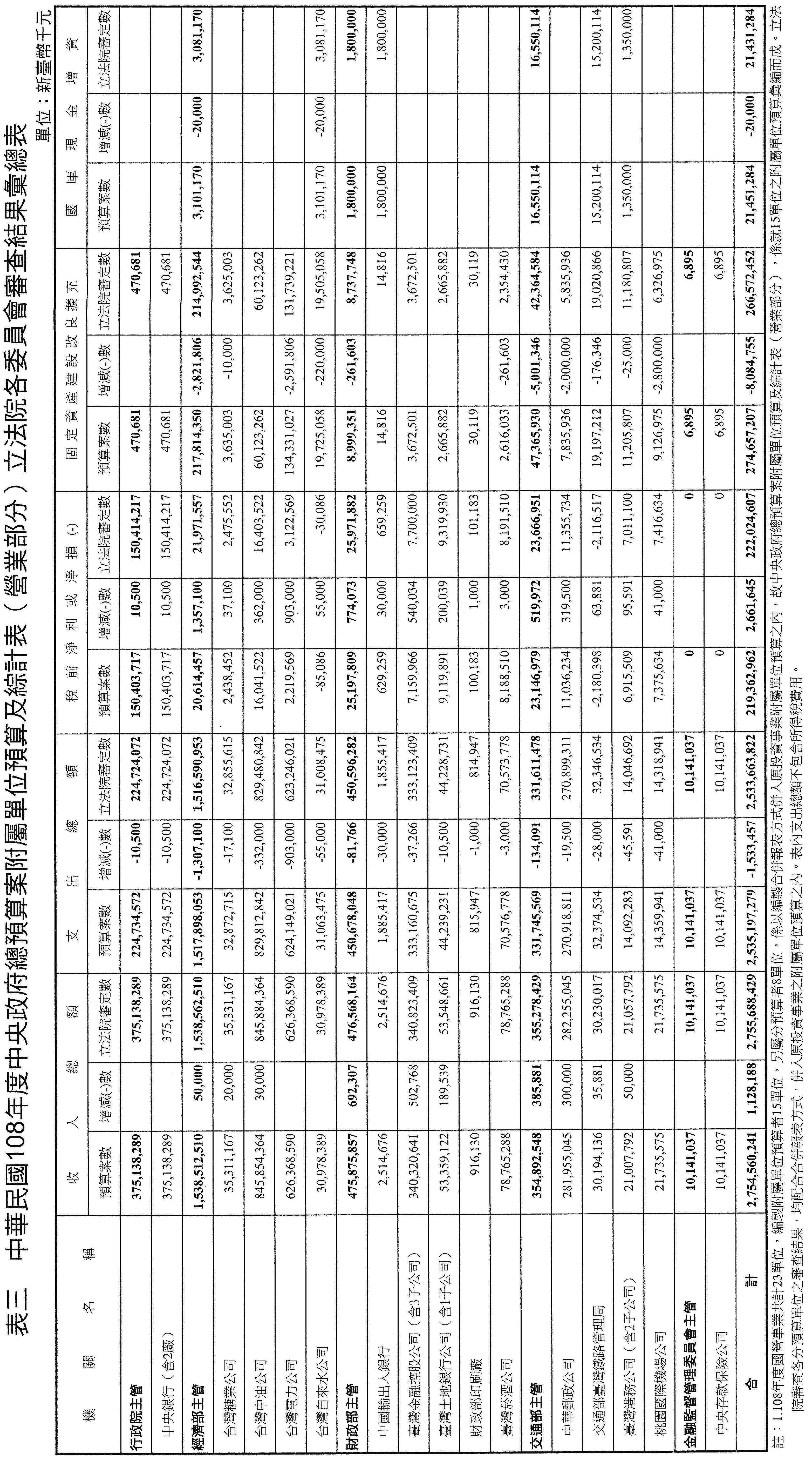 中華民國108年度中央政府總預算案附屬單位預算及綜計表營業部分,原列營業總收入2兆7,545億6,024萬1千元,營業總支出2兆5,442億8,077萬8千元,稅後淨利2,102億7,946萬3千元。審查結果,增列營業總收入11億2,818萬8千元,減列營業總支出(不含所得稅費用)15億3,345萬7千元,增列稅前淨利26億6,164萬5千元(詳表三)。至於所得稅費用及盈虧撥補事項,俟院會審議確定後,再由行政院依法核算及分配。各單位有關之業務計畫、轉投資、重大建設、資金運用及資產負債預計等部分,應分別依本案審定數額予以調整。