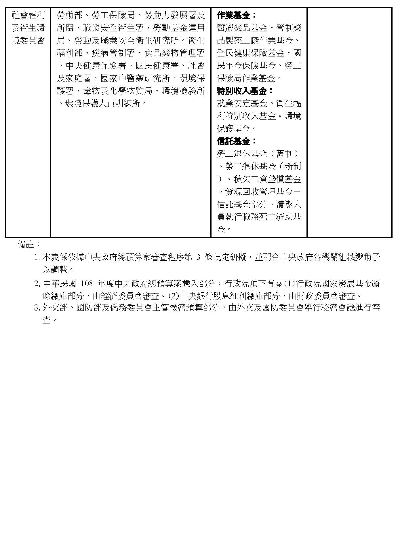 中華民國108年度中央政府總預算案附屬單位預算非營業預算部分,社會福利及衛生環境委員會迄108年3月25日尚未將審查報告送財政委員會,致未及列入審查總報告。