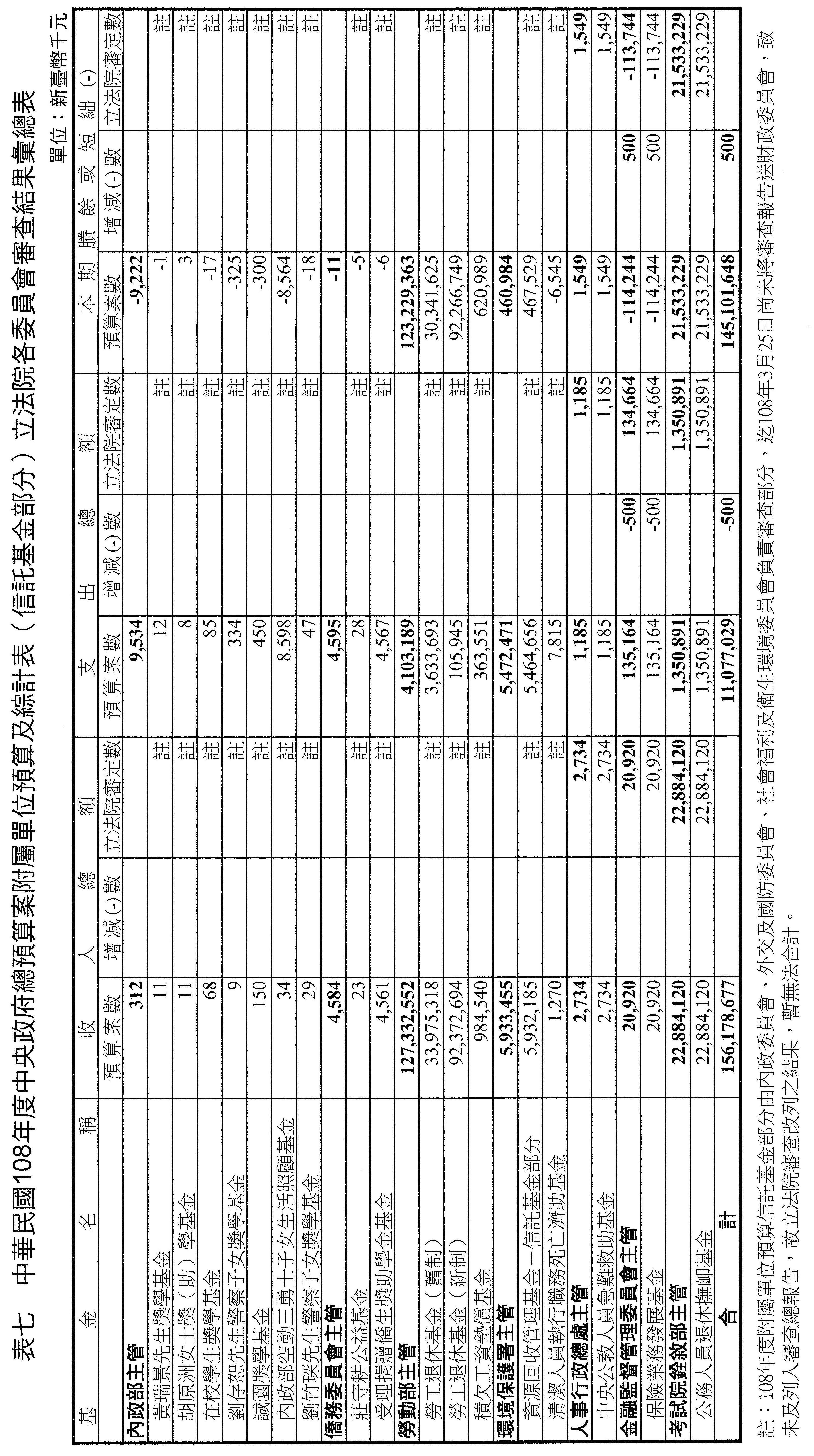 中華民國108年度中央政府總預算案附屬單位預算及綜計表非營業部分—信託基金項下,計有勞工退休基金(舊制)、勞工退休基金(新制)、積欠工資墊償基金、資源回收管理基金-信託基金部分、保險業務發展基金及公務人員退休撫卹基金等17個基金,共編列總收入1,561億7,867萬7千元,總支出110億7,702萬9千元,本期賸餘1,451億0,164萬8千元。審查結果,因內政委員會、外交及國防委員會、社會福利及衛生環境委員會負責審查之信託基金部分,迄108年3月25日尚未將審查報告送財政委員會,致未及列入審查總報告,爰審查結果減列總支出50萬元,增列本期賸餘50萬元(詳表七)。