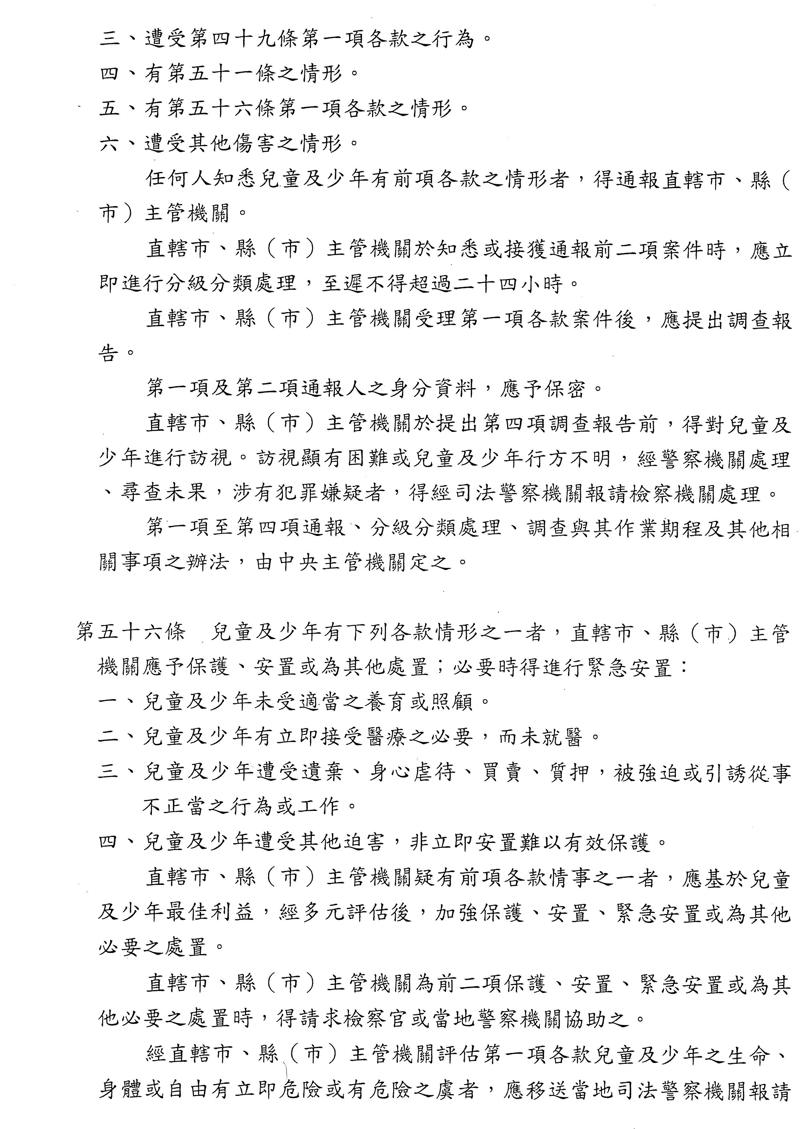 第五十三條 醫事人員、社會工作人員、教育人員、保育人員、教保服務人員、警察、司法人員、移民業務人員、戶政人員、村(里)幹事及其他執行兒童及少年福利業務人員,於執行業務時知悉兒童及少年有下列情形之一者,應立即向直轄市、縣(市)主管機關通報,至遲不得超過二十四小時: