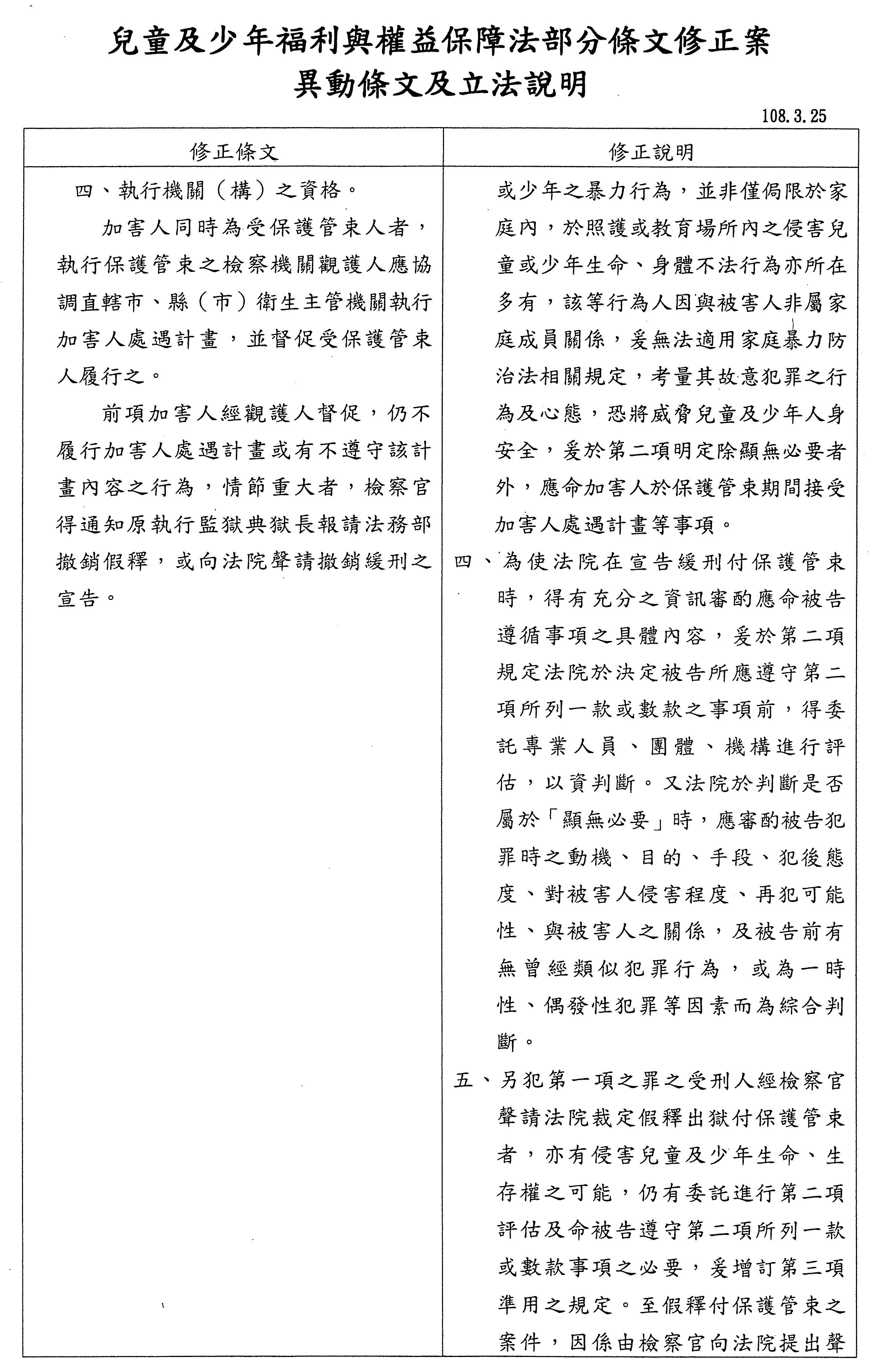 第五,有關第四項規定司法機關與加害人處遇計畫執行機關之間的聯繫與評估制度,這裡的司法機關指的是哪一個機關,這可能也要進一步在立法理由中加以說明。此外,關於處遇計畫執行機關,好像方才簡署長提及有增訂的部分,而我們依照原先的意見,如果處遇計畫的執行機關在聯繫與評估,這與加害人自己緩刑、假釋的宣告與撤銷有關,此時法院基於權力分立原則是審判機關,對於這樣一個參與處遇計畫的聯繫與評估制度規範的訂定,可能在角色定位上也必須遵守權力分立的原則。