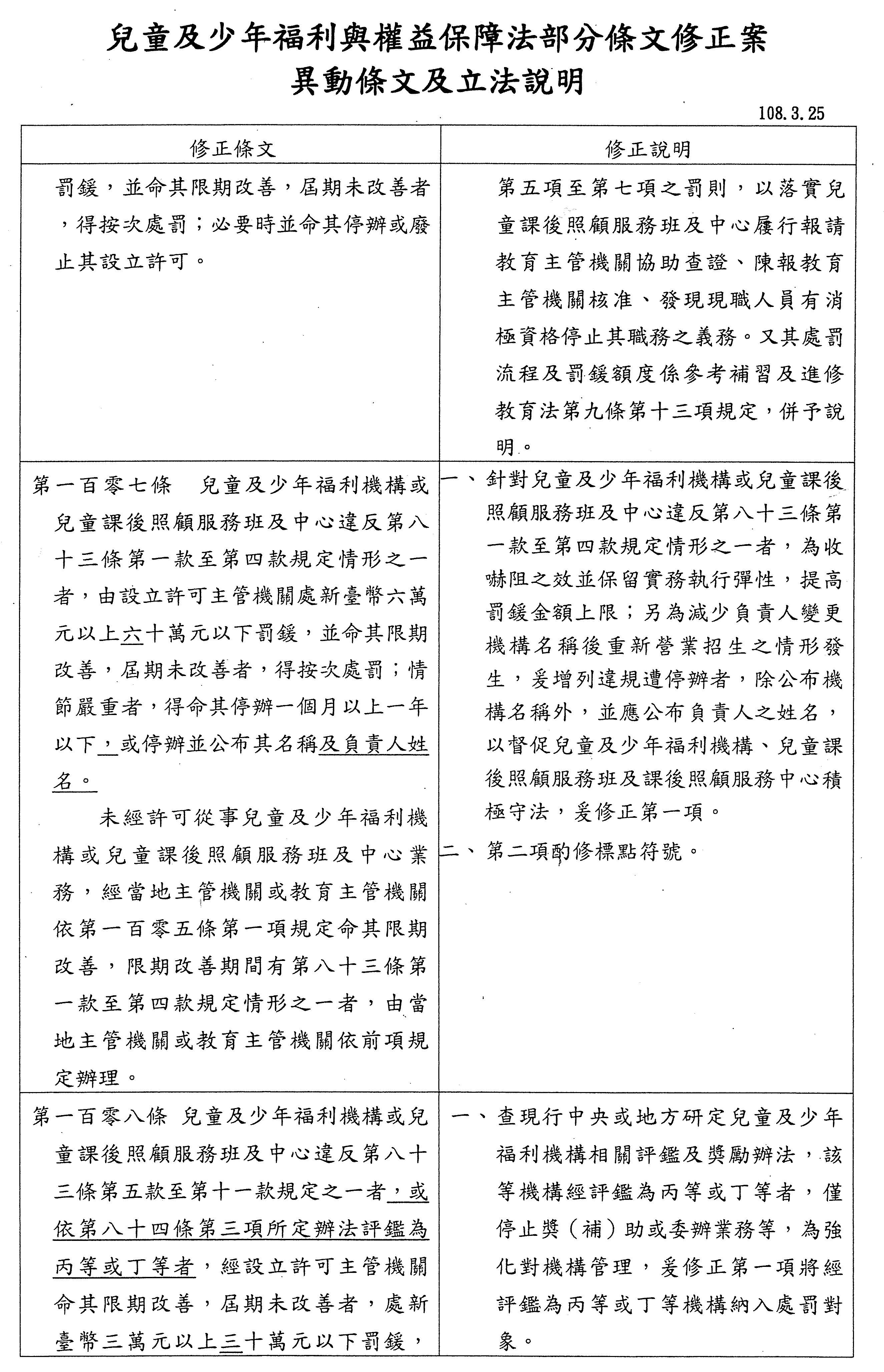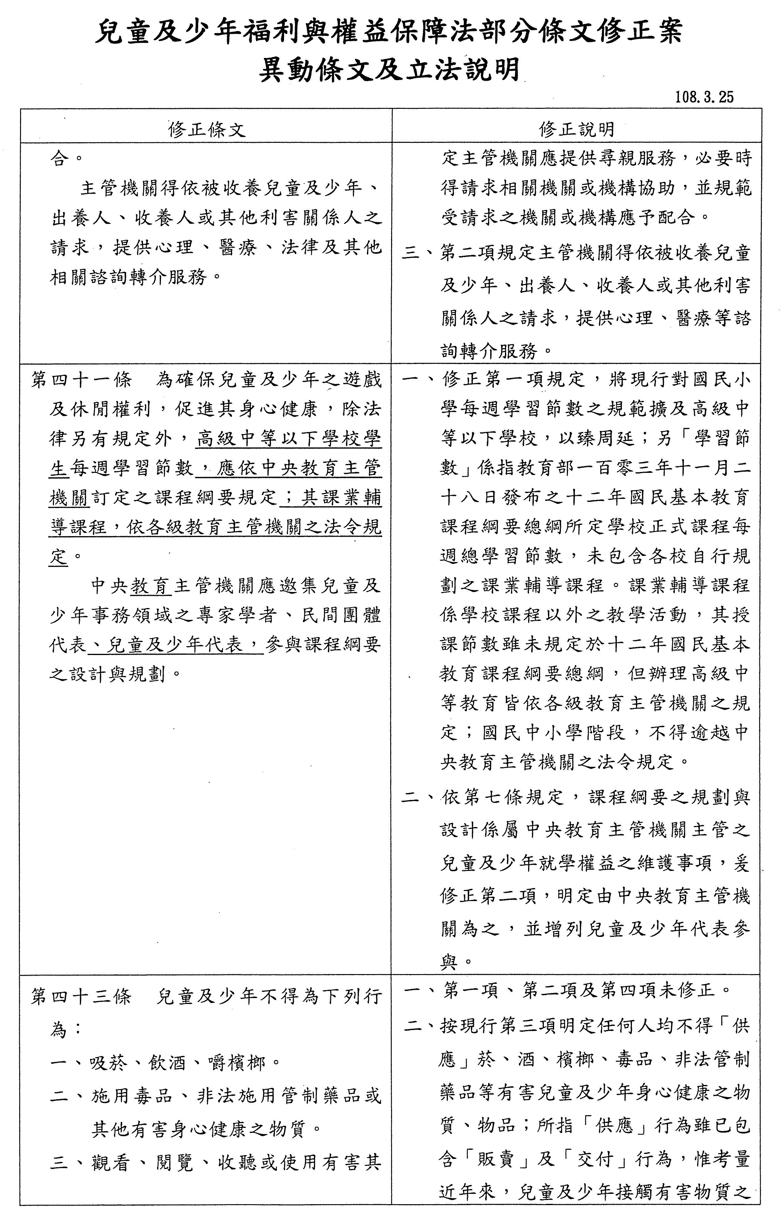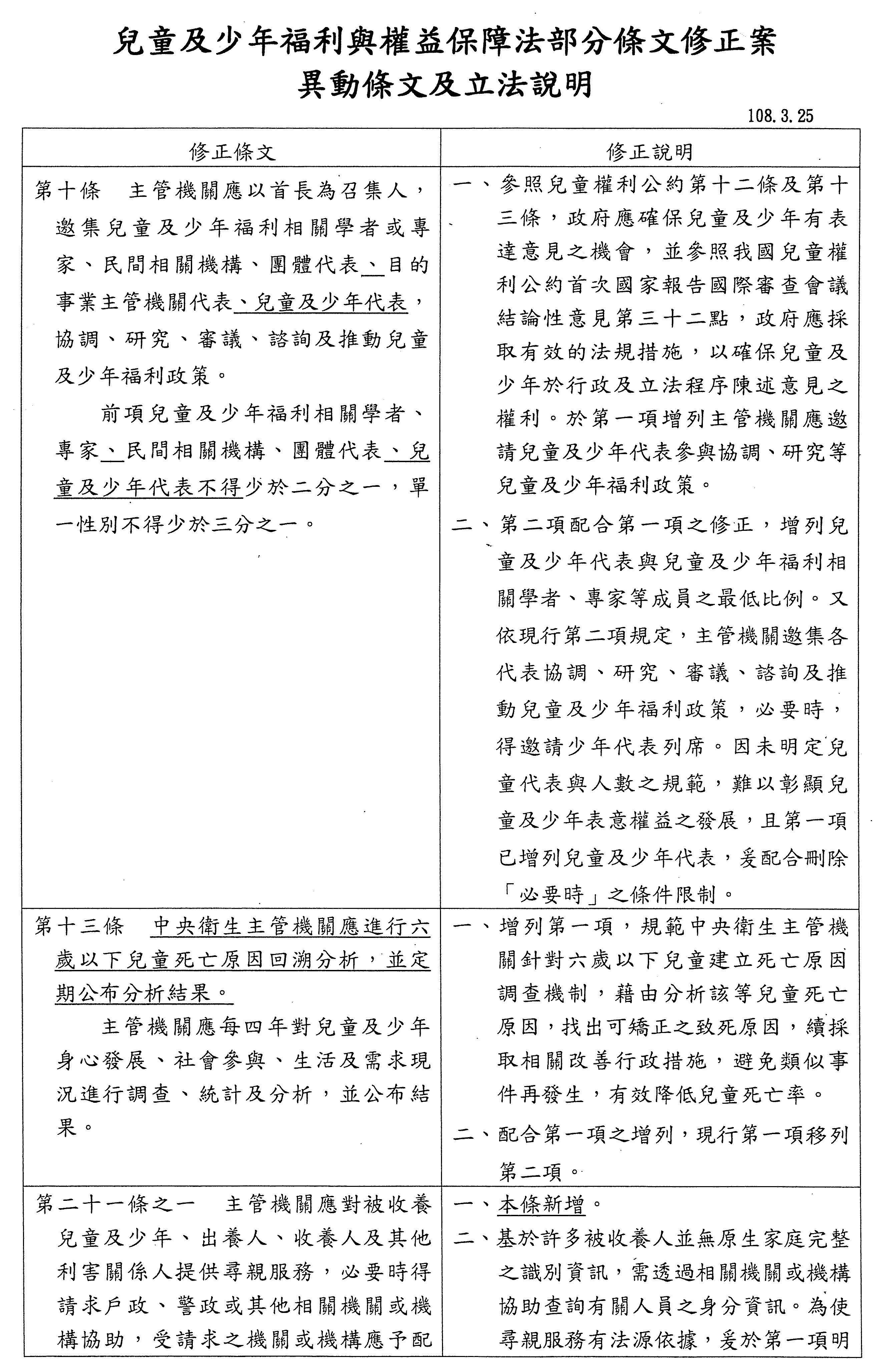 主席:現在開始針對「兒童及少年福利與權益保障法部分條文修正草案」進行協商。總計有48案,其中包括委員陳宜民等18人提案等計46案,除了委員李彥秀等3人所提修正動議第九十七條及一百十二條之一條文保留以外,行政院函請審議「兒童及少年福利與權益保障法部分條文修正草案」以及委員蔣萬安等16人擬具「兒童及少年福利與權益保障法第五十三條及第五十六條條文修正草案」經第6會期院會決定逕付二讀,現在我們與前述46案併案協商。