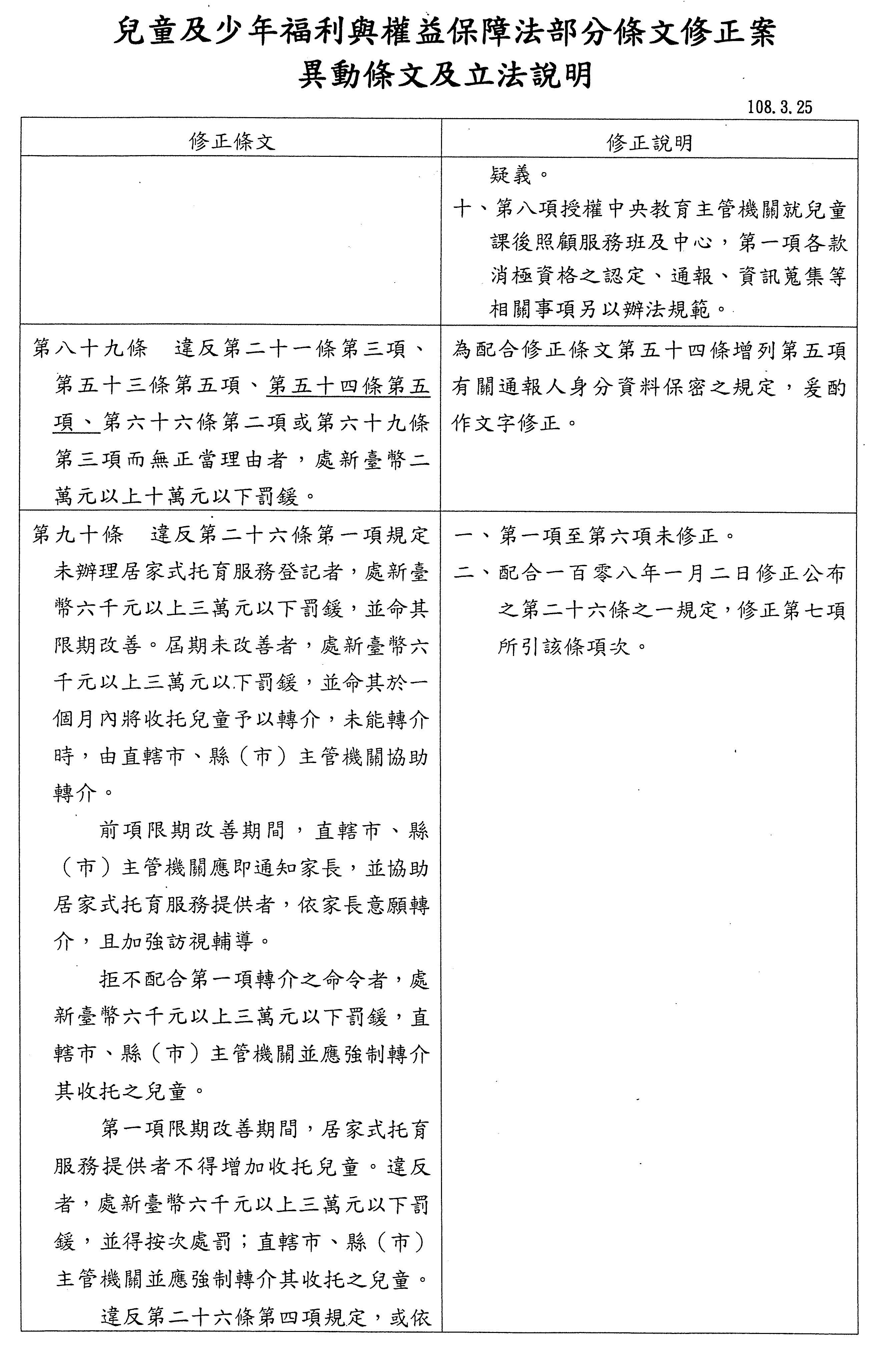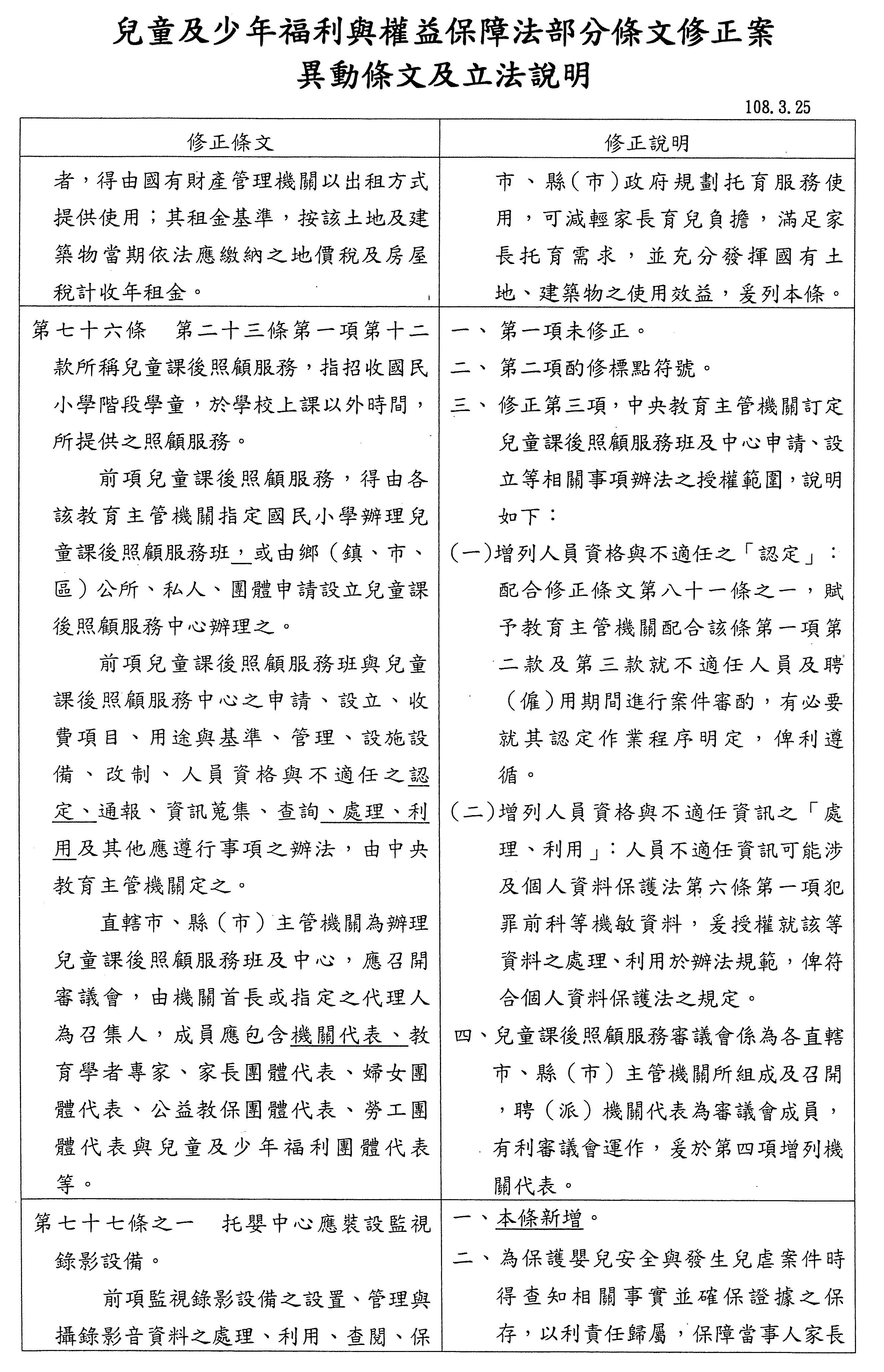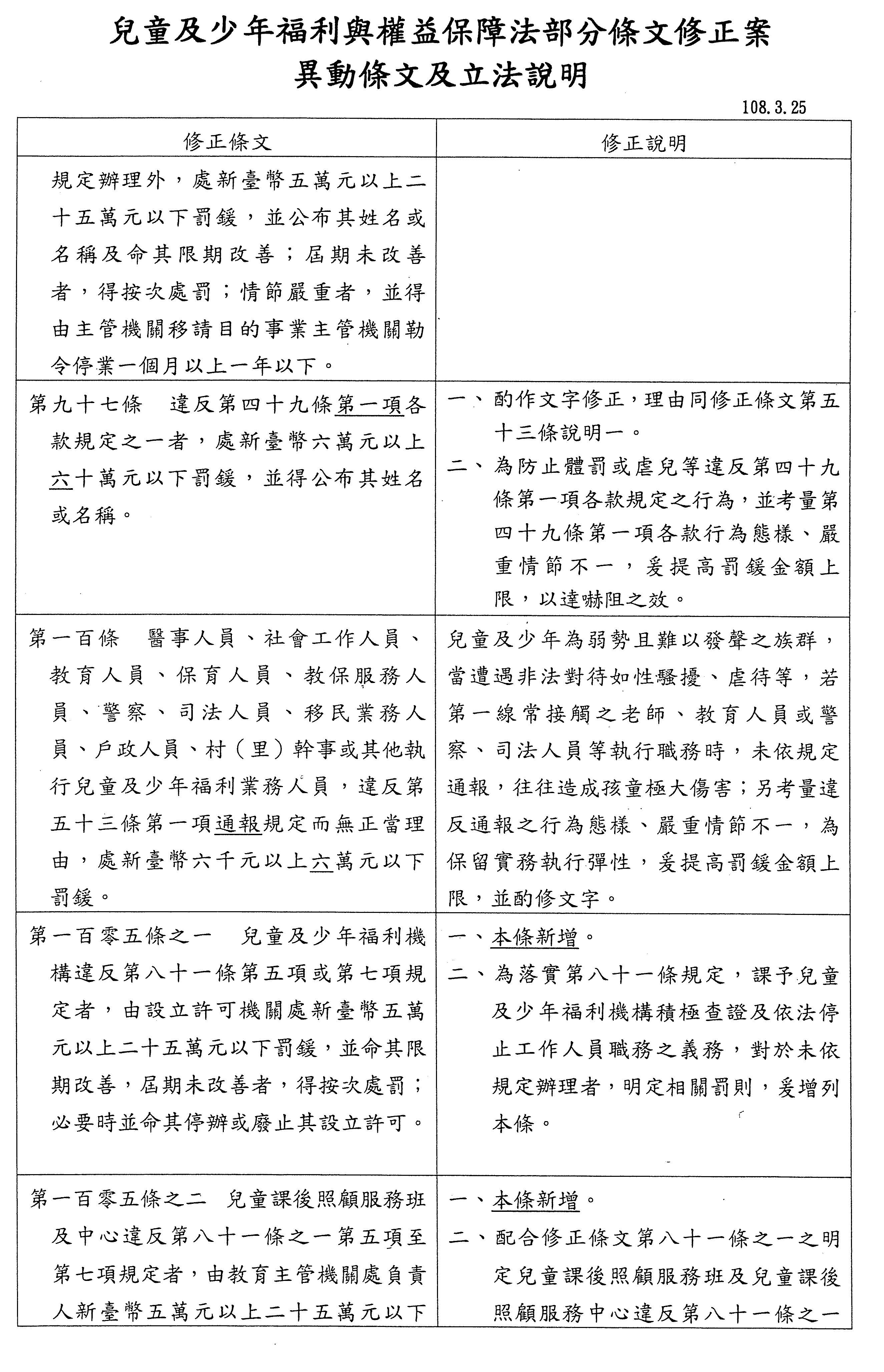 主席:現在開始針對「兒童及少年福利與權益保障法部分條文修正草案」進行協商。總計有48案,其中包括委員陳宜民等18人提案等計46案,除了委員李彥秀等3人所提修正動議第九十七條及一百十二條之一條文保留以外,行政院函請審議「兒童及少年福利與權益保障法部分條文修正草案」以及委員蔣萬安等16人擬具「兒童及少年福利與權益保障法第五十三條及第五十六條條文修正草案」經第6會期院會決定逕付二讀,現在我們與前述46案併案協商。