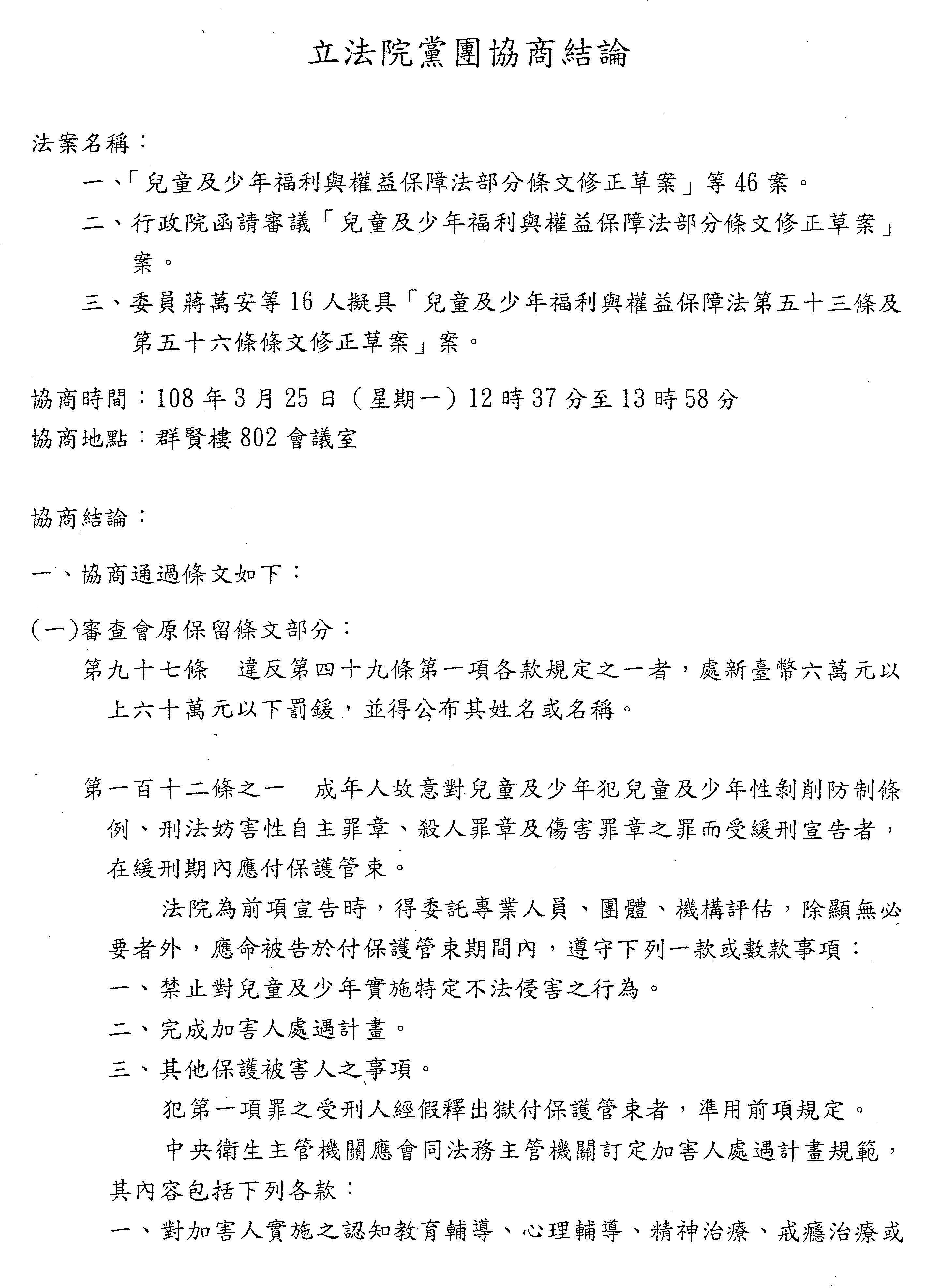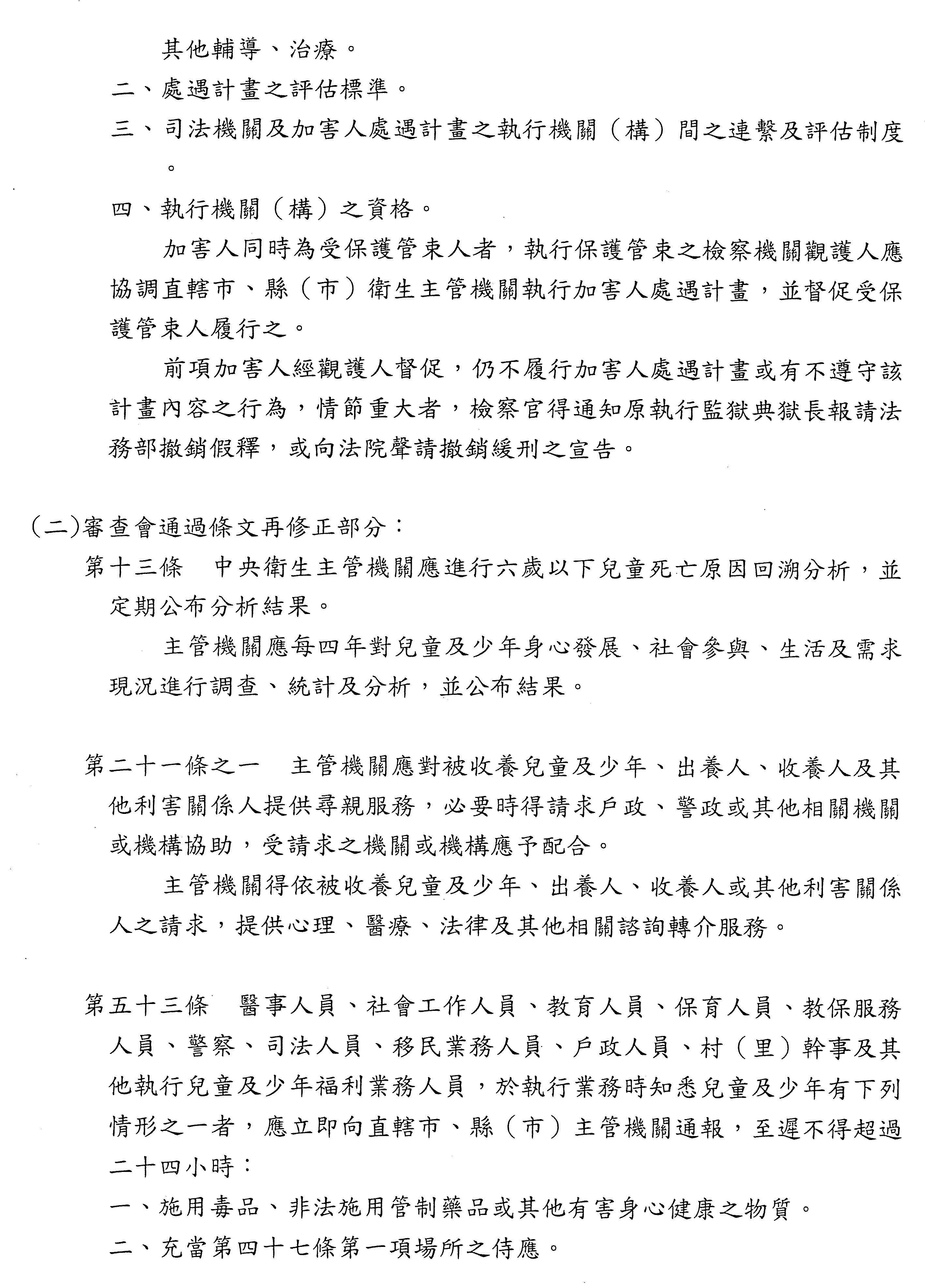 行政院函請審議「兒童及少年福利與權益保障法部分條文修正草案」等48案黨團協商結論:第十三條、第二十一條之一、第五十三條、第五十六條、第九十七條、第一百十二條之一照協商條文通過,其餘均照審查會審查結果通過,並新增附帶決議一項,有關立法說明會附在協商結論後面。
