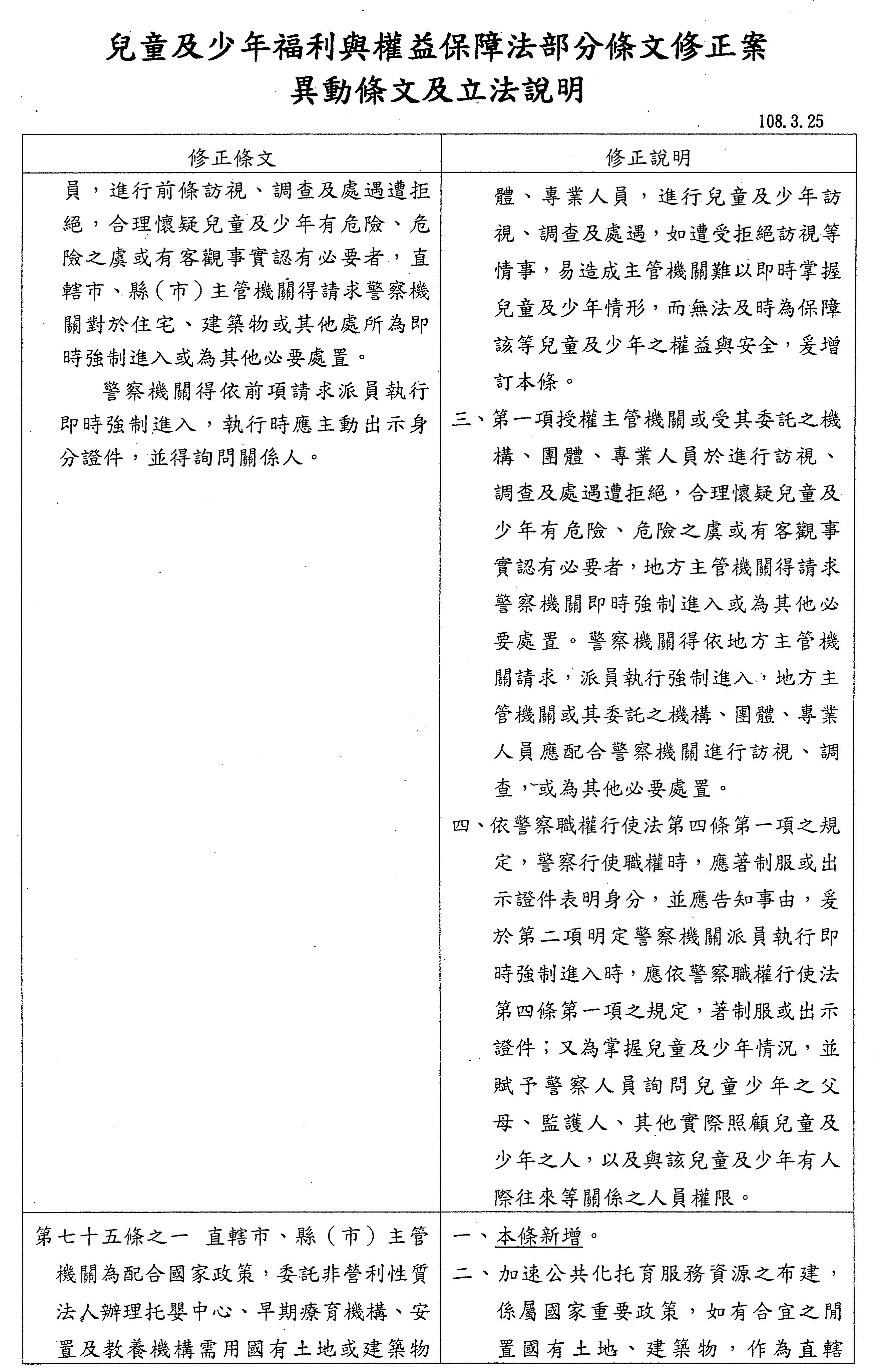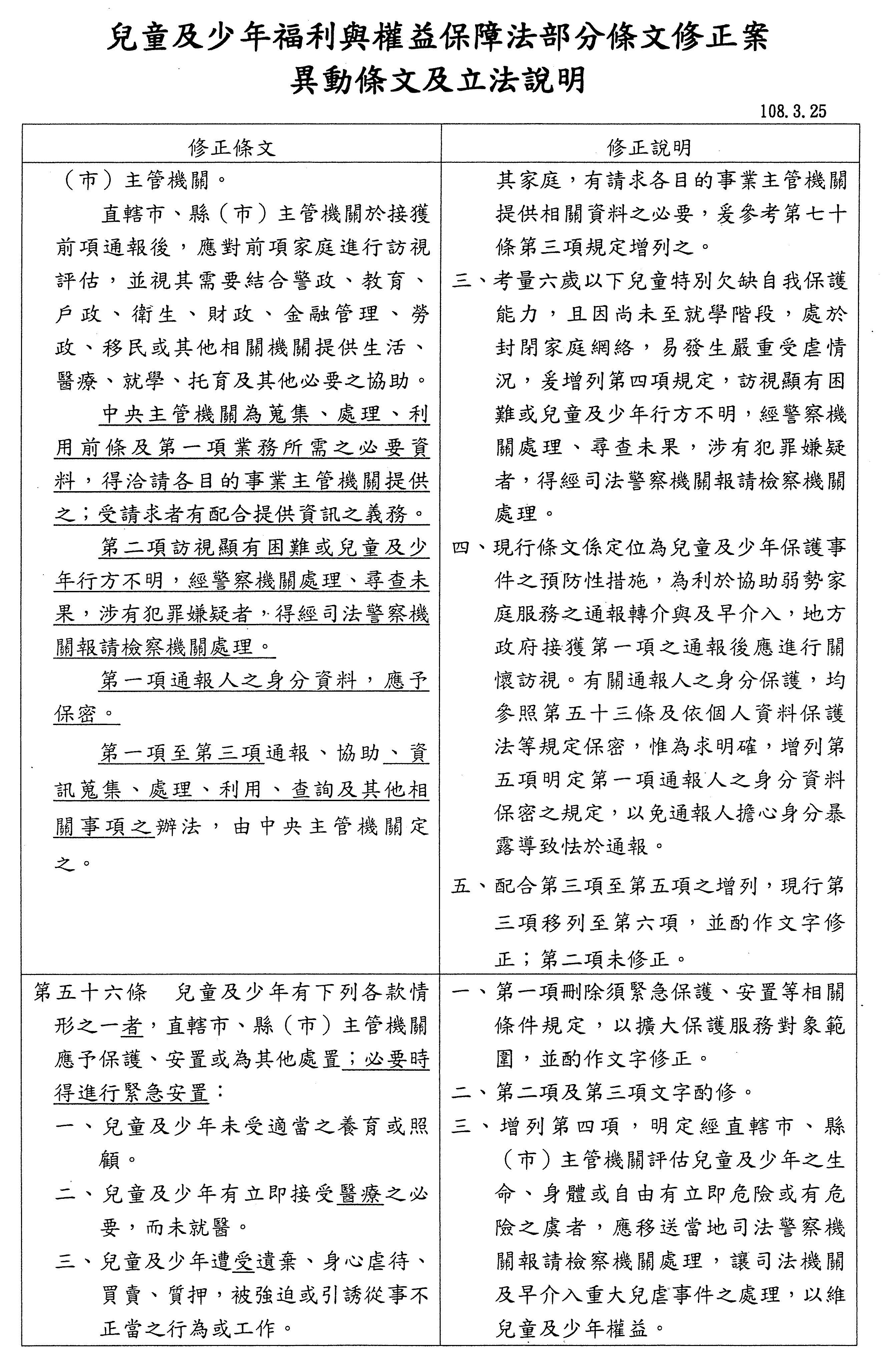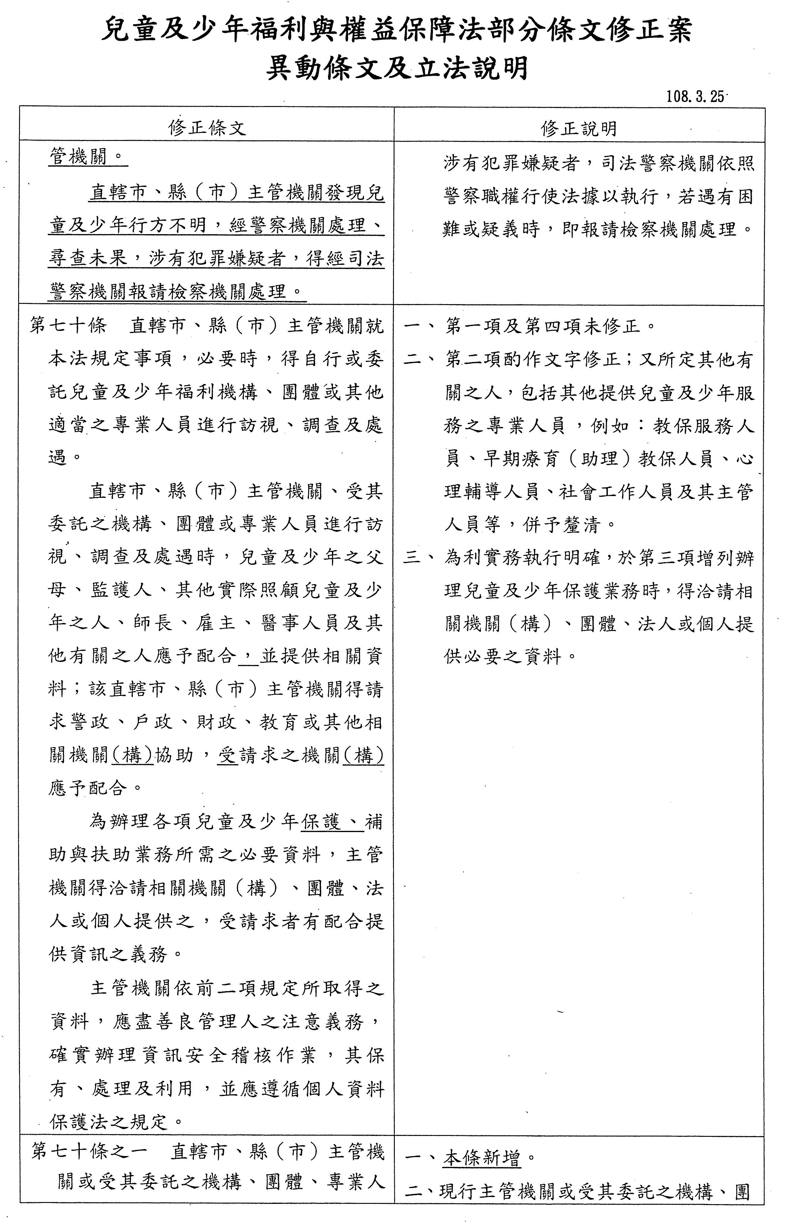 蔣委員萬安:我當然支持明文規定在這裡,可是我要說這個文字在刑事訴訟法已經有,這裡只是重複再規定一次,司法警察機關本來就有這個權力,這不是增加的權力,當然你說要在兒少權利保障法再規定一次,我當然支持,只是這個實益在哪裡?不然,折衷啦!我希望在理由欄更詳細說明這樣規定真正要解決的問題是在通報上或連繫上……