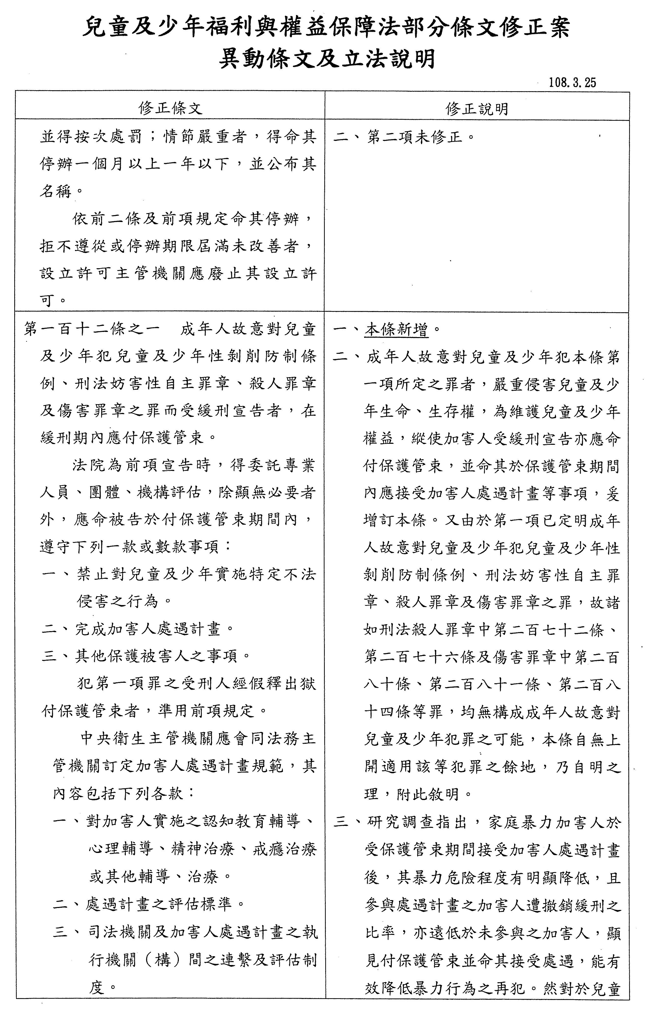 簡署長慧娟:我唸一下第一百十二條之一修正後的文字,第一項是規定:「成年人故意對兒童及少年犯兒童及少年性剝削防制條例、刑法妨害性自主罪章、殺人罪章及傷害罪章之罪而受緩刑宣告者,在緩刑期內應付保護管束。」;第二項前段規定:「法院為前項宣告時,得委託專業人員、團體、機構評估,除顯無必要者外,應命被告於付保護管束期間內,遵守下列一款或數款事項:」,其餘文字都一樣。