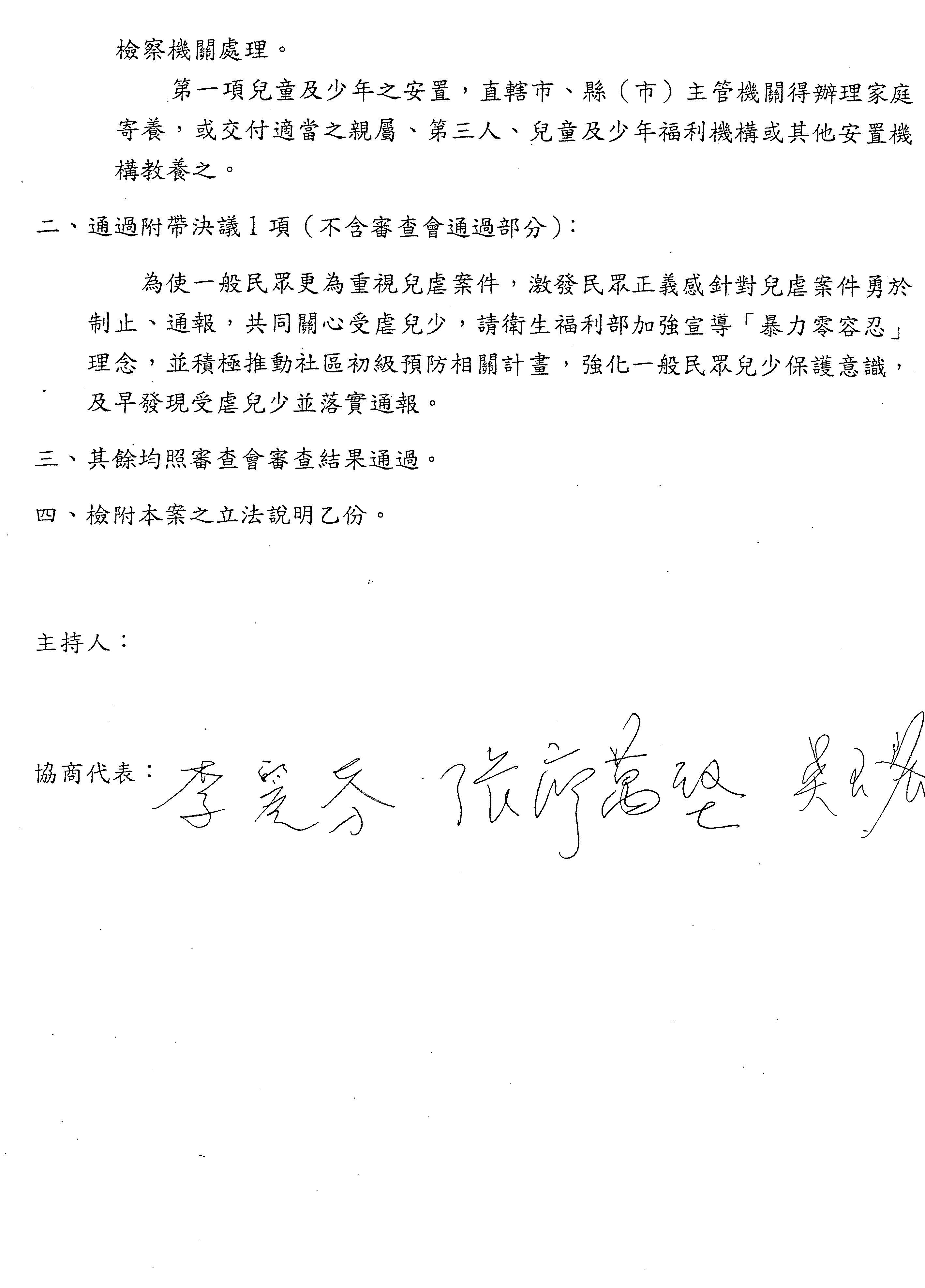 蔣委員萬安:所以我的意思是說,衛福部你不要想得這麼簡單,你們定了下去法務部未來就會全盤接受,就算你們不收集證據或證據不充分,他們就可以主動報請檢察官去聲請,但檢察官還是照現行一樣的門檻喔!要涉有犯罪嫌疑他們才會主動去處理喔!所以沒有你想像的真的可以達到你們的目的,我要提醒的是這一點啦!除非法務部可以在這邊承諾,或是在說明欄裡面講清楚,未來社工人員不用有這種蒐集證據的能力,你們就會主動進入去處理。因為照你們的文字,我是看不出來,你們可以推說照現行刑事訴訟法,仍然要涉有犯罪嫌疑才會去偵辦及處理。就是條文定下去並不是真的像衛福部講的可以解決你們現行的困難,就是所謂斷線的問題。我不堅持我的版本,我知道現行整個法律體系的規定,但是未來執行面,我要提醒,今天我們討論的是兒虐的問題,如果未來還是有這樣斷線的問題,是哪一個部會要負責?