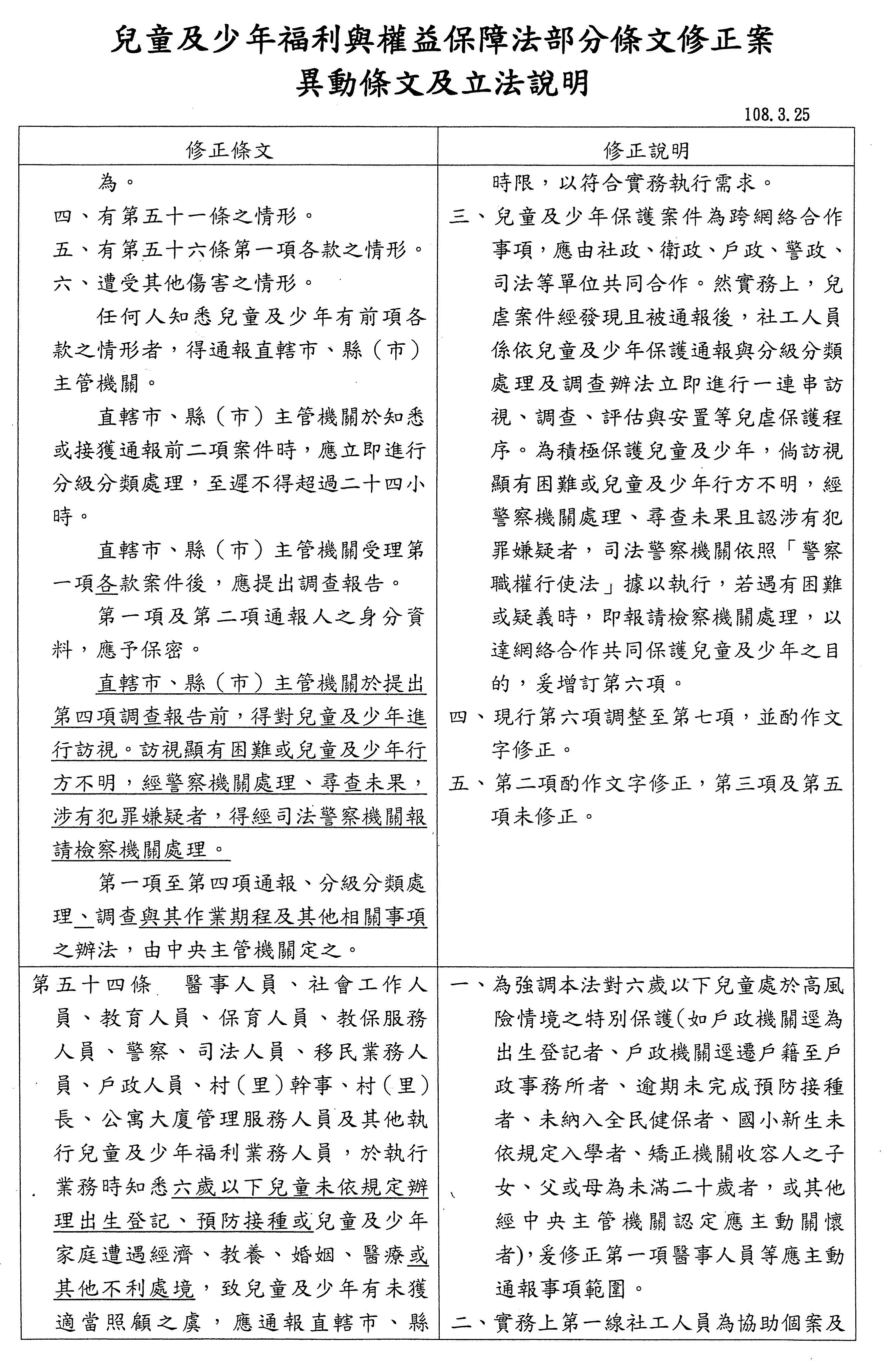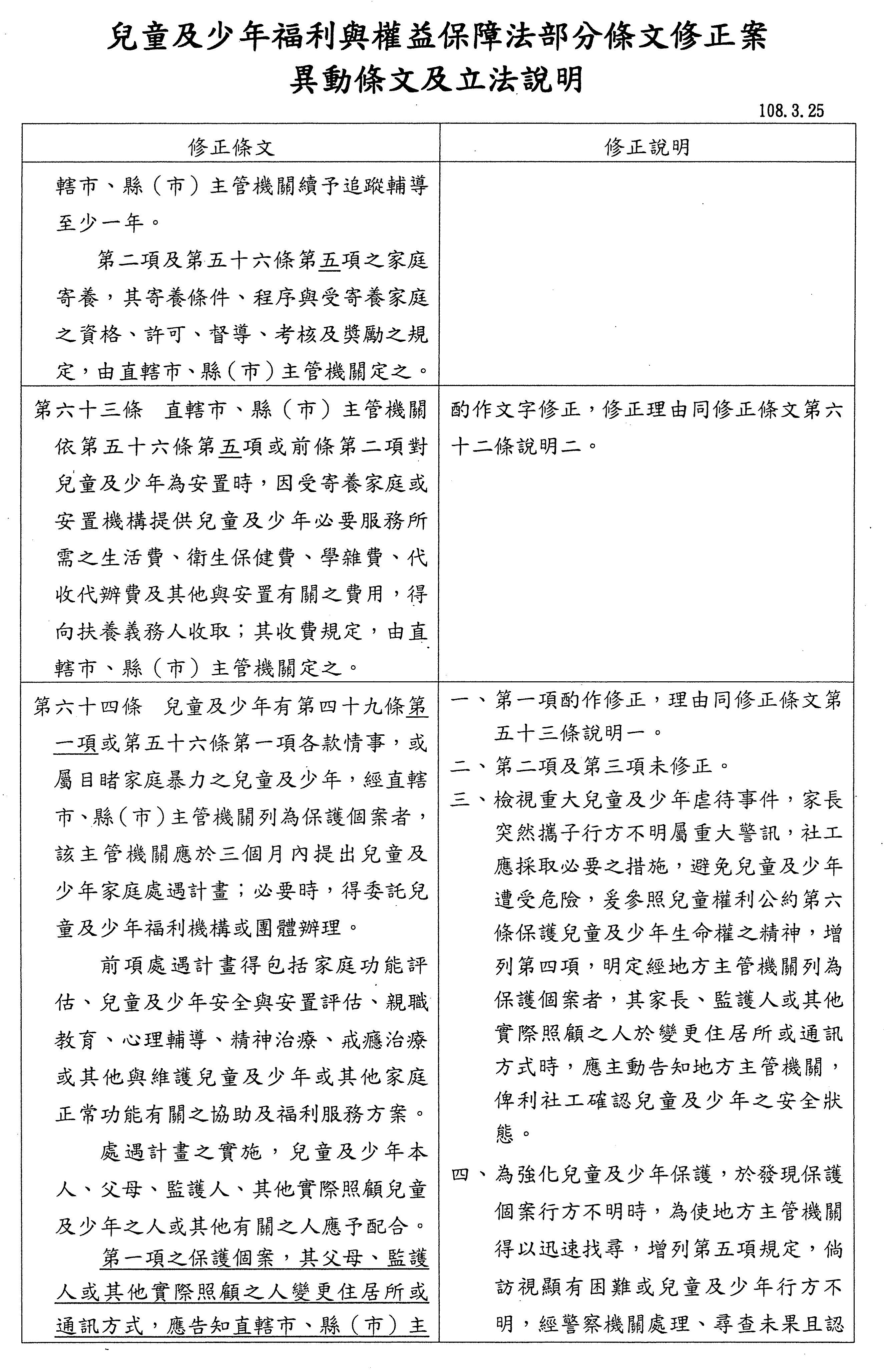 吳委員玉琴:我想這次兒少權法修法的很大突破也在於第五十三條、第五十四條及第六十四條,這些都有提到協尋找不到、訪視找不到人時,如何銜接警政和檢察系統,過去社工很為難的就在這裡,找很久也找不到,報警也找不到,找不到就沒有了,永遠就是找不到孩子,所以這個部分是我覺得這次修法非常重要的關鍵,就是連結衛政、警政和檢察系統,這不會是修法通過之後就完全連結,所以我也能理解蔣委員的擔心,因為實務操作面還是要檢警和衛福部一起好好串起更細緻的辦法或相關的SOP,如果這些串不起,大家永遠就是依法行政。這些是過去沒有的文字,現在好不容易落入這些法條,而且不只這一條有,其他條文也有。