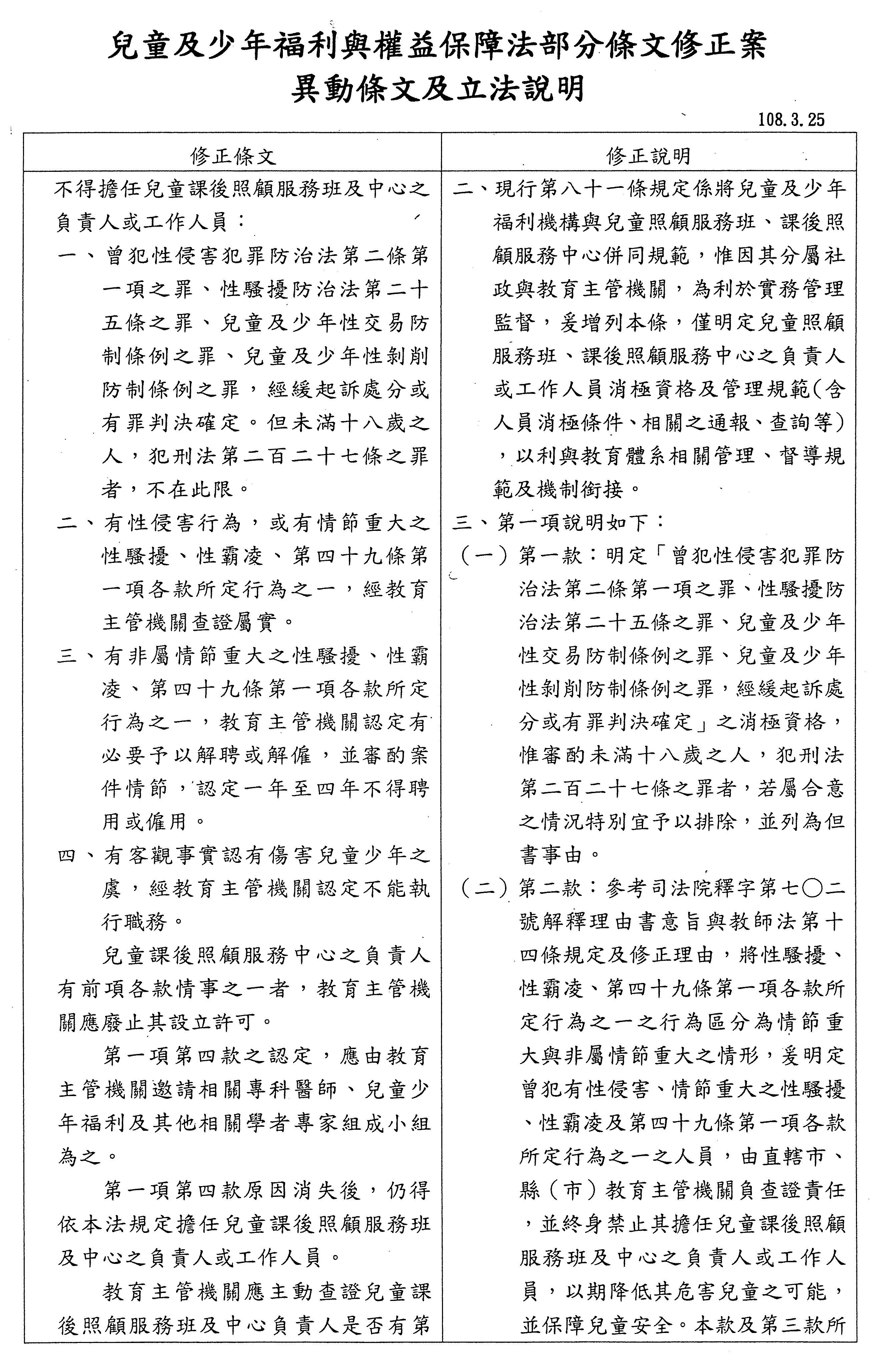 簡署長慧娟:我們想請教司法院,是否可能在立法說明裡面去說明?因為這基本上是成年人故意對兒童及少年的犯罪,在本質上是不會改變的,如果在立法說明裡面去講清楚,是否就可以解除這樣的疑慮?