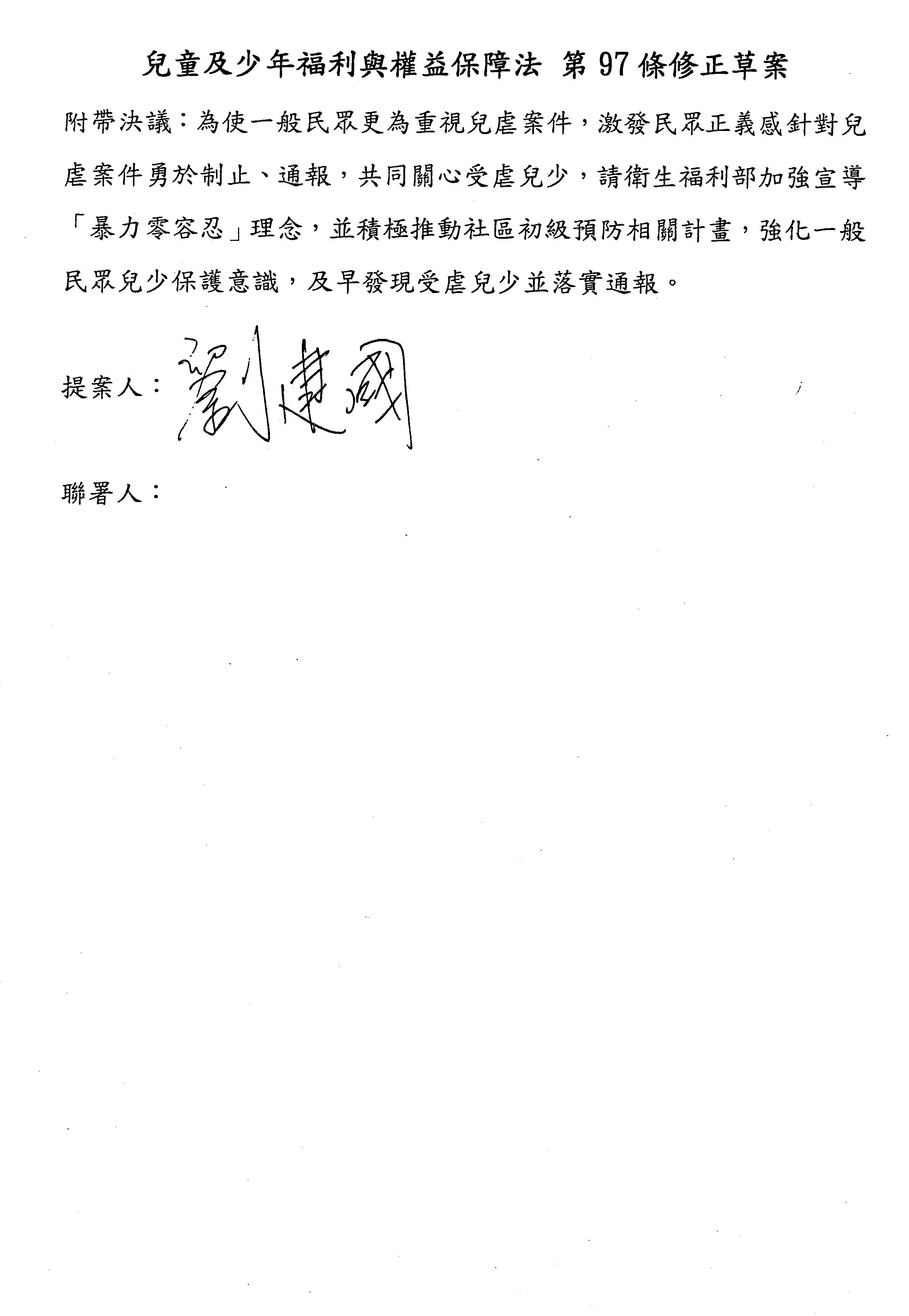 林司長維言:報告主席及各位委員,針對第九十七條,劉委員建國建議的修正條文,在上週由社家署簡署長及本人親赴劉建國委員辦公室協調,他同意我們提出說帖與附帶決議的文字,我們已經將相關資料都送到委員辦公室。換言之,這部分就依照原來的文字,就不再修正,並建議我們提供一個附帶決議與說帖。