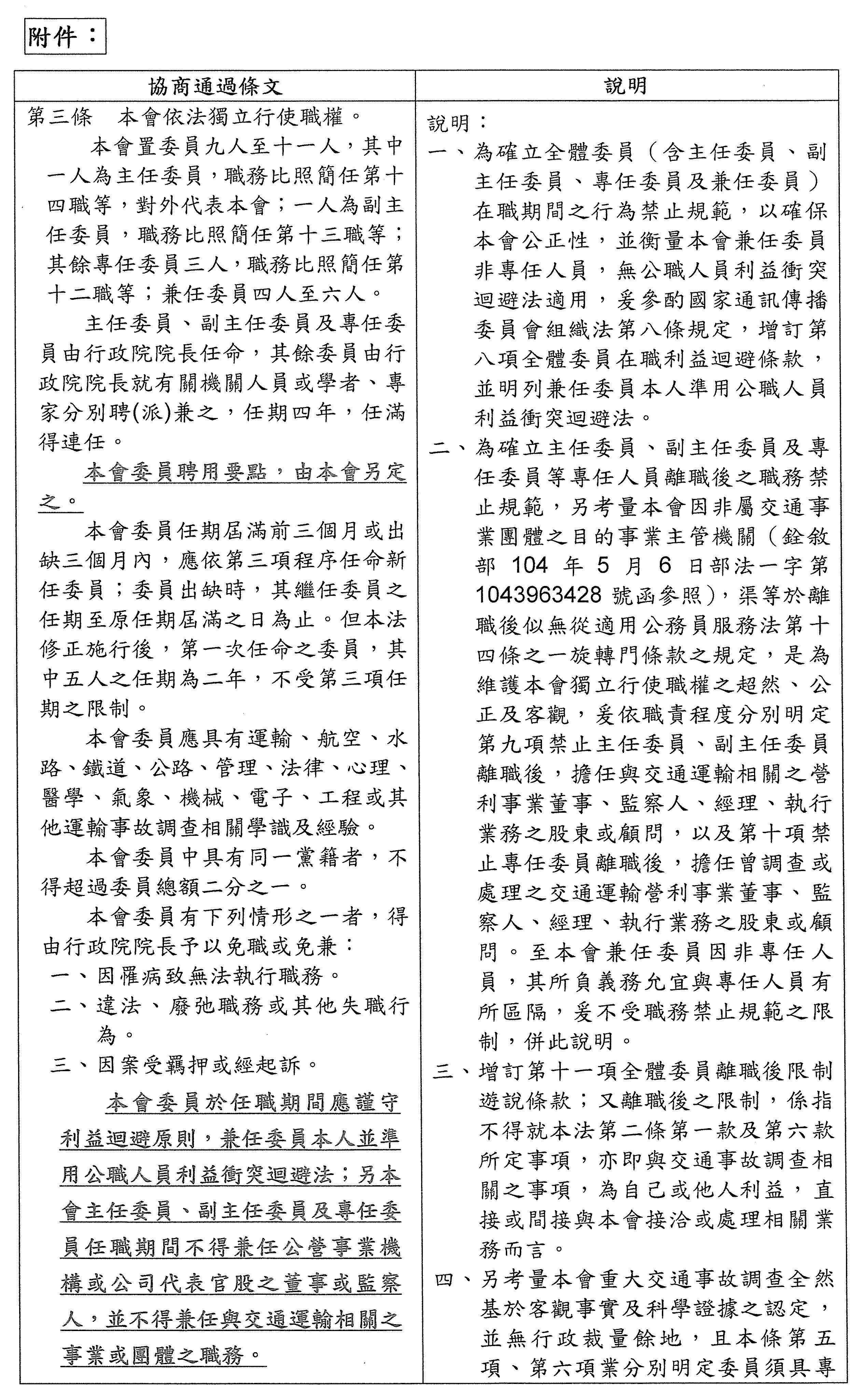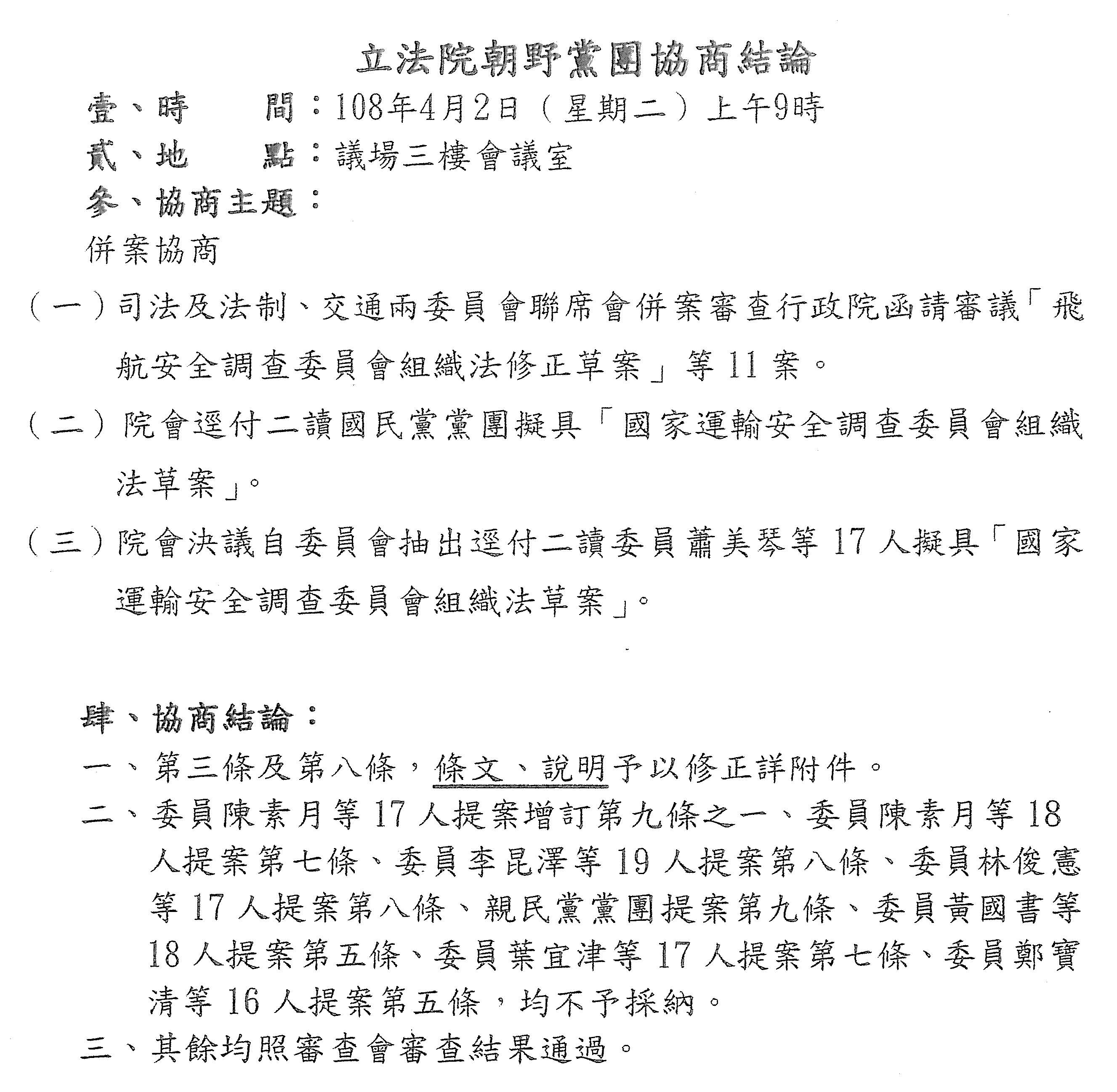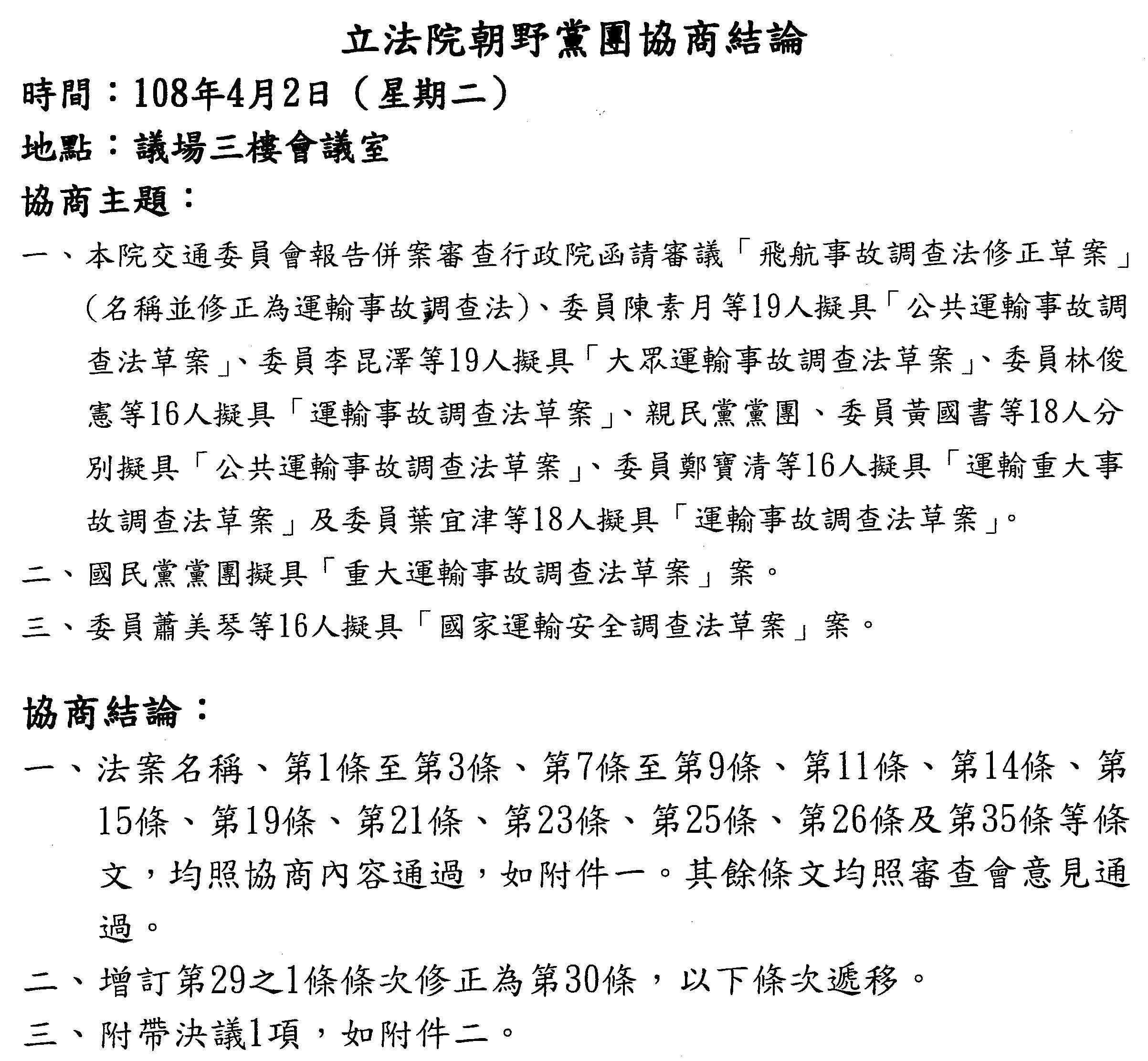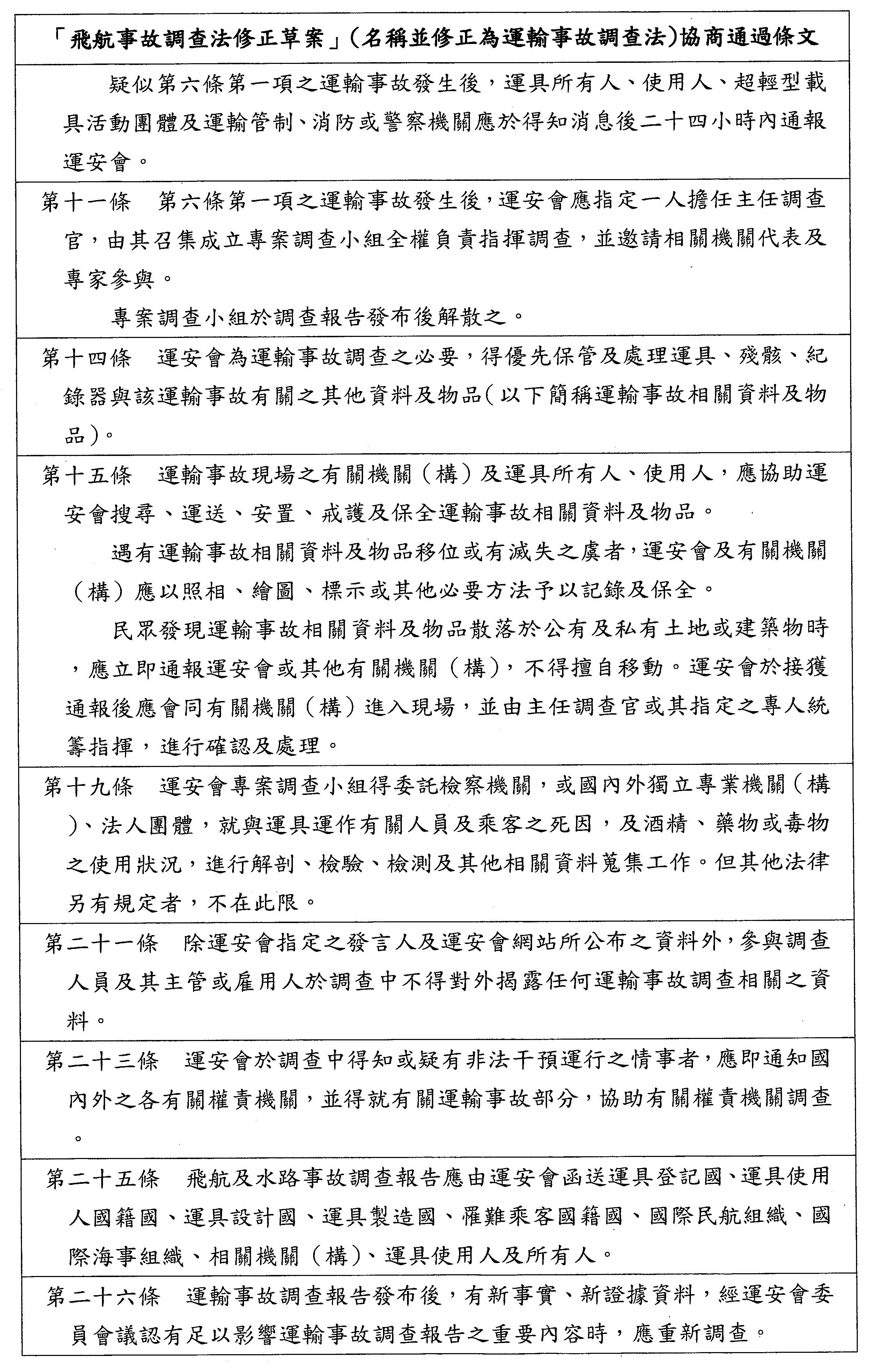 繼續針對「運輸事故調查法修正草案」討論,該草案協商版本……