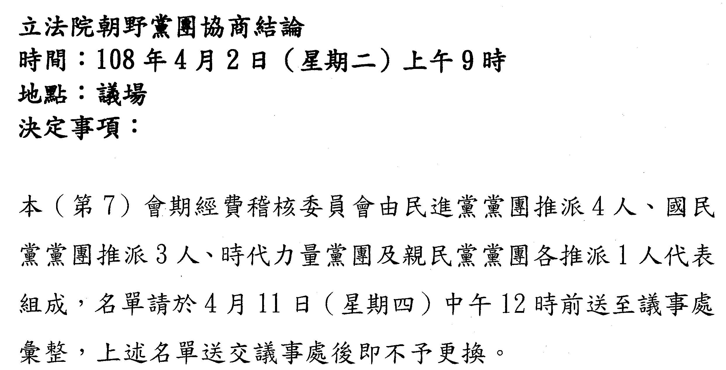 本(第7)會期經費稽核委員會由民進黨黨團推派4人、國民黨黨團推派3人、時代力量黨團及親民黨黨團各推派1人代表組成,名單請於4月11日(星期四)中午12時前送至議事處彙整,上述名單送交議事處後即不予更換。