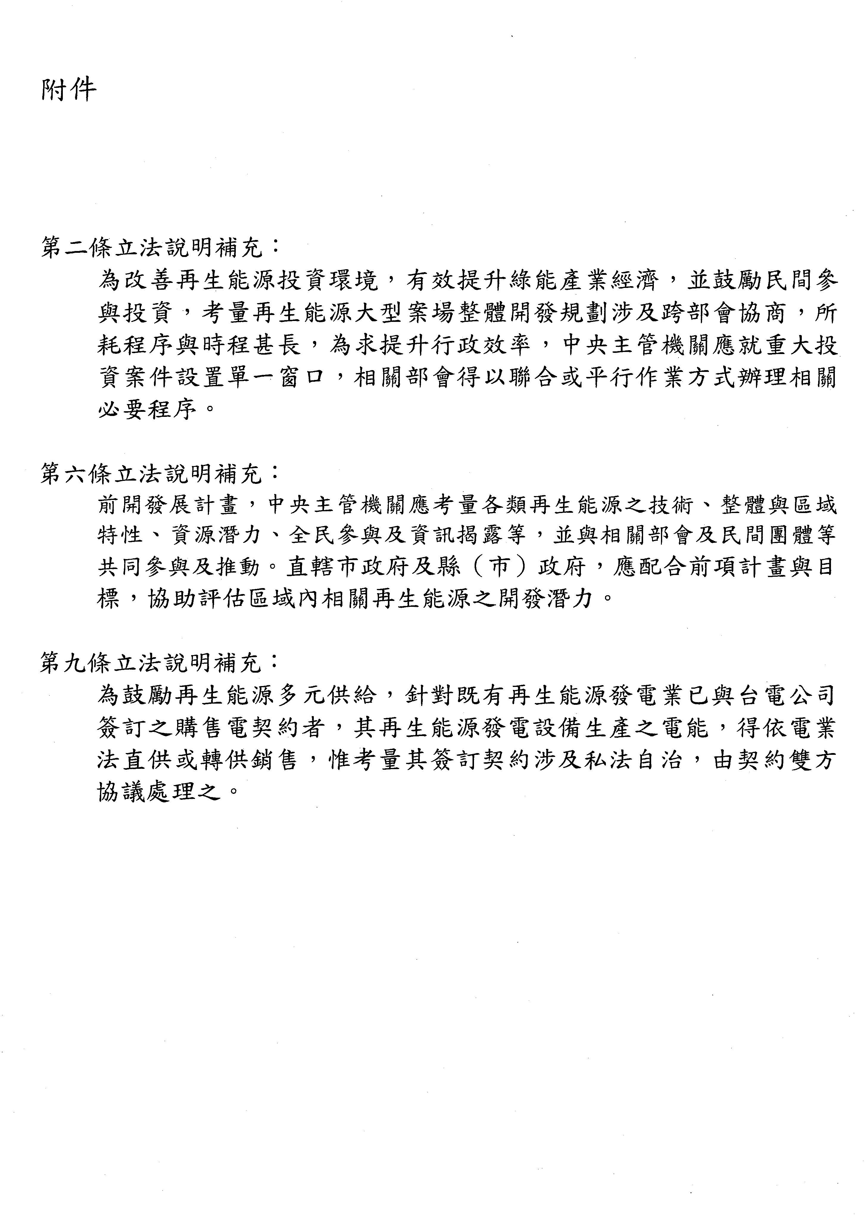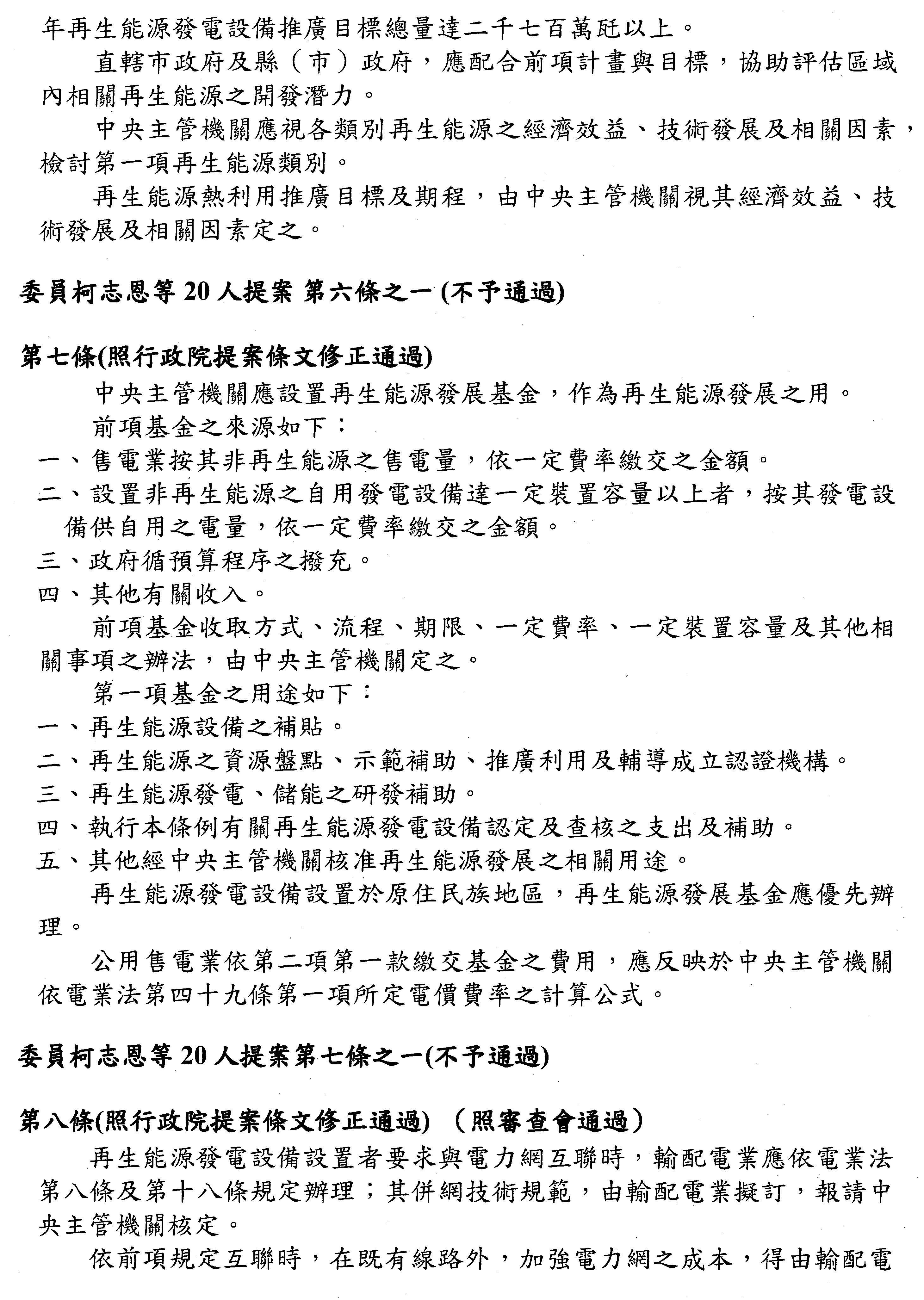 陳組長崇憲:我說明一下第七條的附帶決議,內容如下:「為充裕再生能源發電設備業者資金,中央主管機關得以再生能源發展基金,協調相關政府機關(構)、金融機構、信用保證機構,建立再生能源產業投資、融資與信用保證機制,以協助各經營階段之再生能源產業取得所需資金。另為明確再生能源繳交基金之費用,台電公司應於電力帳單標示再生能源附加費用。」