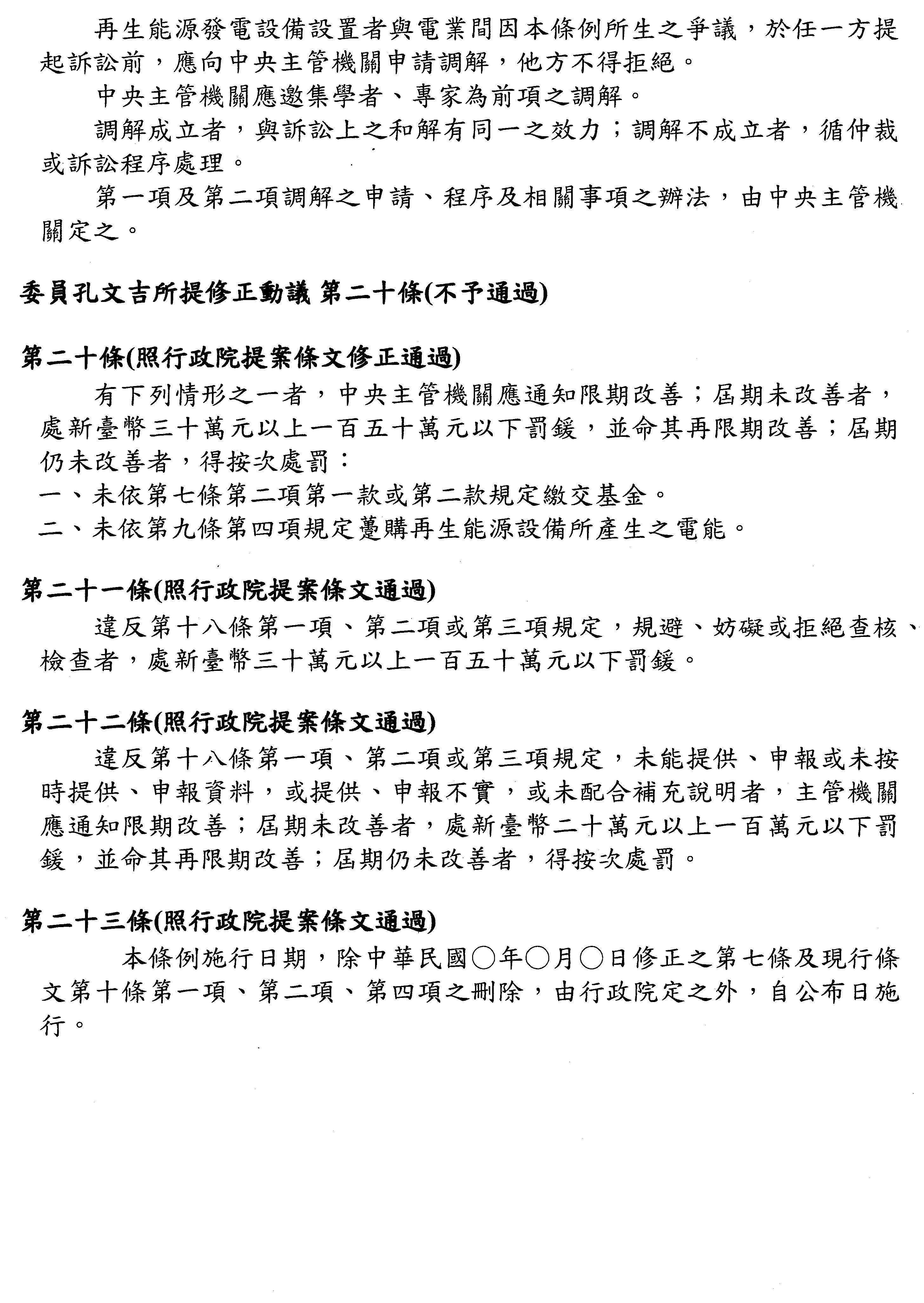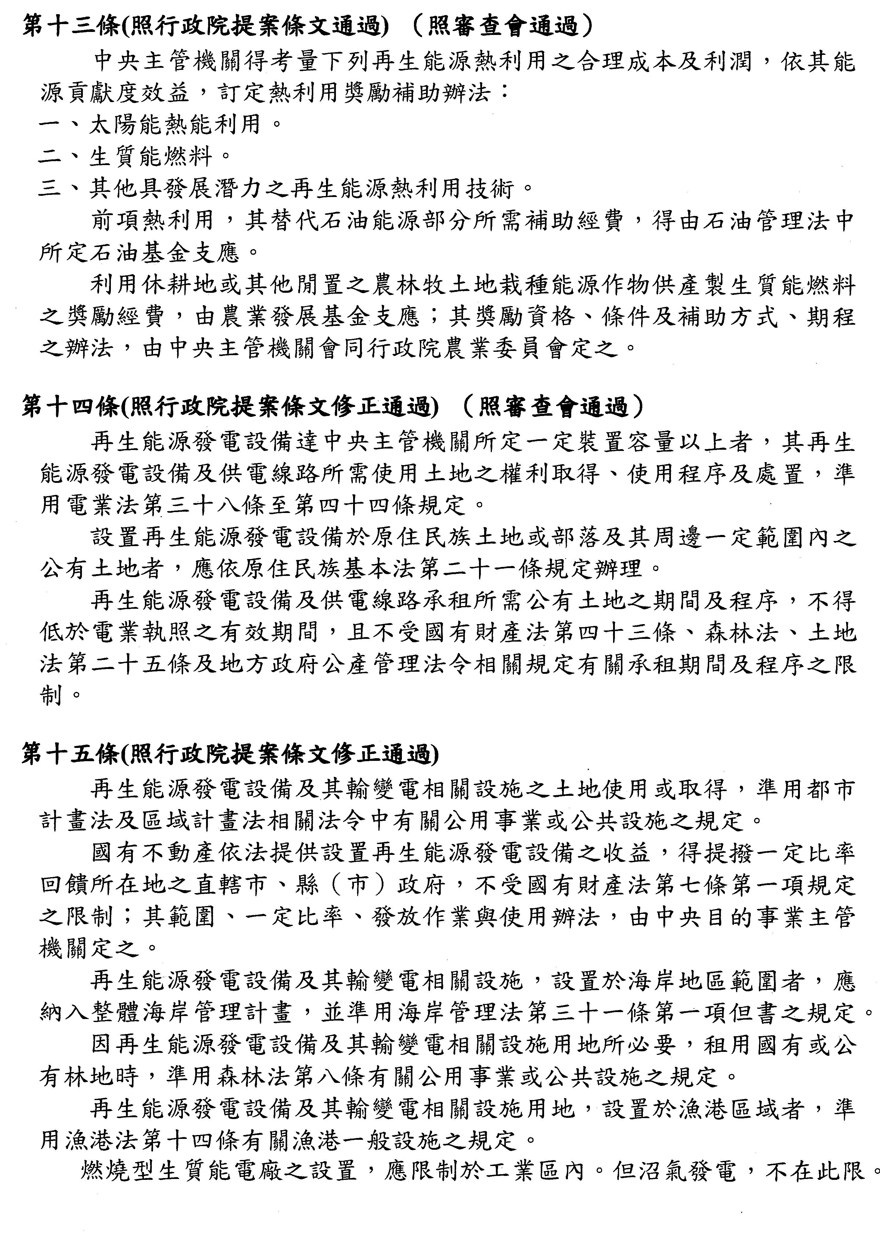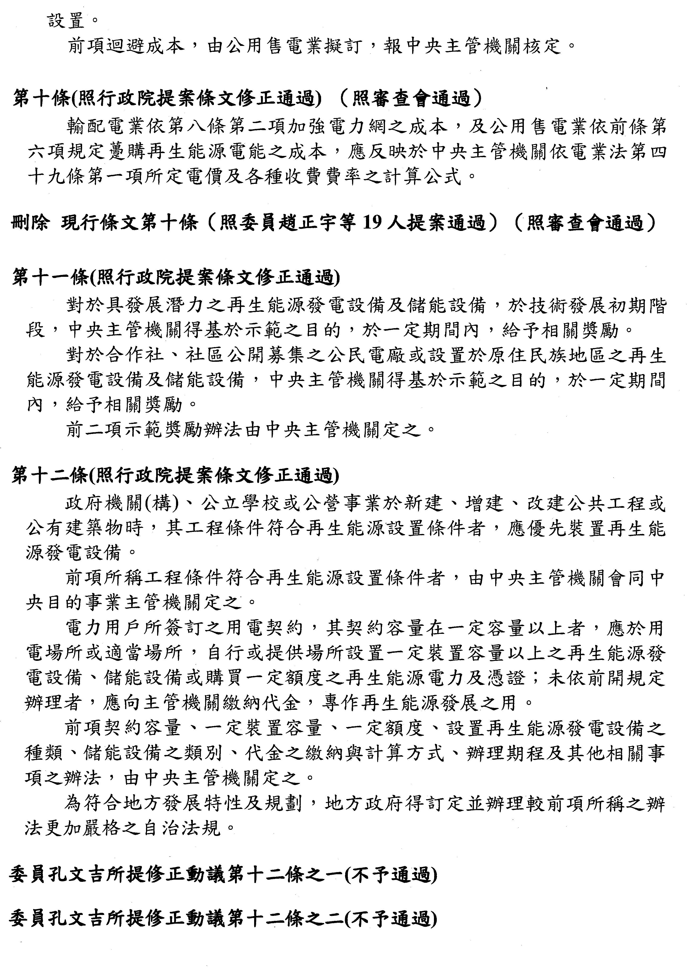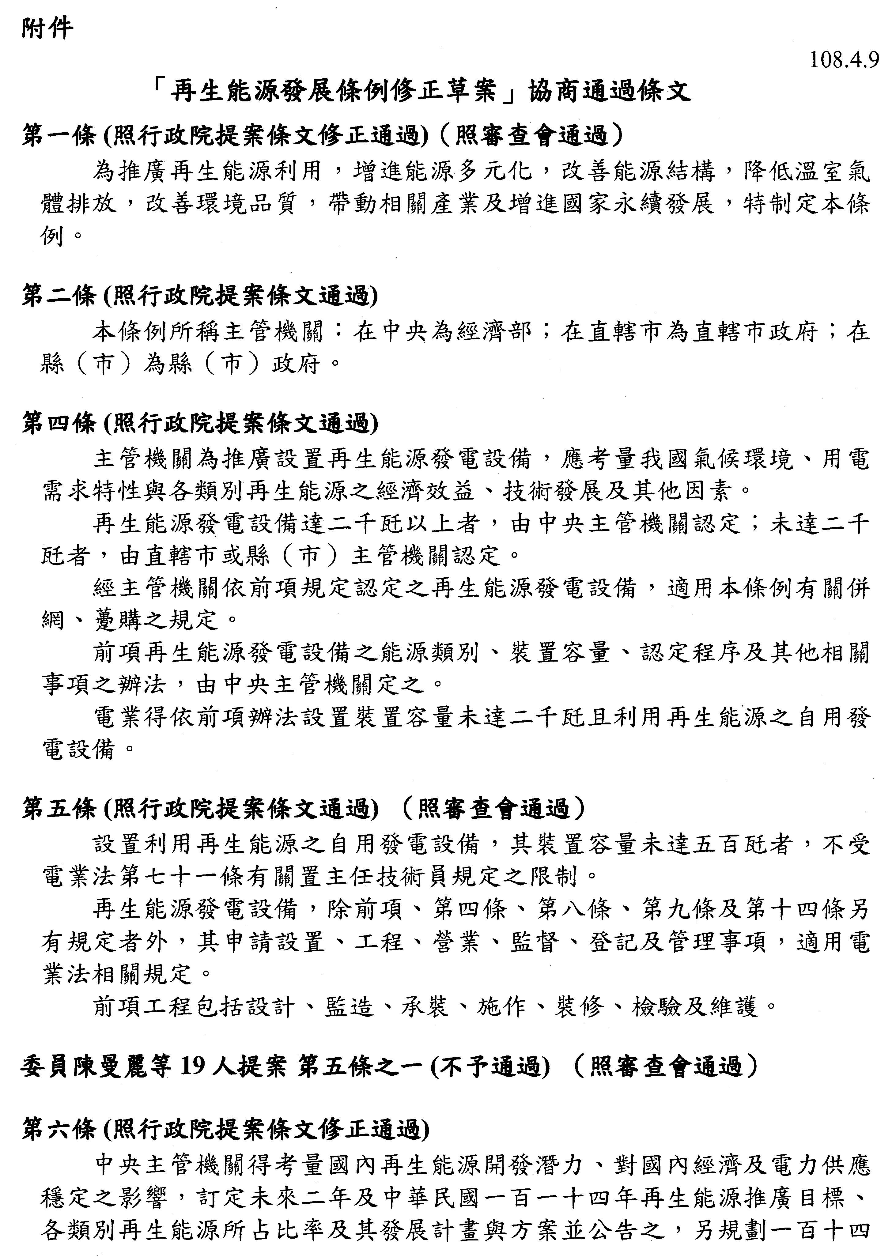 主席:再生能源發展條例修正草案協商結果,保留3條條文送院會處理,其餘均照協商結論處理。