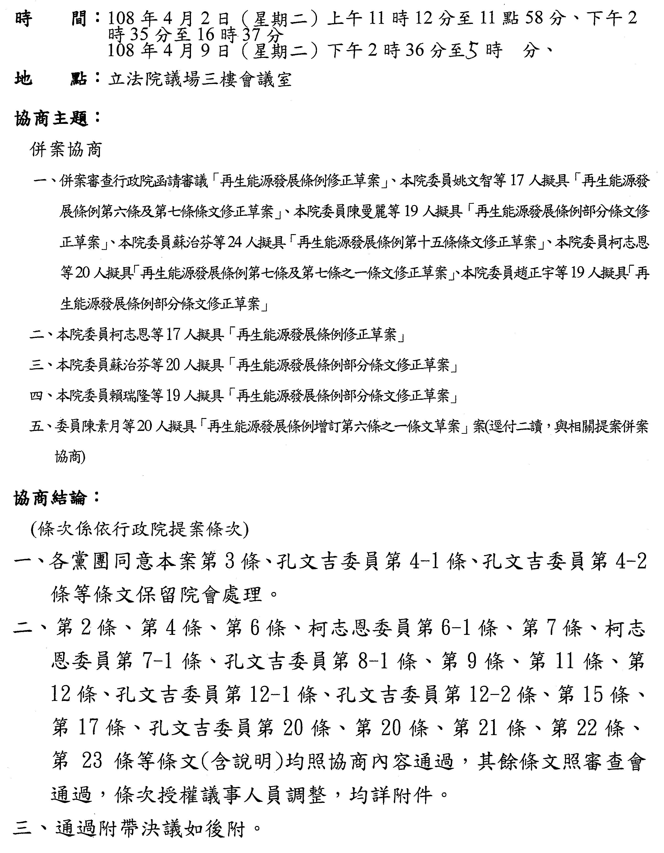 協商主題 繼續研商「再生能源發展條例修正草案」、「政府採購法部分條文修正草案」、「跟蹤騷擾防制法草案」、「國家機密保護法」等案相關事宜。
