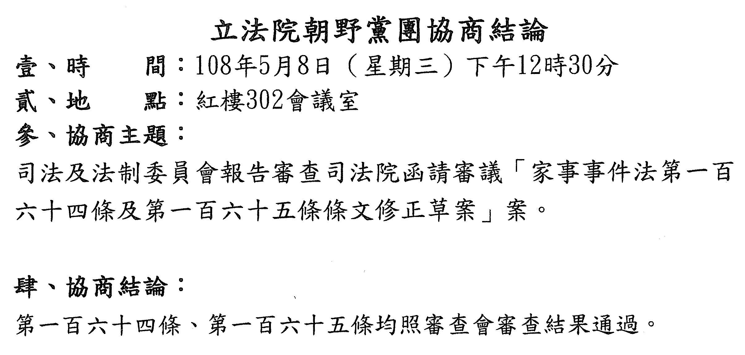 協商司法及法制委員會報告併案審查行政院、司法院函請審議「民法部分條文修正草案」案及委員吳玉琴等20人擬具「民法親屬編增訂部分條文草案」案,以上2案前於108年3月20日經司法及法制委員會併案審查完竣,計通過第三節節名及10條條文,並決議院會討論前須交由黨團協商,現在進行協商。