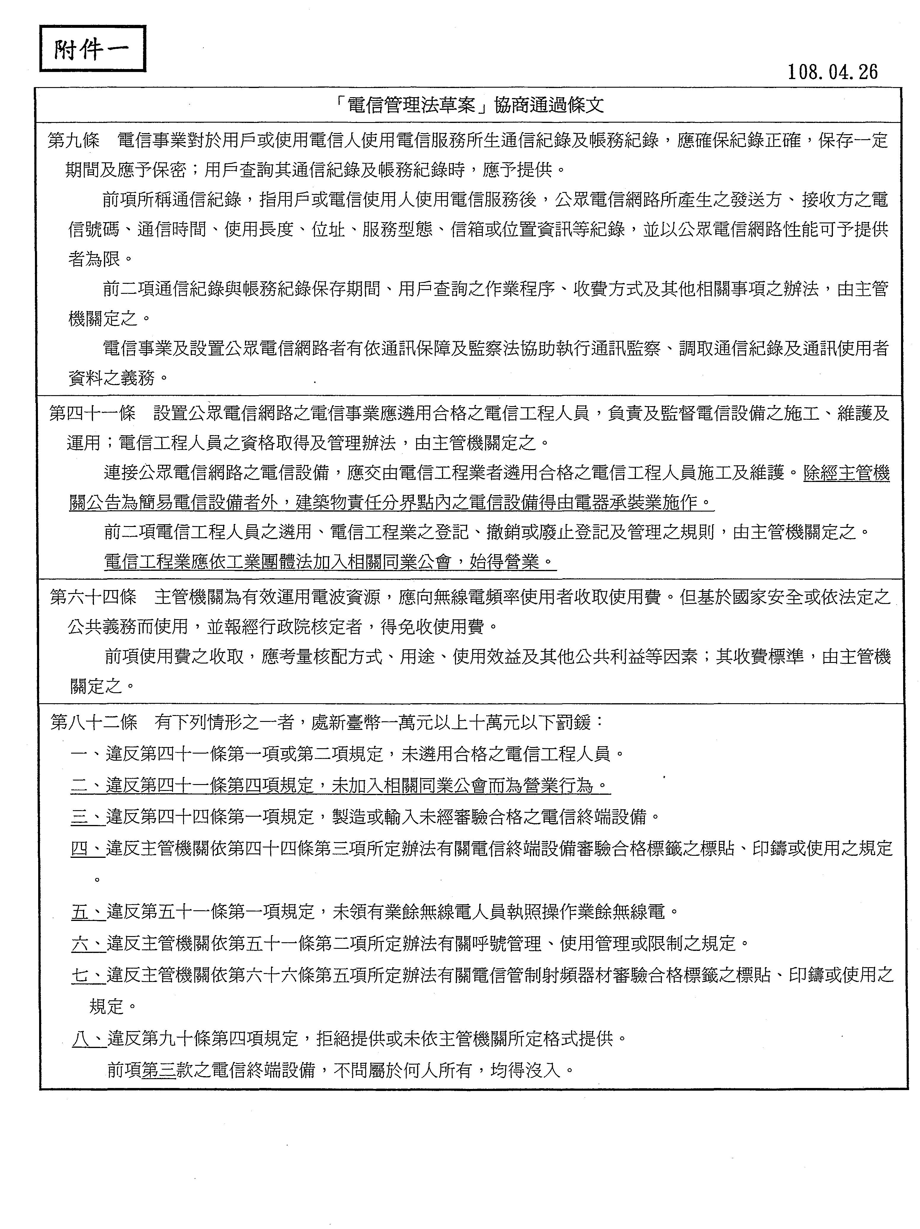 併案審查行政院函請審議「電信管理法草案」、委員鄭寶清等16人擬具「電信管理法草案」、委員許毓仁等16人擬具「電信管理法草案」、委員徐榛蔚等16人擬具「電信管理法草案」、委員周陳秀霞等22人擬具「電信管理法草案」、委員陳明文等25人擬具「電信管理法草案」、委員趙正宇等16人擬具「電信管理法草案」、委員林俊憲等16人擬具「電信管理法草案」、委員顏寬恒等17人擬具「電信管理法草案」、委員蕭美琴等16人擬具「電信管理法草案」及委員陳素月等19人擬具「電信管理法草案」等11案(協商內容含委員林俊憲等4人及委員陳歐珀等3人所提修正動議)。