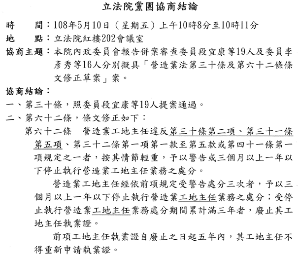 協商主題 本院內政委員會報告併案審查委員段宜康等19人及委員李彥秀等16人分別擬具「營造業法第三十條及第六十二條條文修正草案」案。