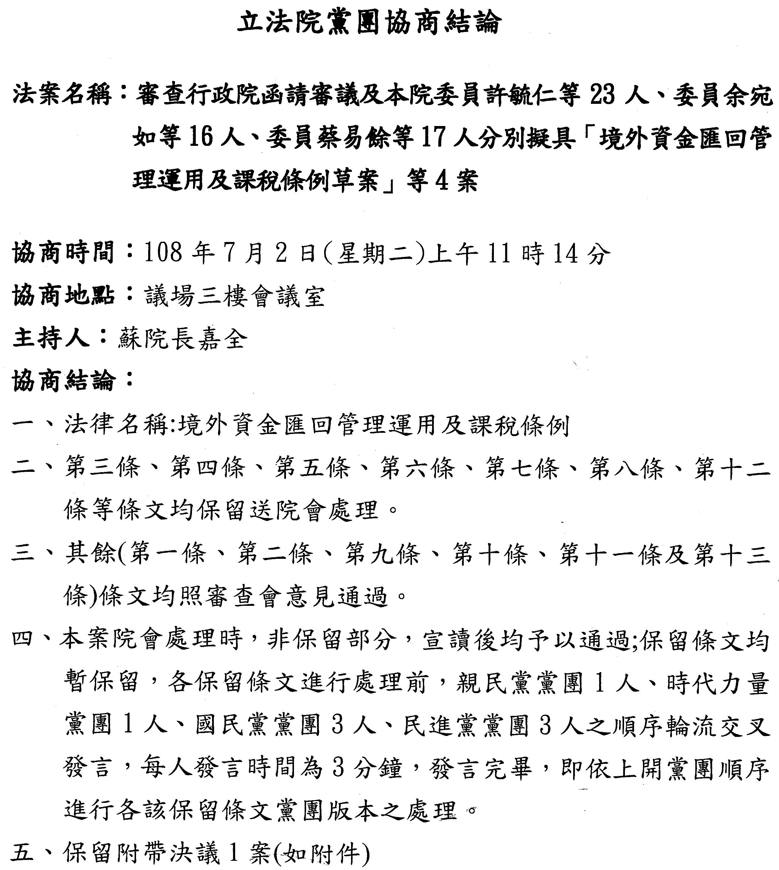 第二點,為什麼現行海外資金不敢回來?其實是因為在程序上匯回來之後經過央行,央行要通報國稅局去查,所以臺商的錢不回來,是因為這樣的關係,稅少的問題不大,我再講一次,因為你海外的錢匯回來,央行就某個額度會通知國稅局,國稅局就拿出來查並找當事人來詢問,後續要補稅的補稅,不需要補稅的就不補稅,這樣的原因造成海外的基金不能回來。剛剛蘇部長講了,以後依照這個條例匯回來的錢,還有依照剛剛黃國昌委員提到的APG的回函,要tax authority也就是國稅局處理,照樣遇到那一套!