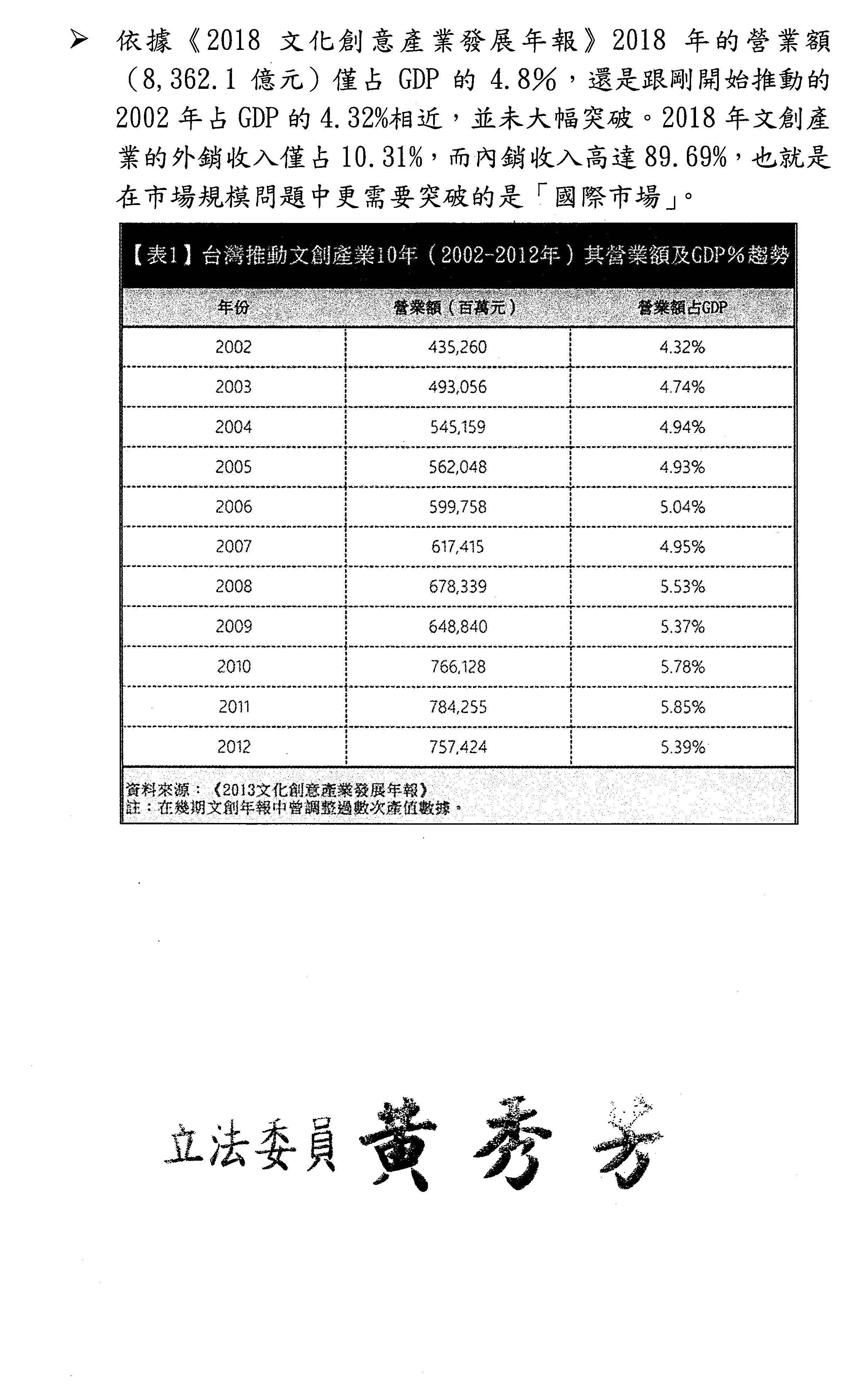 蘇院長貞昌:當然,現在連美國跟中國都發生貿易戰、貿易糾紛,美國甚至於從總統到相關官員一再指責中國各種不當的地方。反觀臺灣在中國一再打壓的情形下,以我們經濟的成長,就第2季GDP來講,我們在亞洲四小龍裡面是第1名,可見在外交處境險峻,在中國一再打壓的情形下,經過人民與政府的努力,我們交出很好的成績。委員剛才所點出來的很重要,有經濟才能讓我們活下去,所以我們一定會更努力來福國利民。