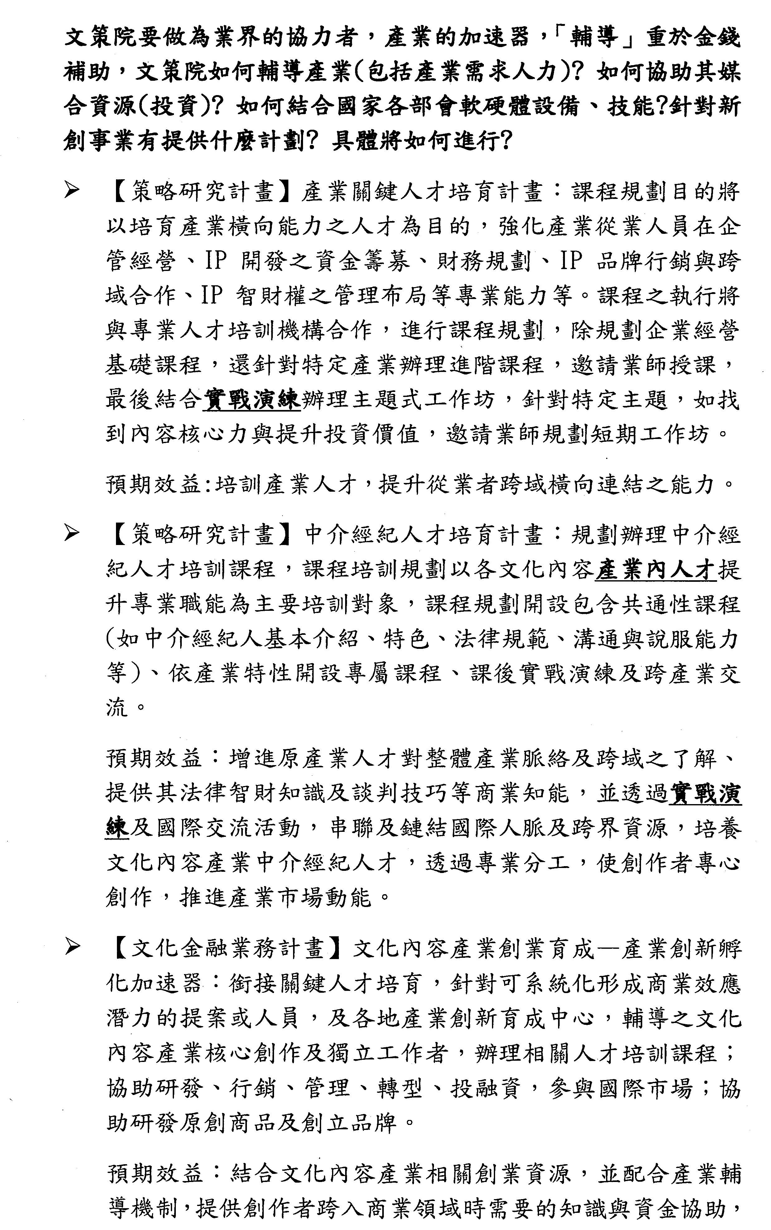 蘇院長貞昌:委員,你講得非常重要,所以這一次我們在臺商回臺,這是第一個部分,第二個部分是根留臺灣,第三個是特別就中小企業的部分,中小企業不但有剛才部長所報告有補助,另外一個方面,我們有降低手續費,第三方面,不只經濟部,我也要求財政部對公股銀行負責人的考核,過去是只有貸款金額,現在則包括貸款家數,也就是讓中小企業貸款能夠得到方便,這個非常有效,而且做出成績並列為考核目標。