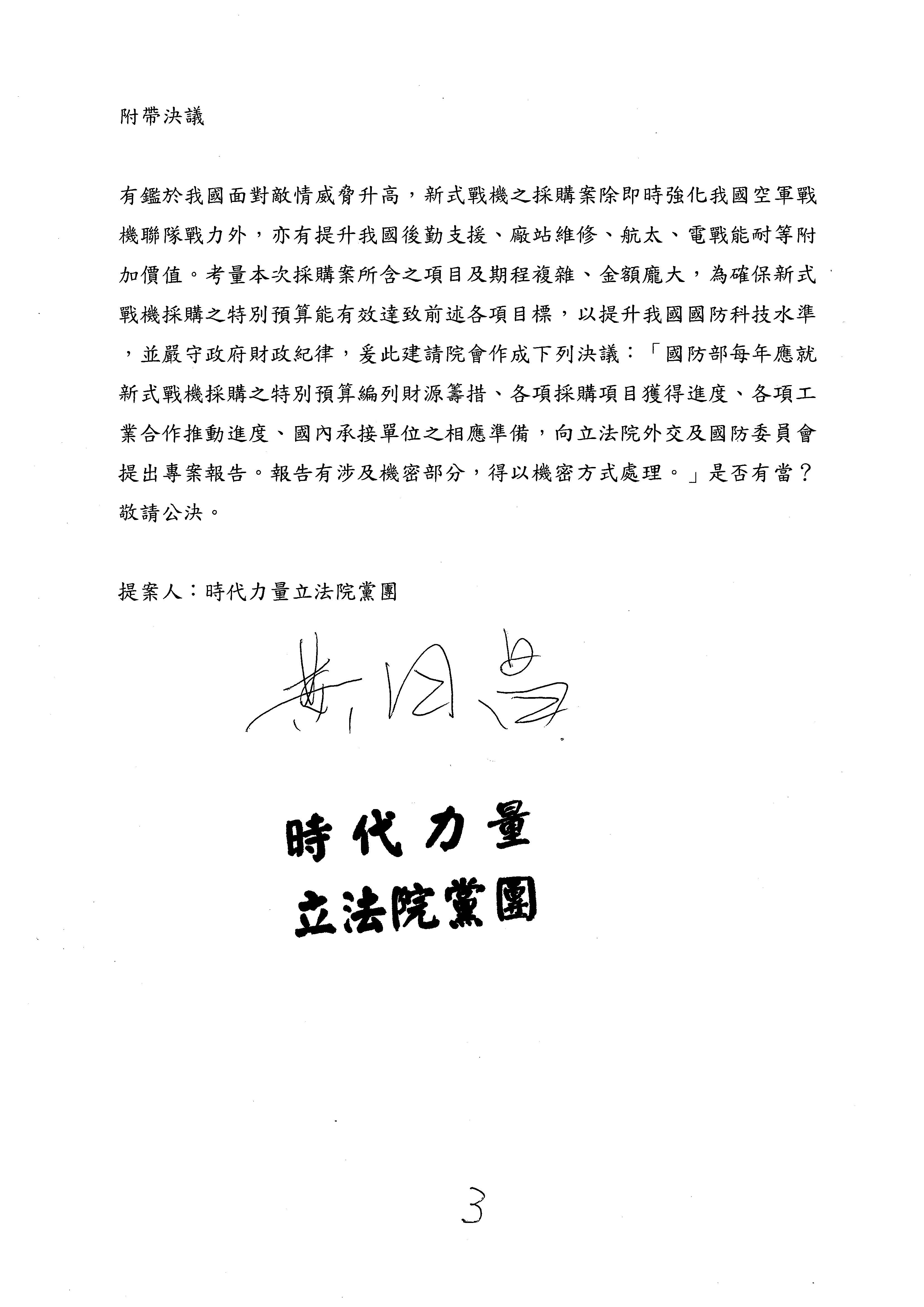 主席:印給各黨團,這個附帶決議可以再討論,沒有關係,就是他們先提出來讓國防部先看,看完之後我們就再討論,這樣好不好?這樣比較好啦!