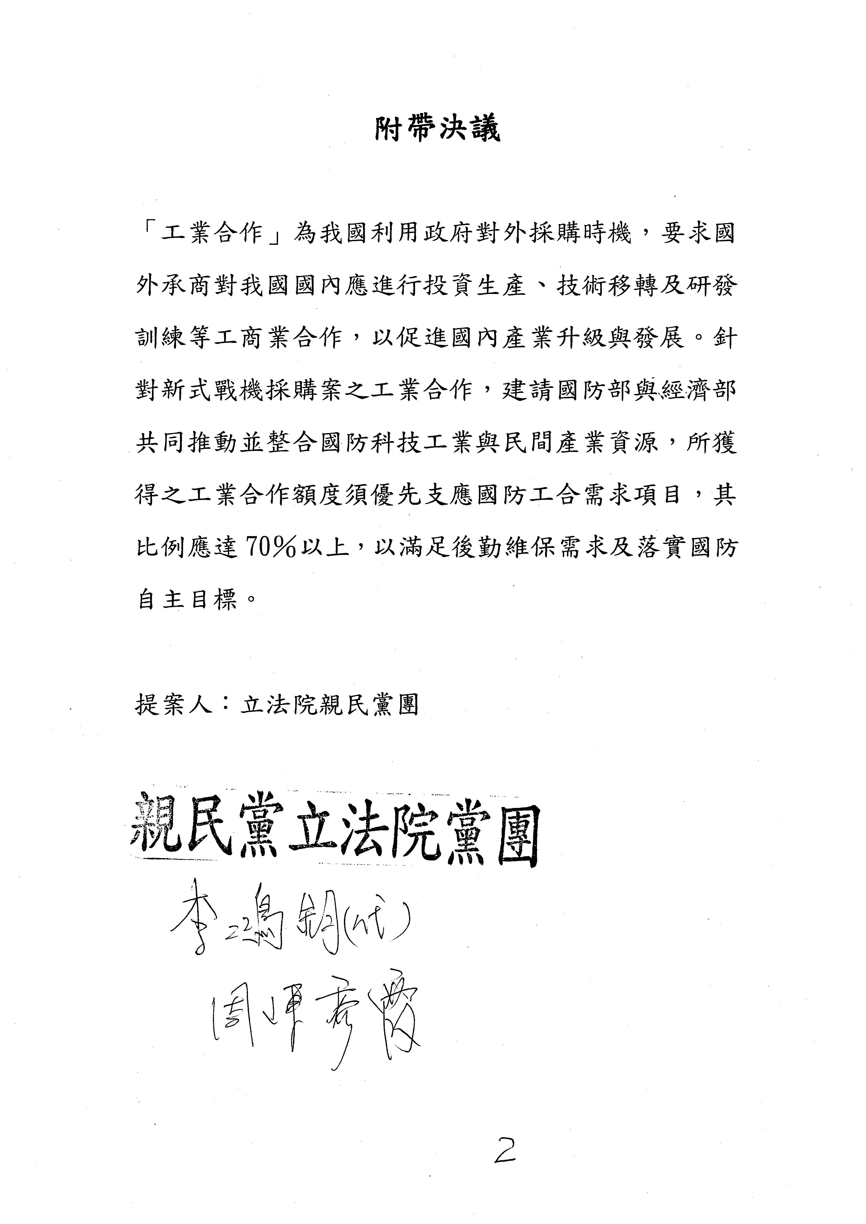 另外,關於工業合作的部分,這一次的新戰機當然也要跟民間產業的資源做結合,我們認為比例應該要達到70%,來滿足我們的後勤需要,這些都是附帶決議的內容,也是剛剛曾總召提到的第二點及第三點,我想大家在這方面的意見應該會有一致性啦,本席特別在此做以上補充說明。謝謝。