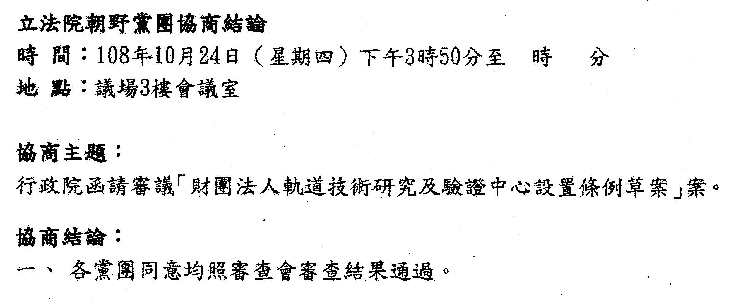 主席:這個法案在委員會都有經過充分的討論,名稱從「軌道」修正為「鐵道」,也修正了11條條文。總共才16條條文,就修正了11條,所以可是說是充分討論。在黨團協商的時候,也沒有黨團有意見,但是大家就是沒有簽名,說要保留到院會來,讓大家再詳細的了解。現在就徵求大家的意見,因為這個條文的內涵已經在委員會充分討論,大家要不要讓「財團法人軌道技術研究及驗證中心設置條例草案」有一個共識,因為對內容我們大概不會有意見,大家問了都是比較……