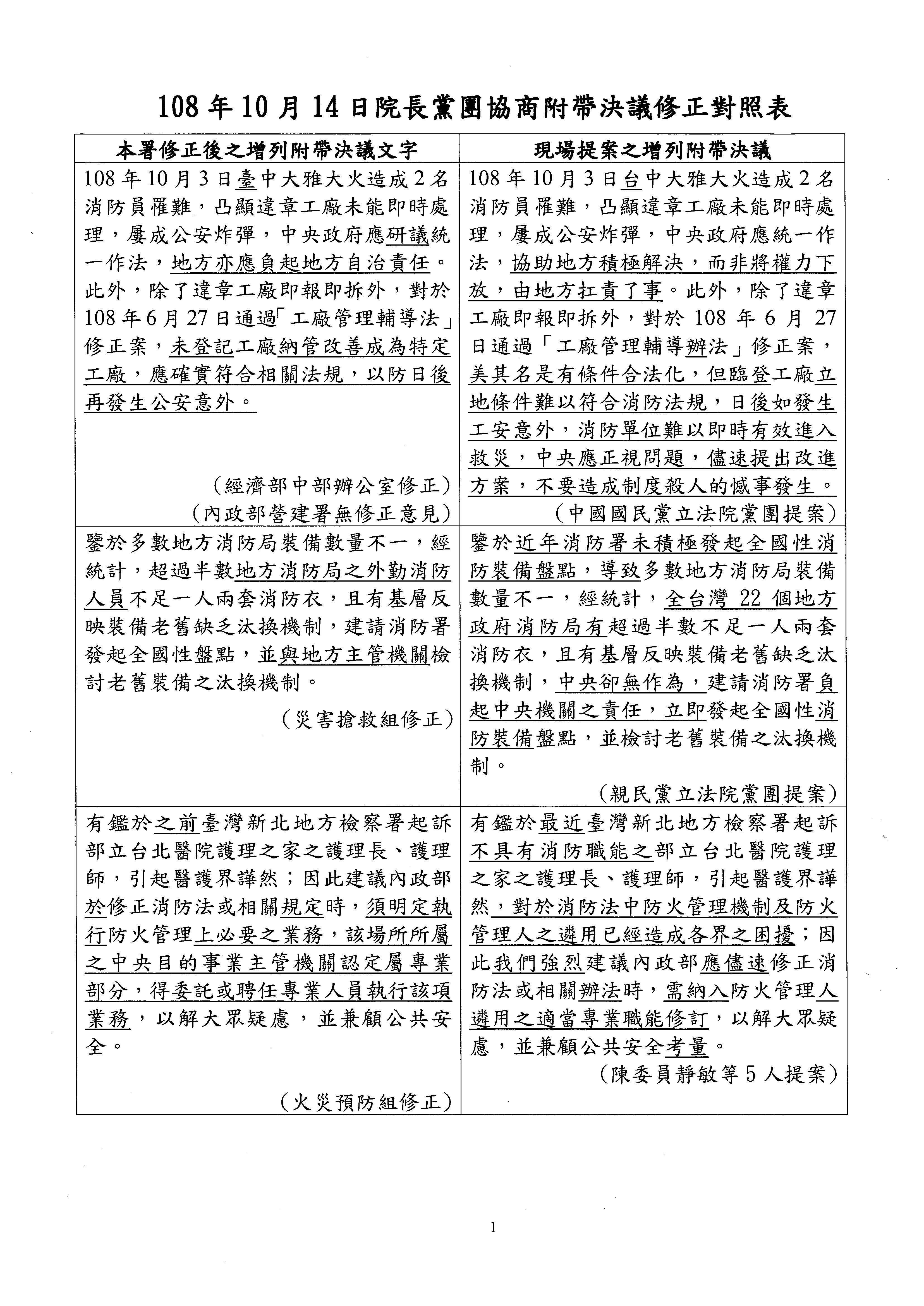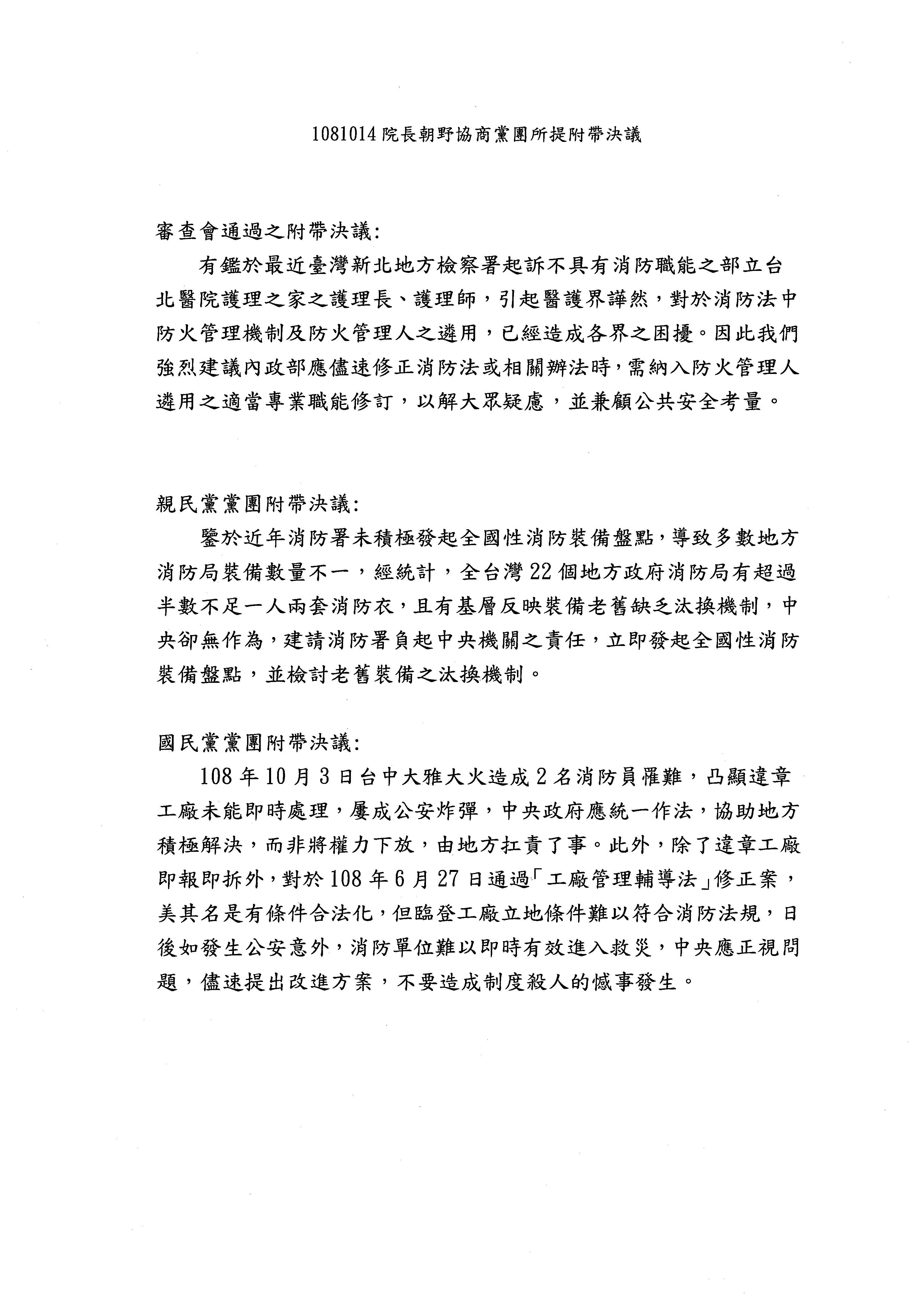 協商主題 一、研商「108年度中央政府總預算案附屬單位預算及綜計表─營業及非營業部分」案相關事宜。二、研商「新式戰機採購特別條例草案」、「消防法」、「財團法人軌道技術研究及驗證中心設置條例草案」相關事宜。(民進黨黨團提議)