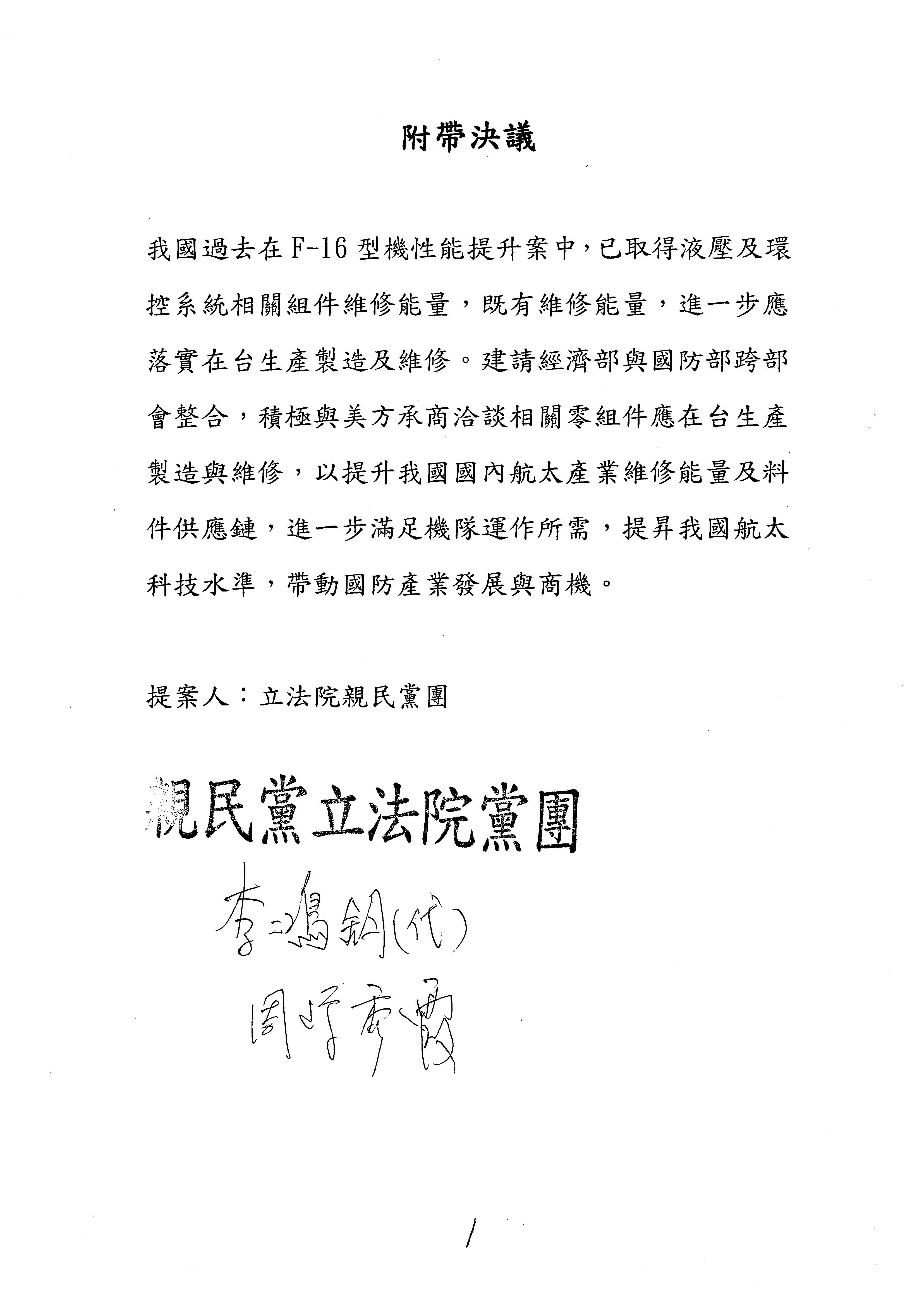 李委員鴻鈞:關於剛剛曾總召所提的問題,特別是第二個及第三個問題,其實親民黨也有提出附帶決議,就是說,因為長期以來,我們可以看到,包括我們購買幻象戰機也好,或之前的F-16也好,包括它後面的維修系統,或是零組件的生產系統也好,其實都沒有很落實的在臺灣這邊做,長久以來,我們一直看到這個問題。這也是本黨團提出附帶決議的原因,包括經濟部及國防部必須跨部會的整合,針對這一次F-16V的採購案,它的零組件應該要在臺灣生產及維修,因為我們看到前面幾次採購案的教訓,所以這個區塊應該將它彌補起來,我們的附帶決議已經有提出來了。