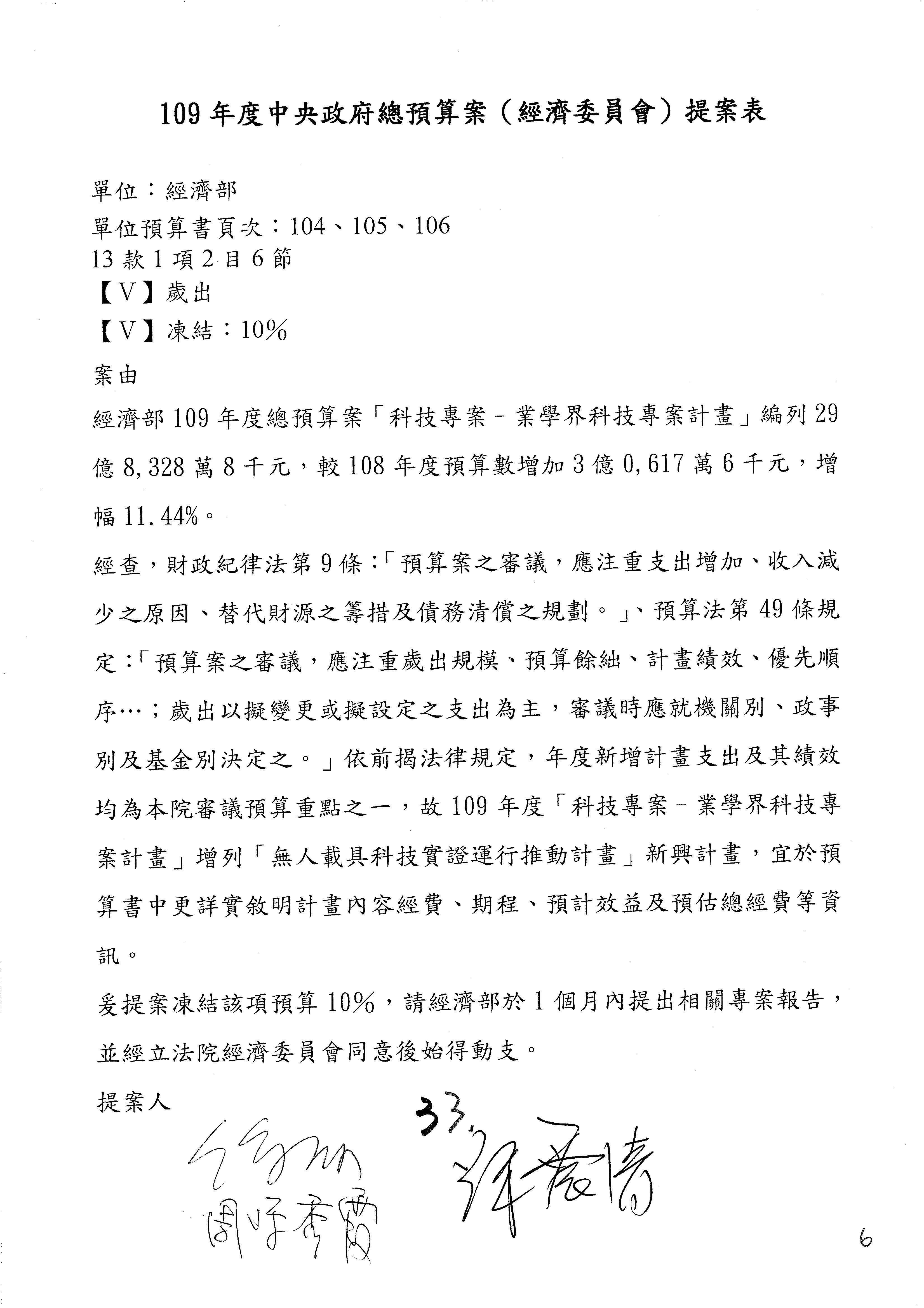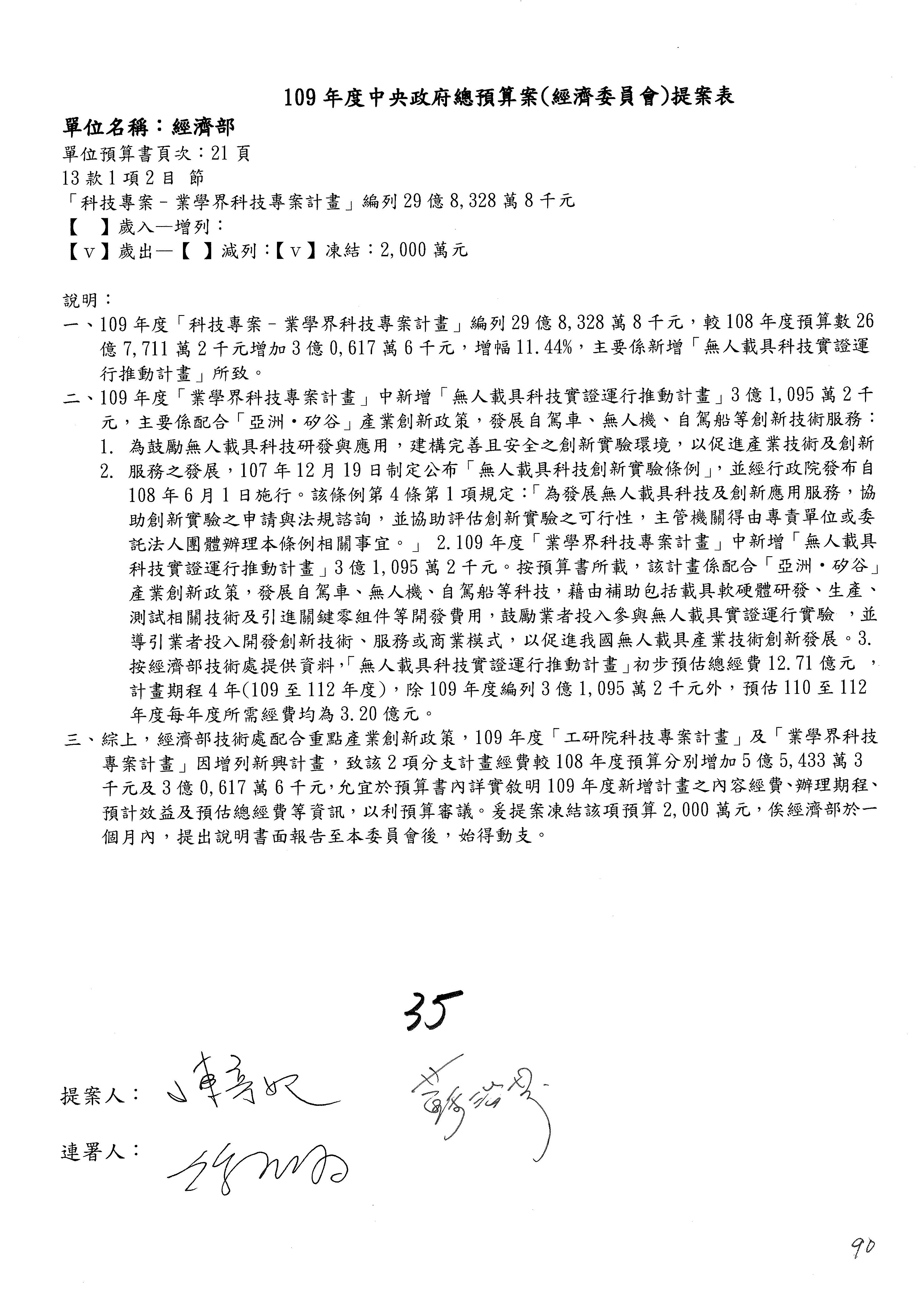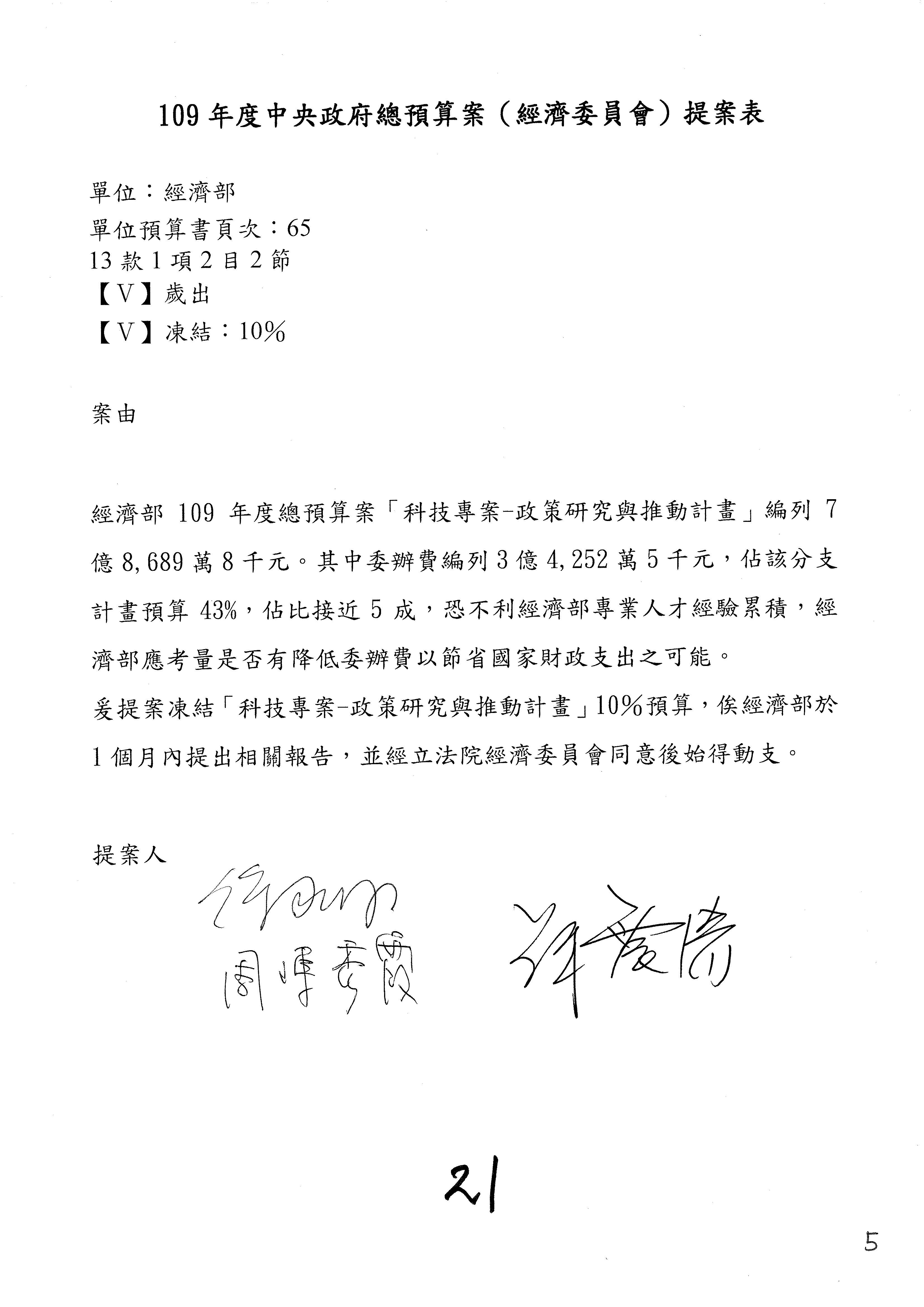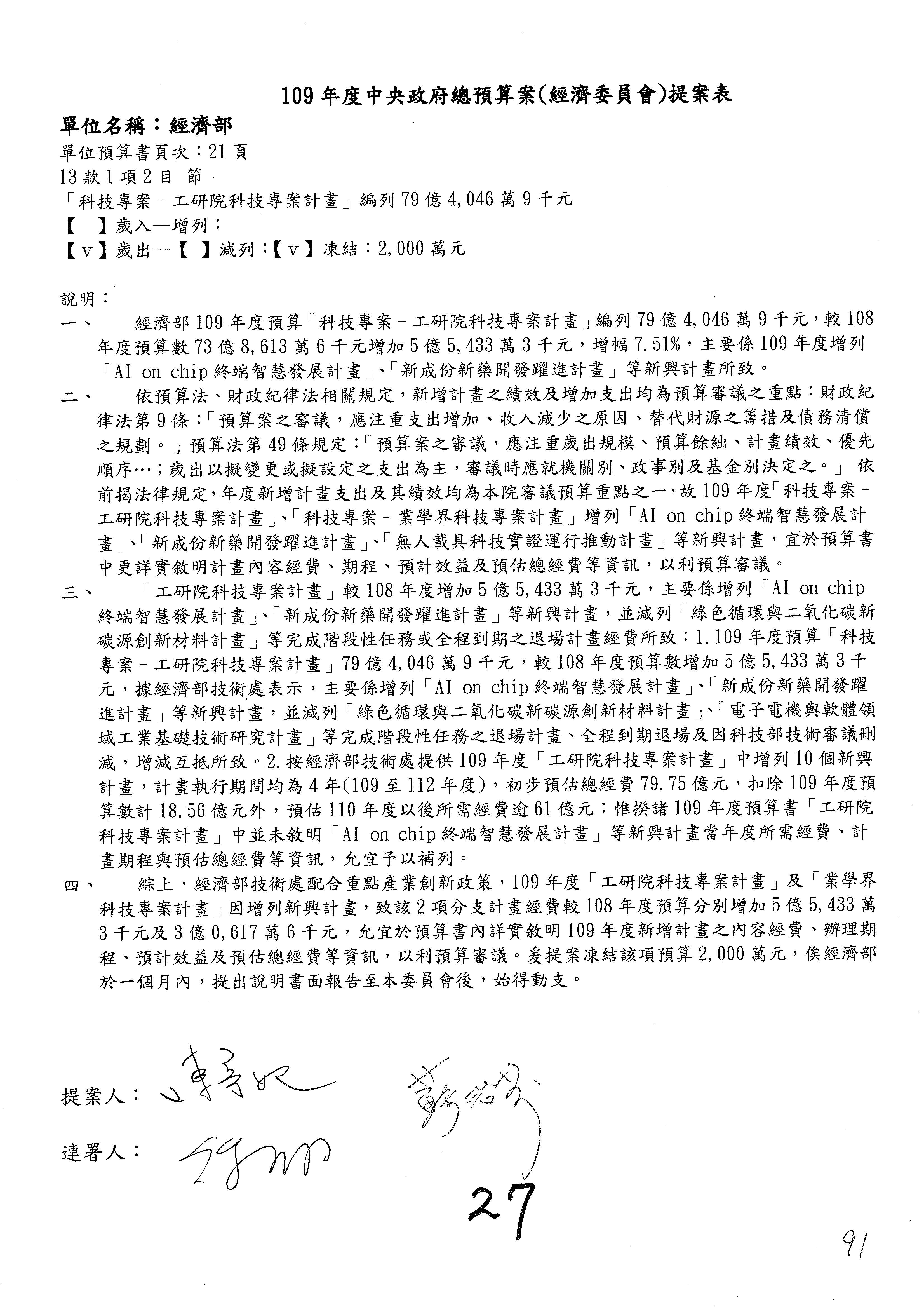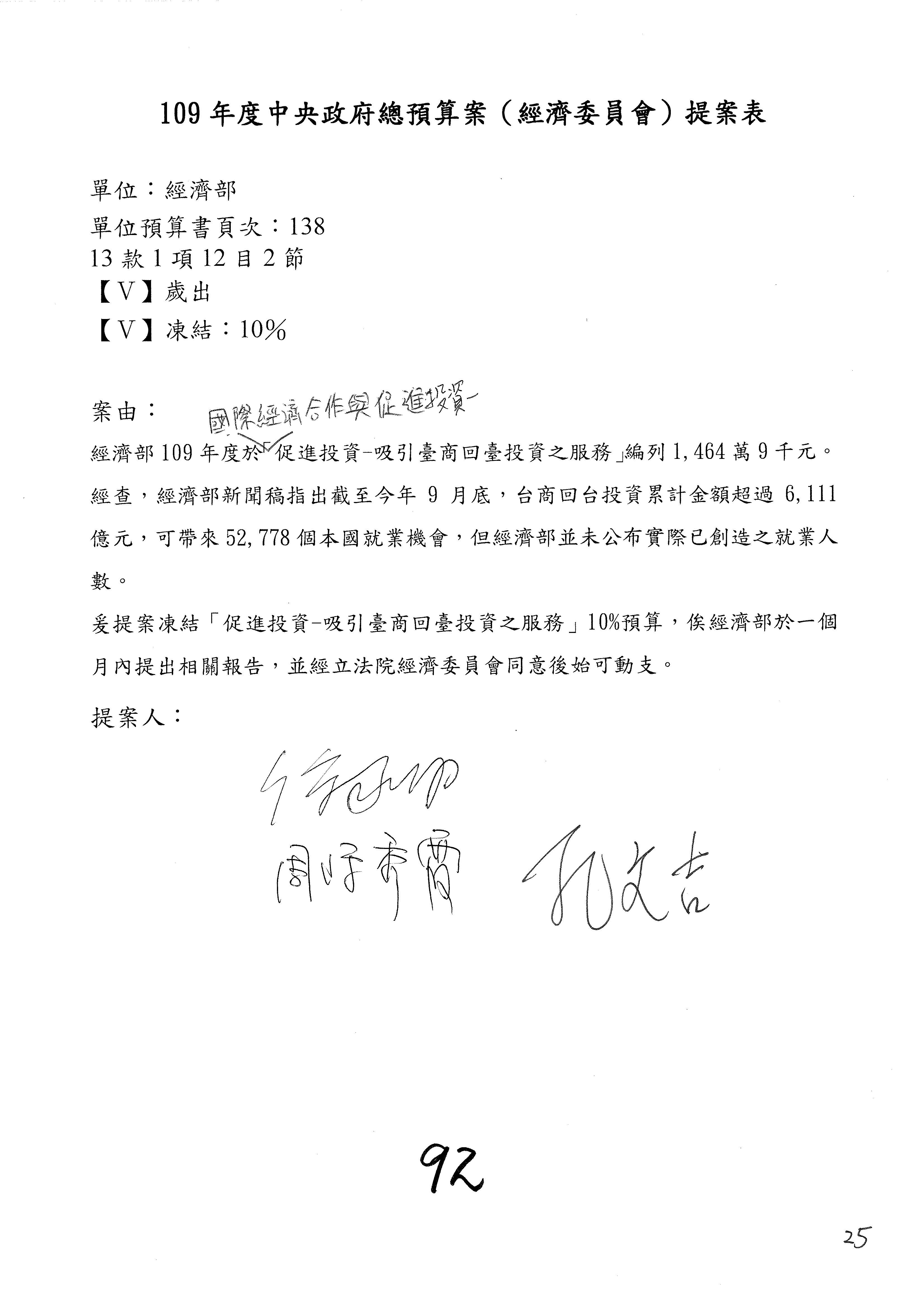 (一)國家發展委員會109年度歲出預算第3目「研擬經濟政策、協調推動財經措施」編列1,773萬3千元,凍結5%,俟向立法院經濟委員會提出書面報告後,始得動支。