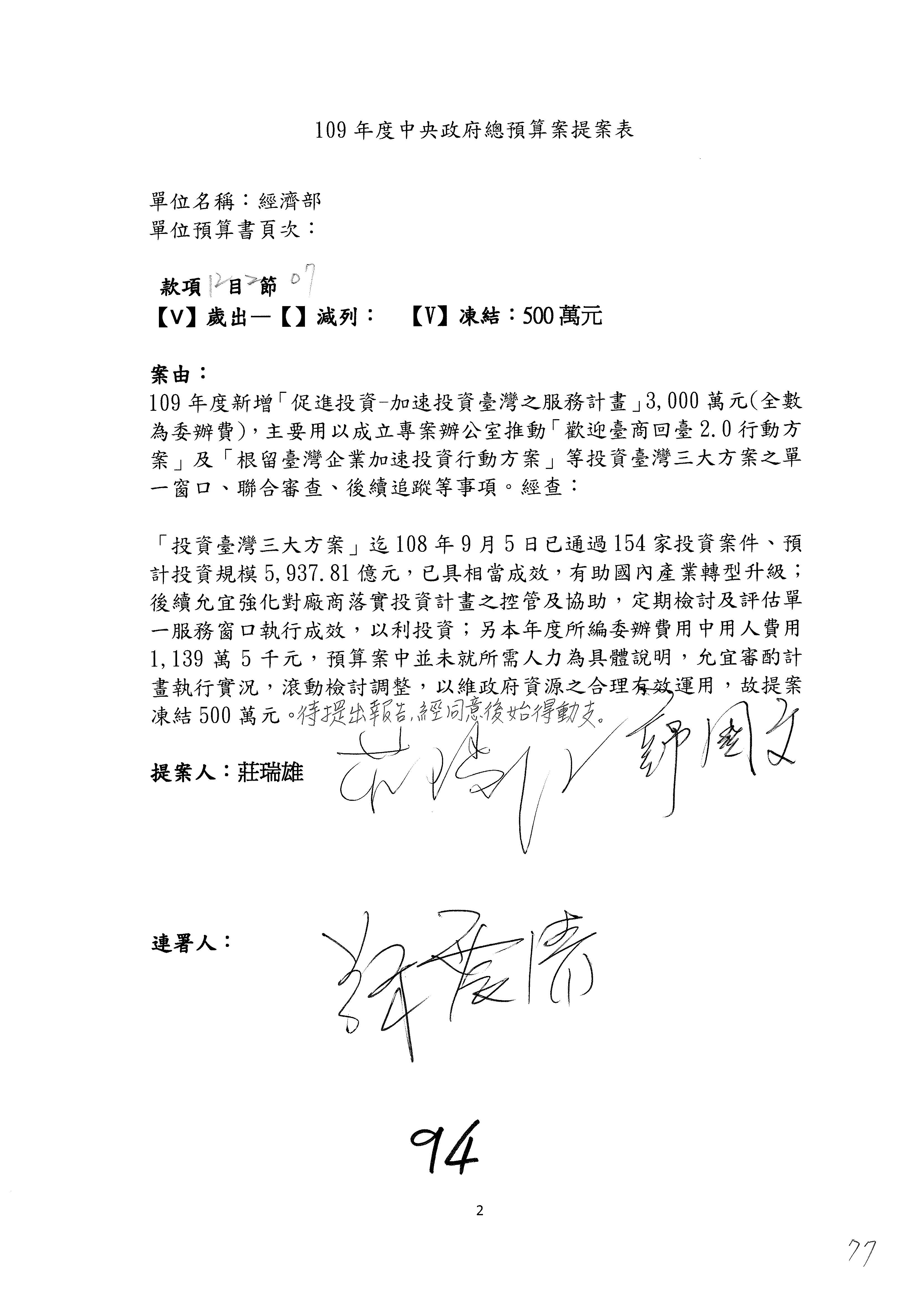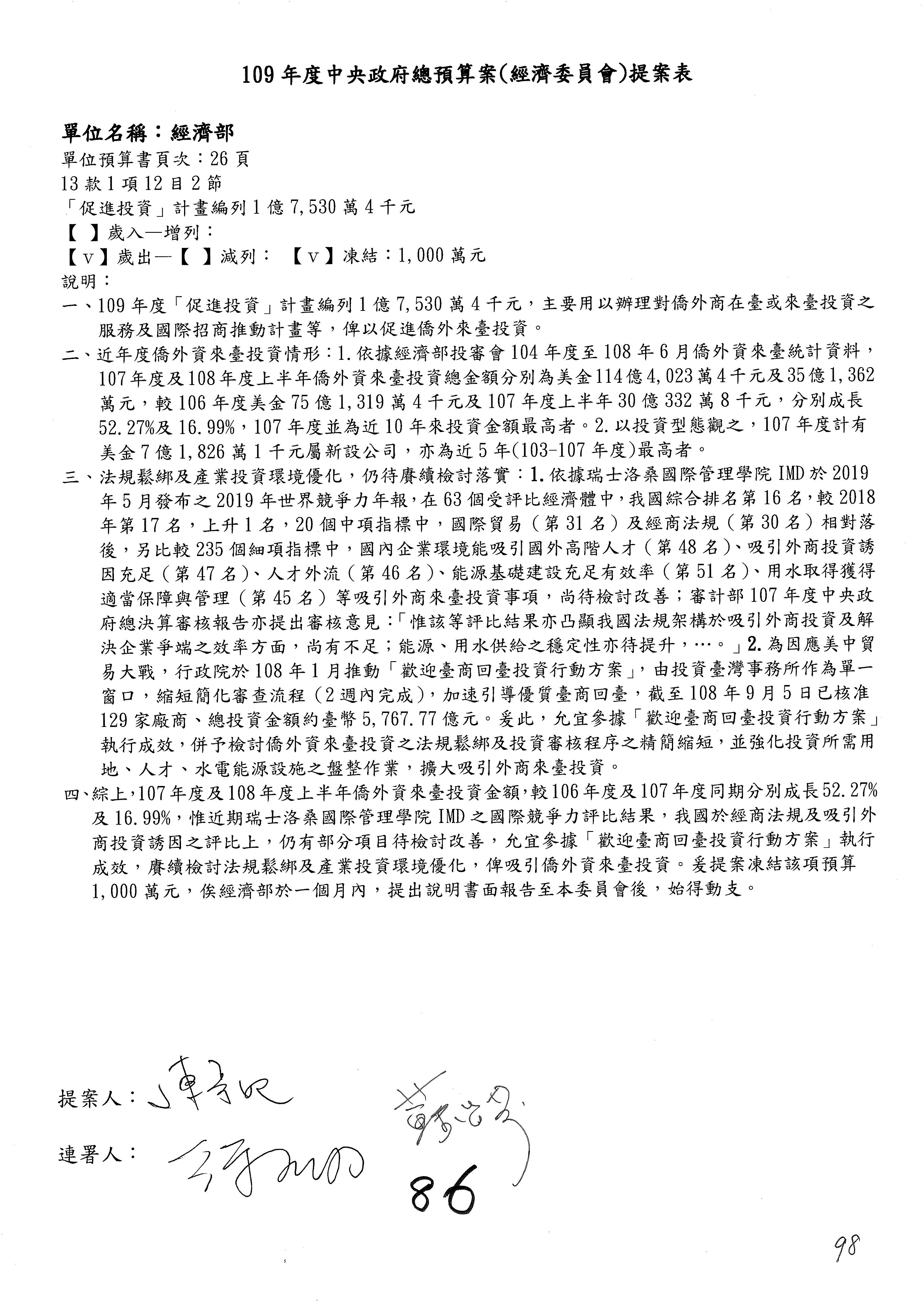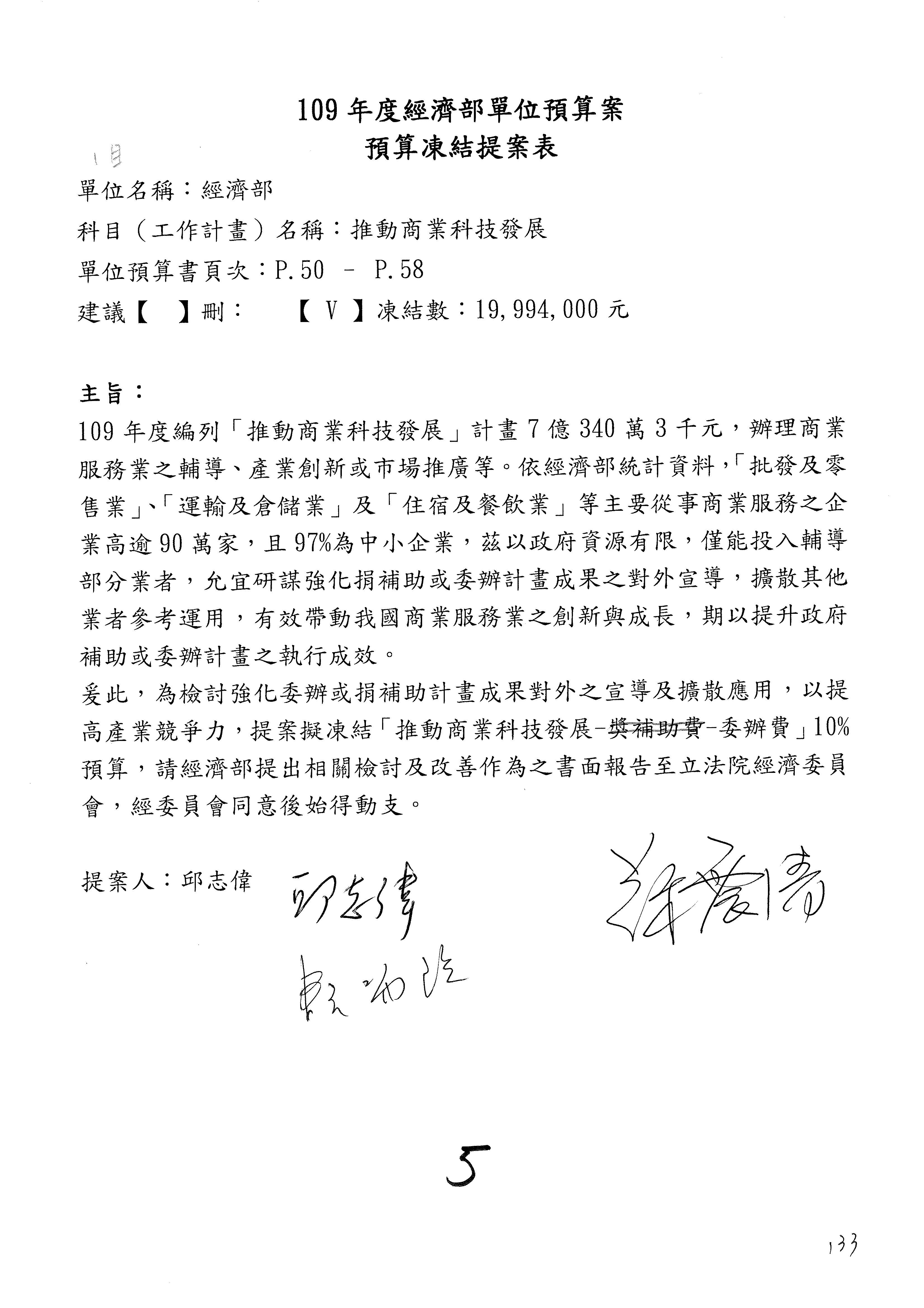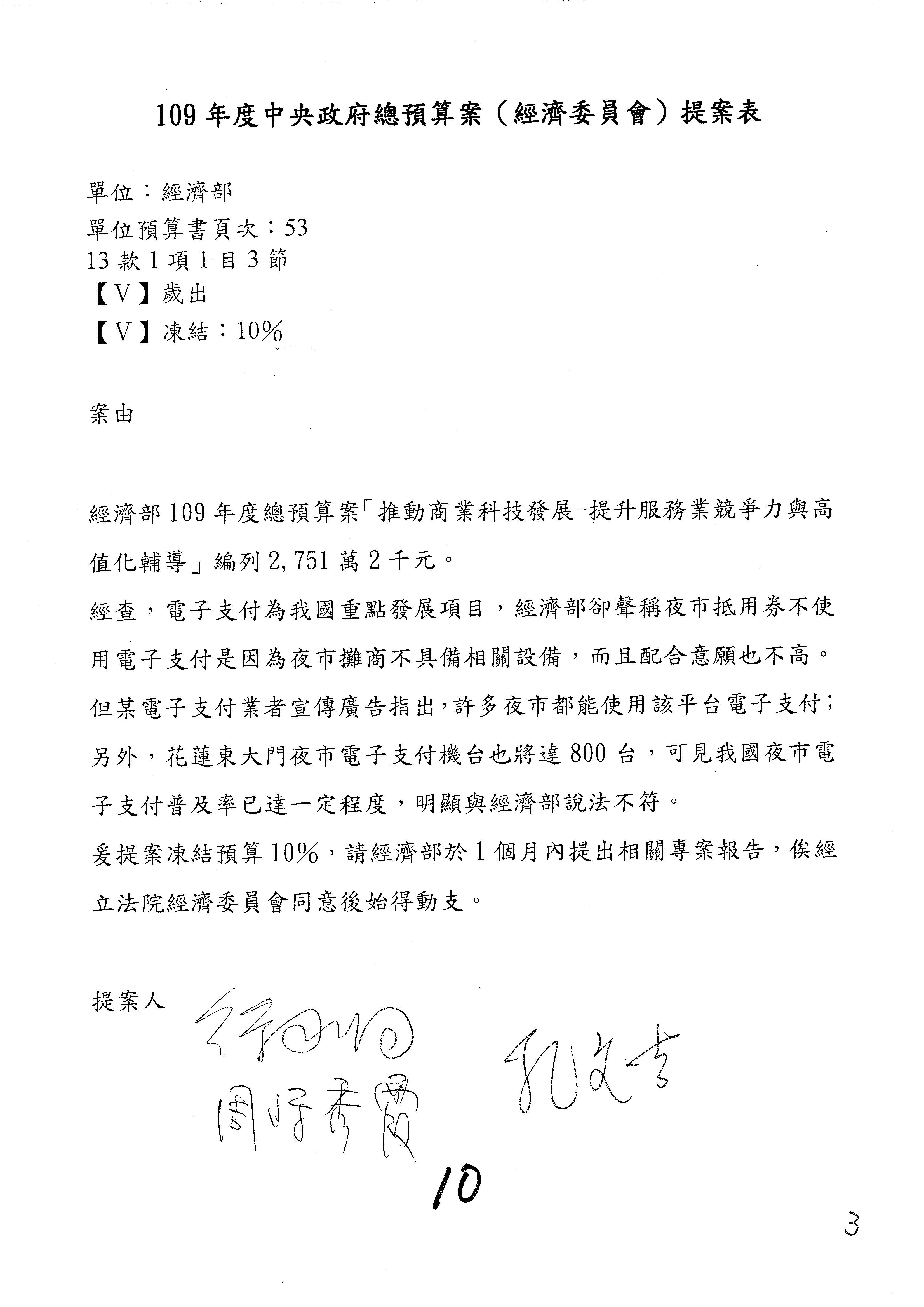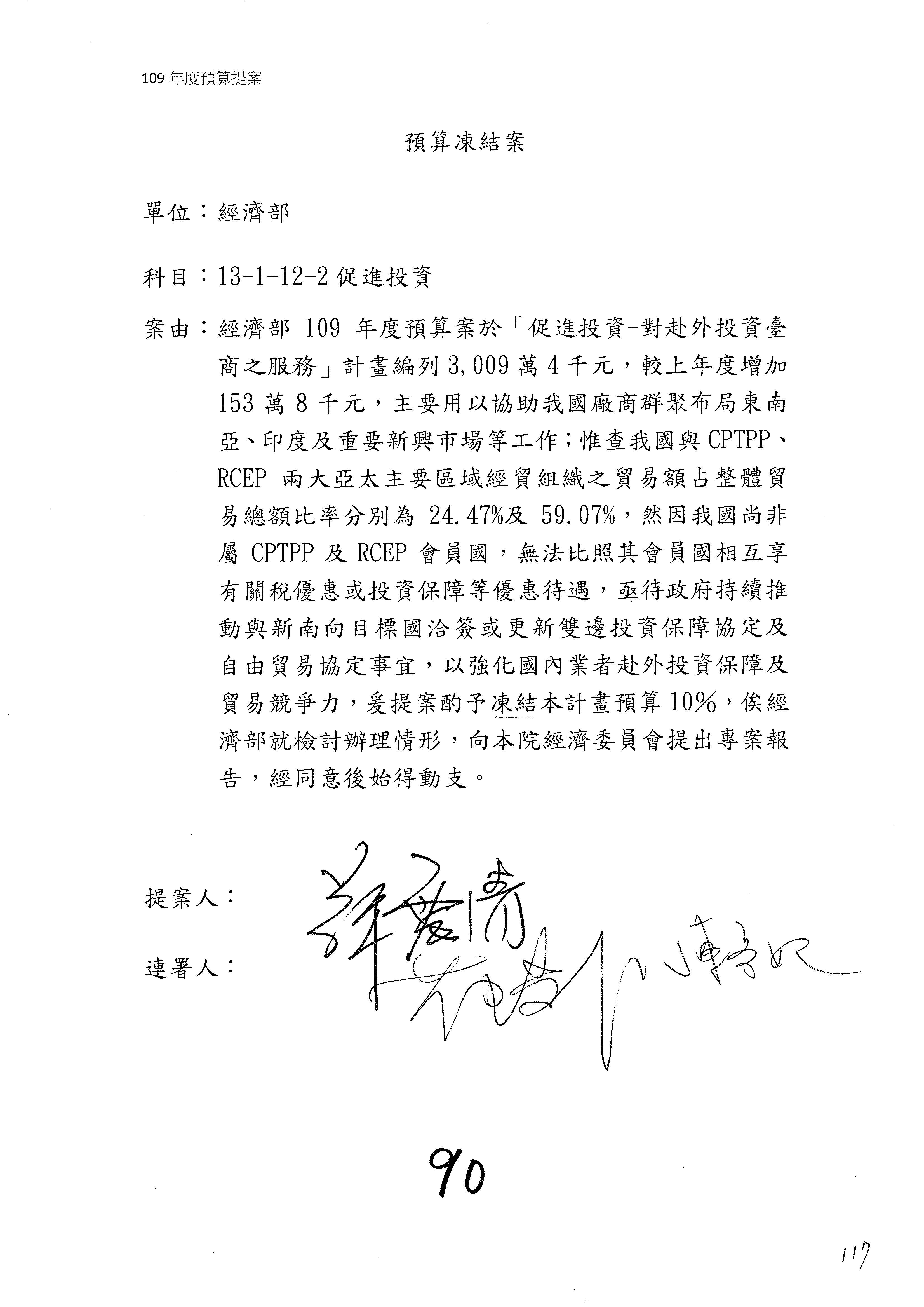(一)國家發展委員會109年度歲出預算第3目「研擬經濟政策、協調推動財經措施」編列1,773萬3千元,凍結5%,俟向立法院經濟委員會提出書面報告後,始得動支。