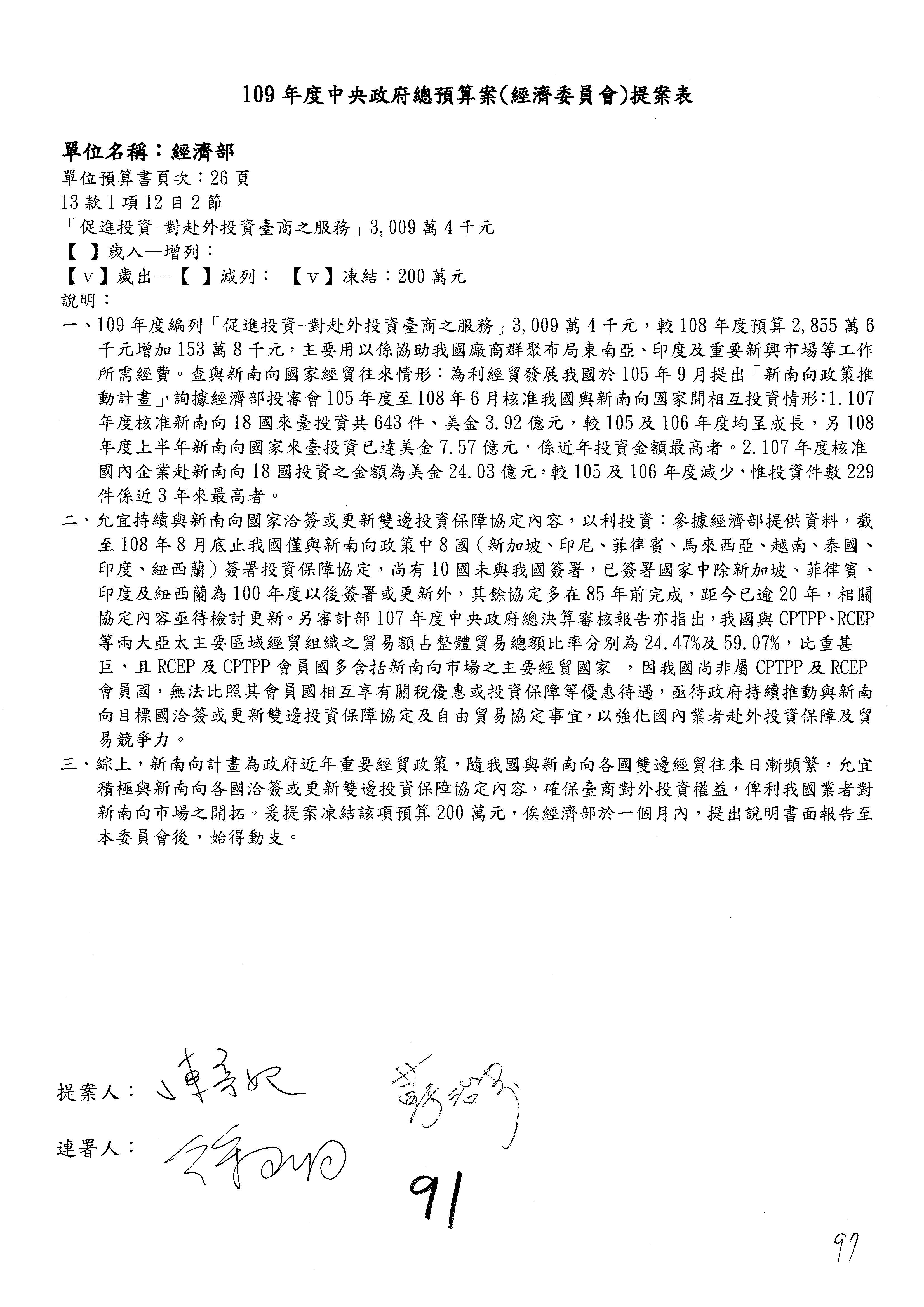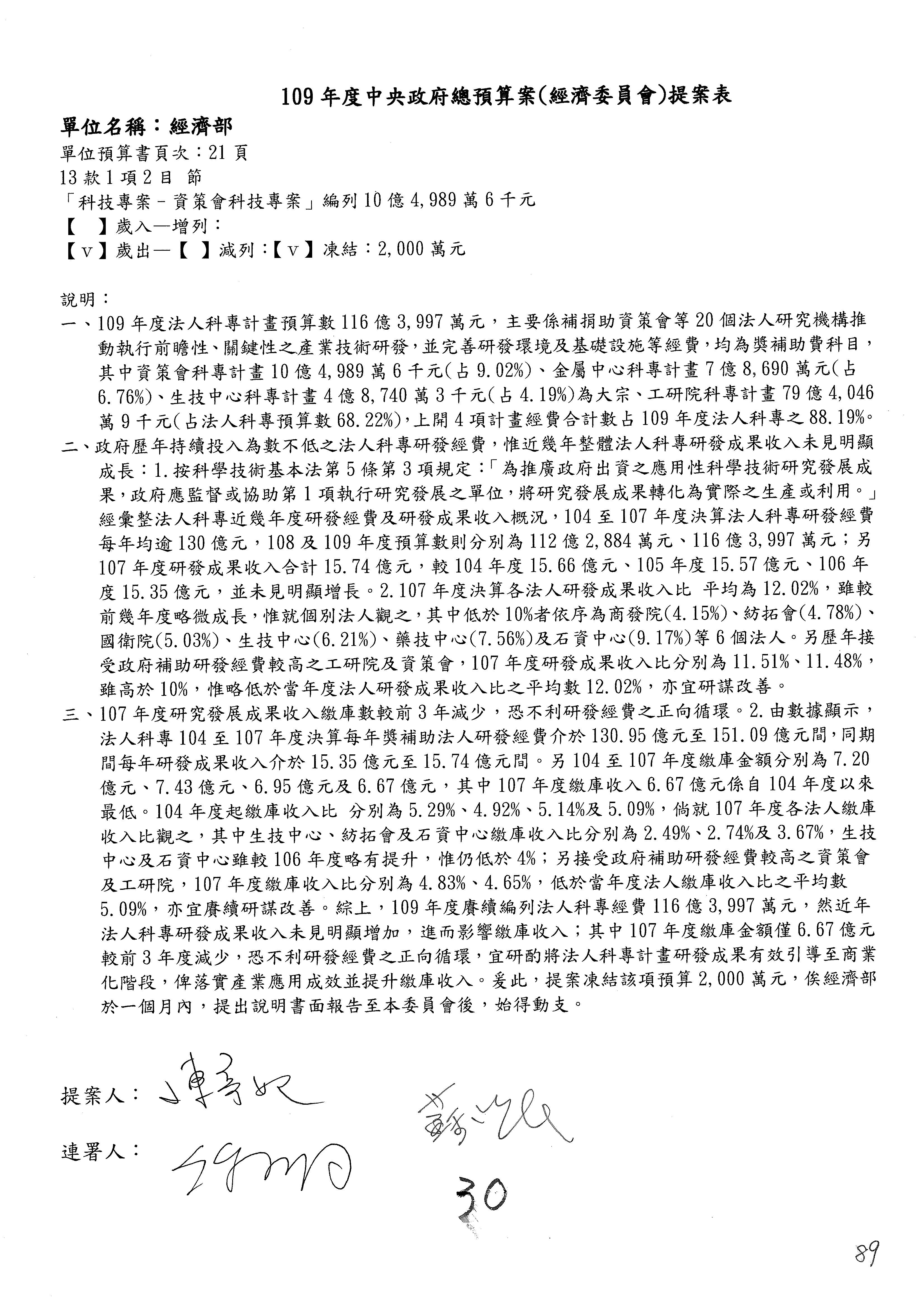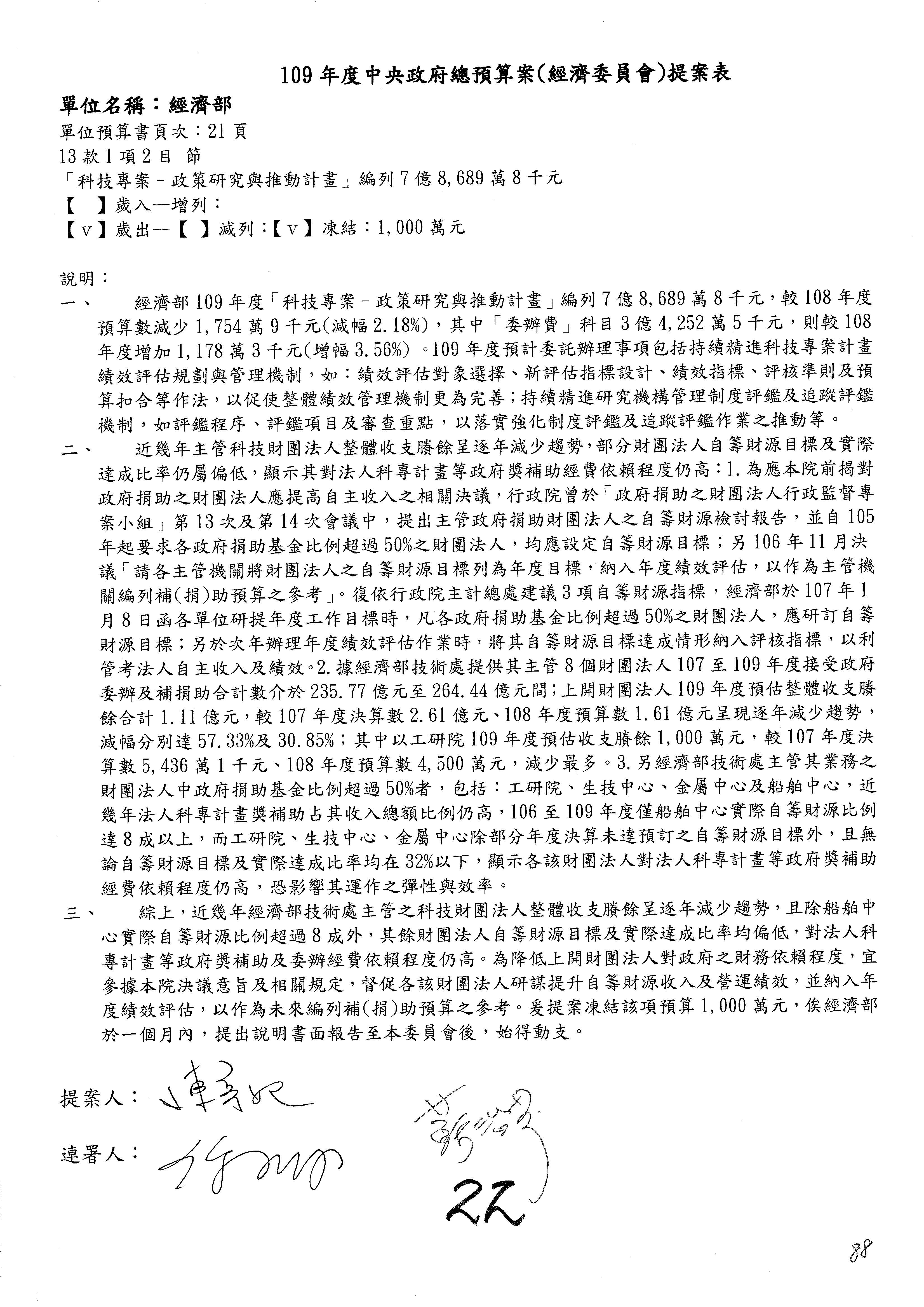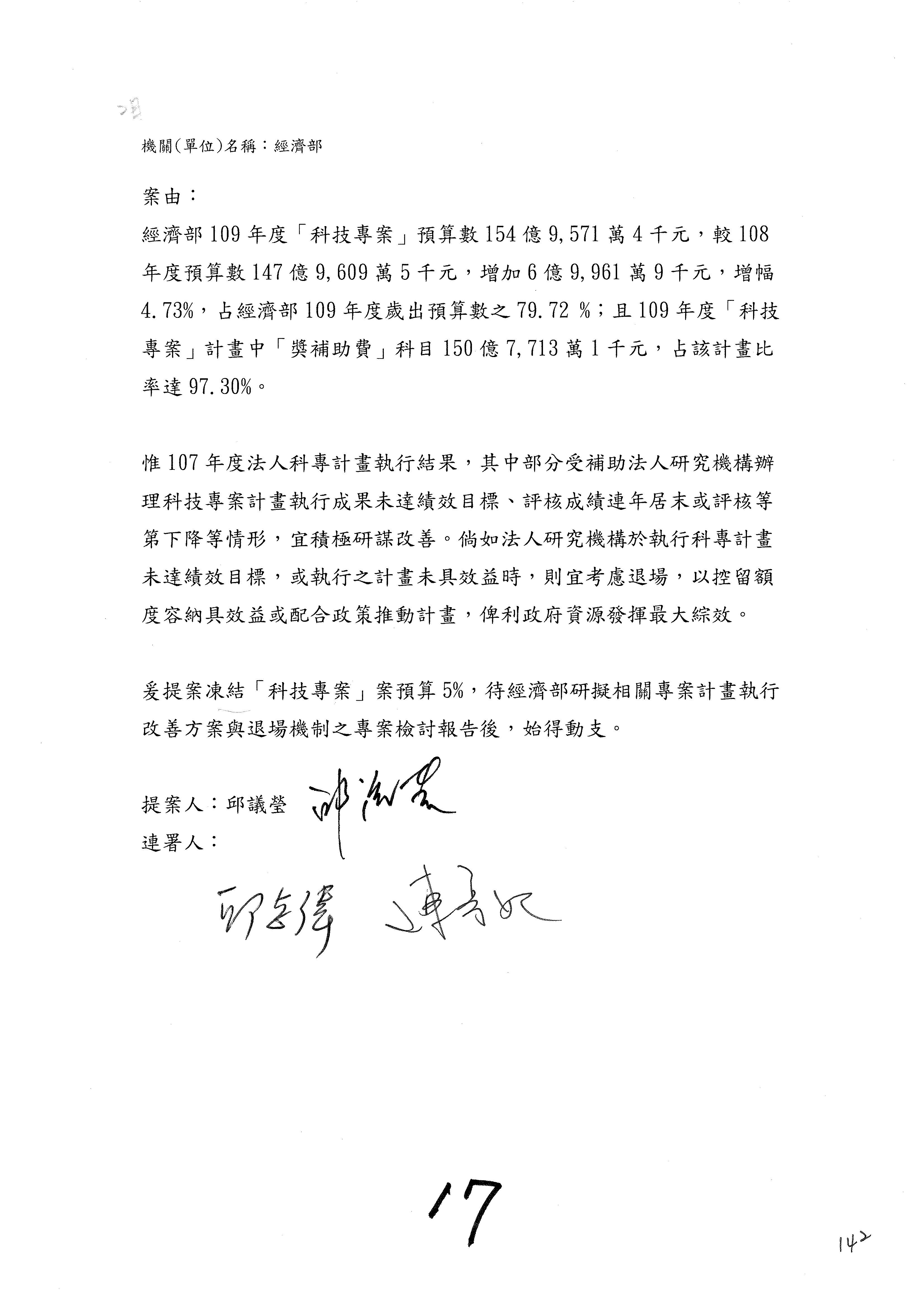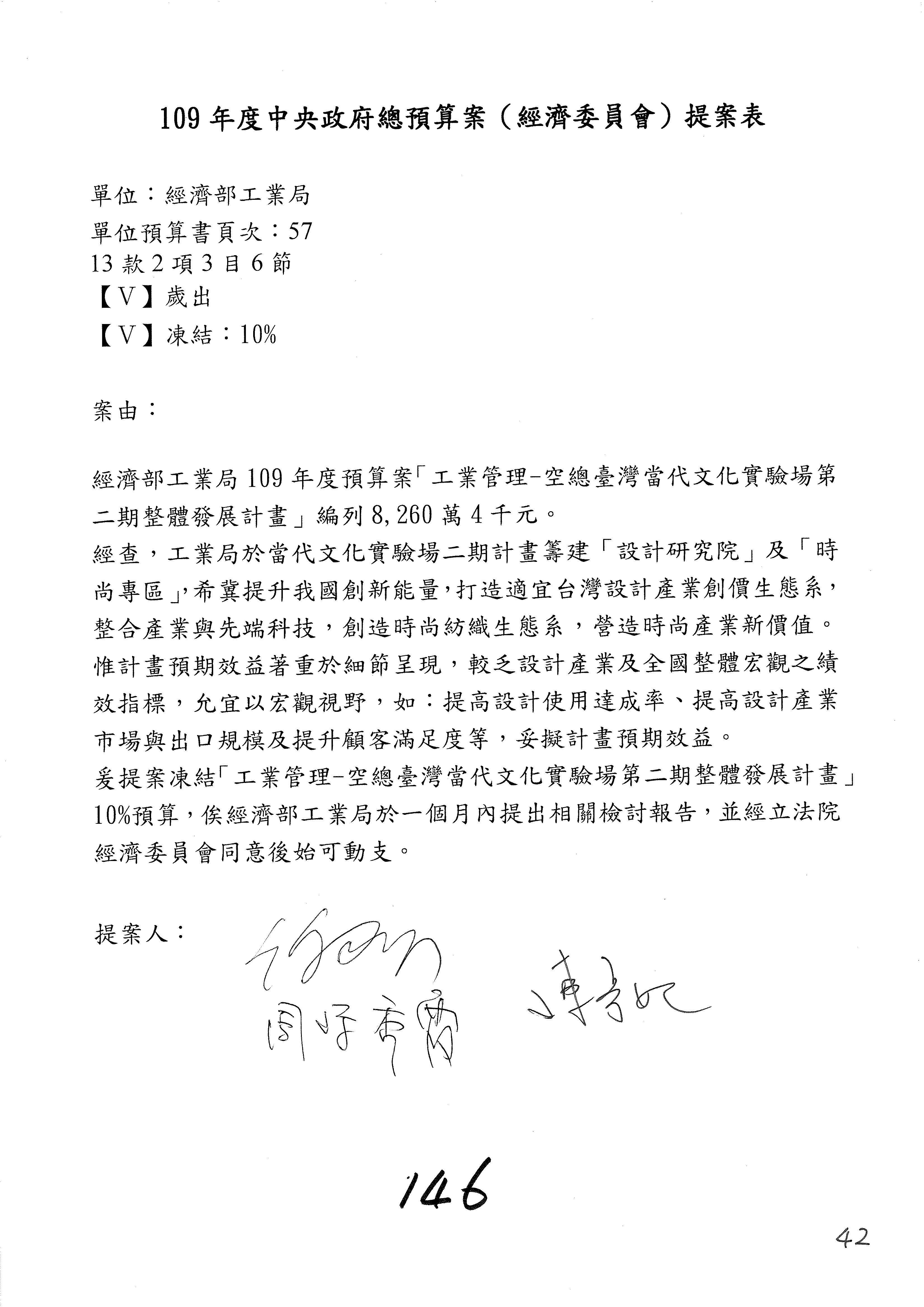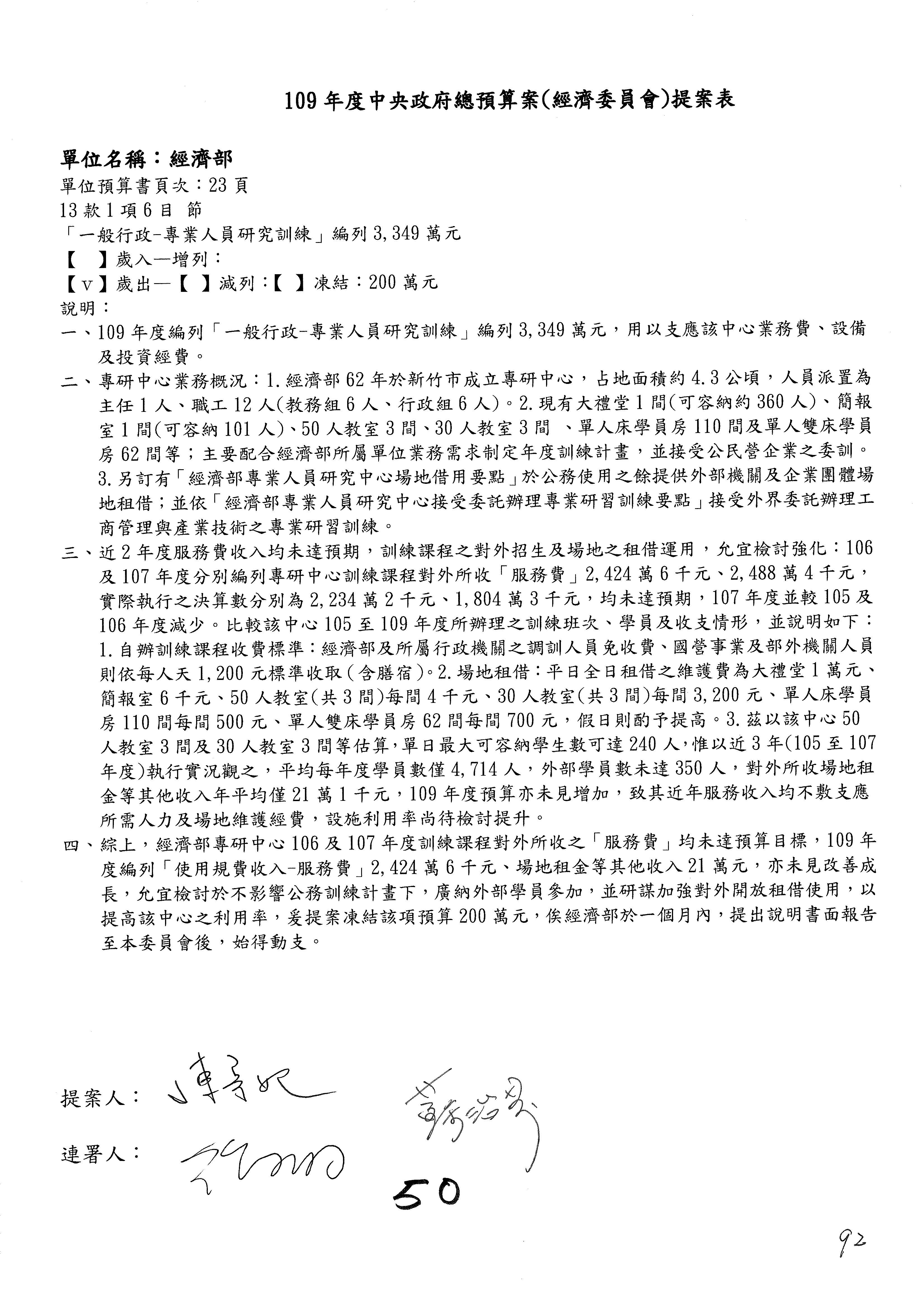 (一)國家發展委員會109年度歲出預算第3目「研擬經濟政策、協調推動財經措施」編列1,773萬3千元,凍結5%,俟向立法院經濟委員會提出書面報告後,始得動支。