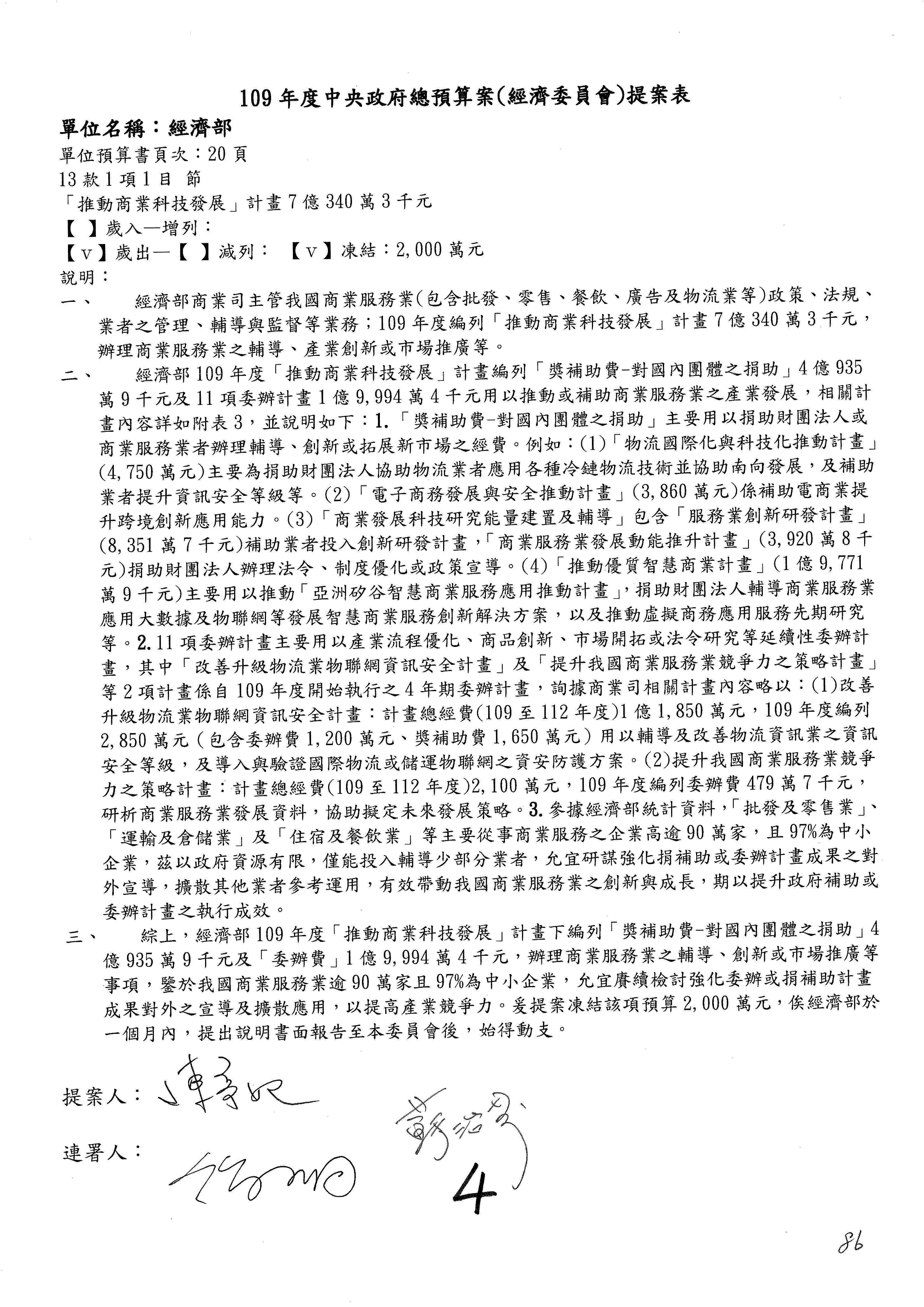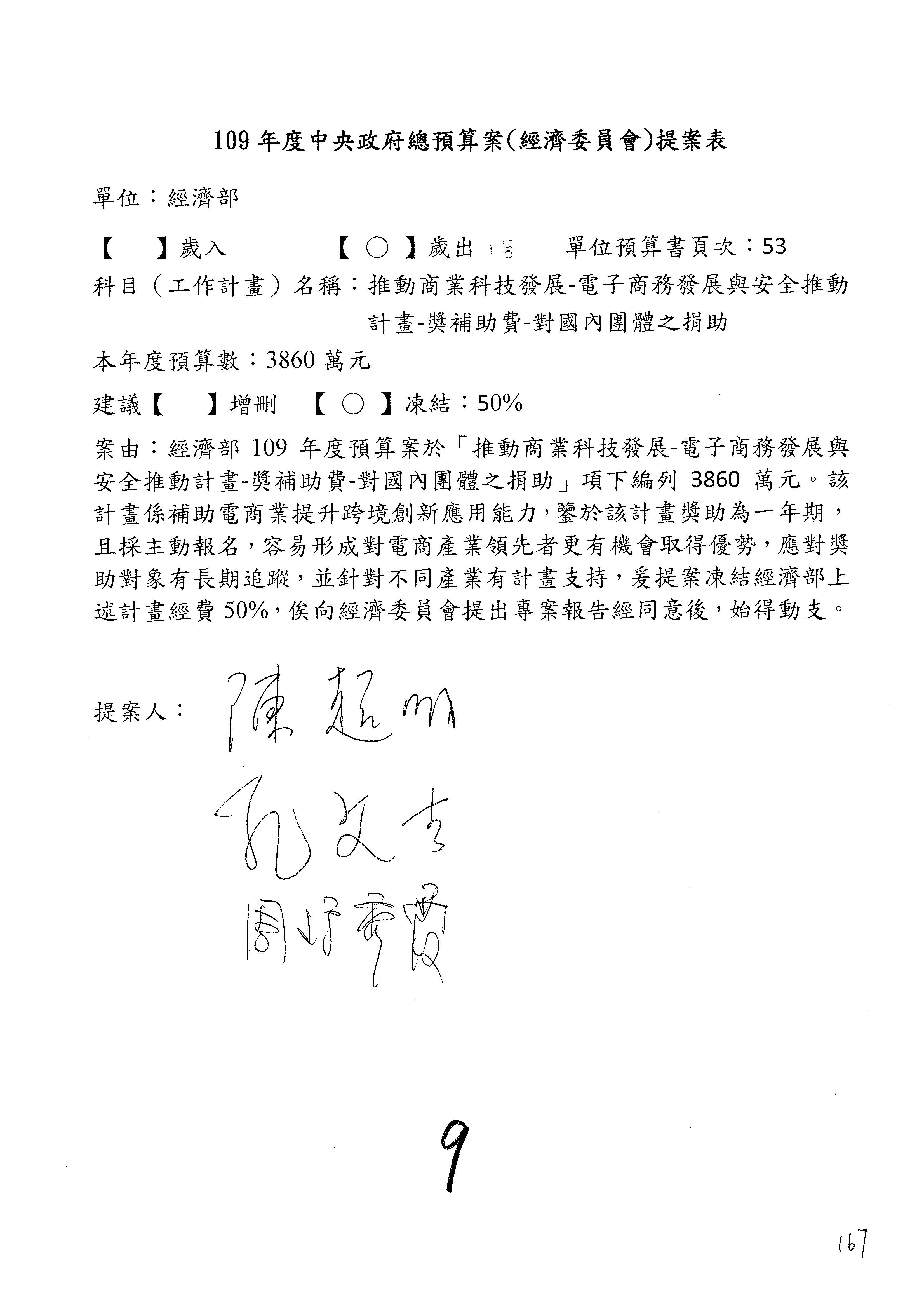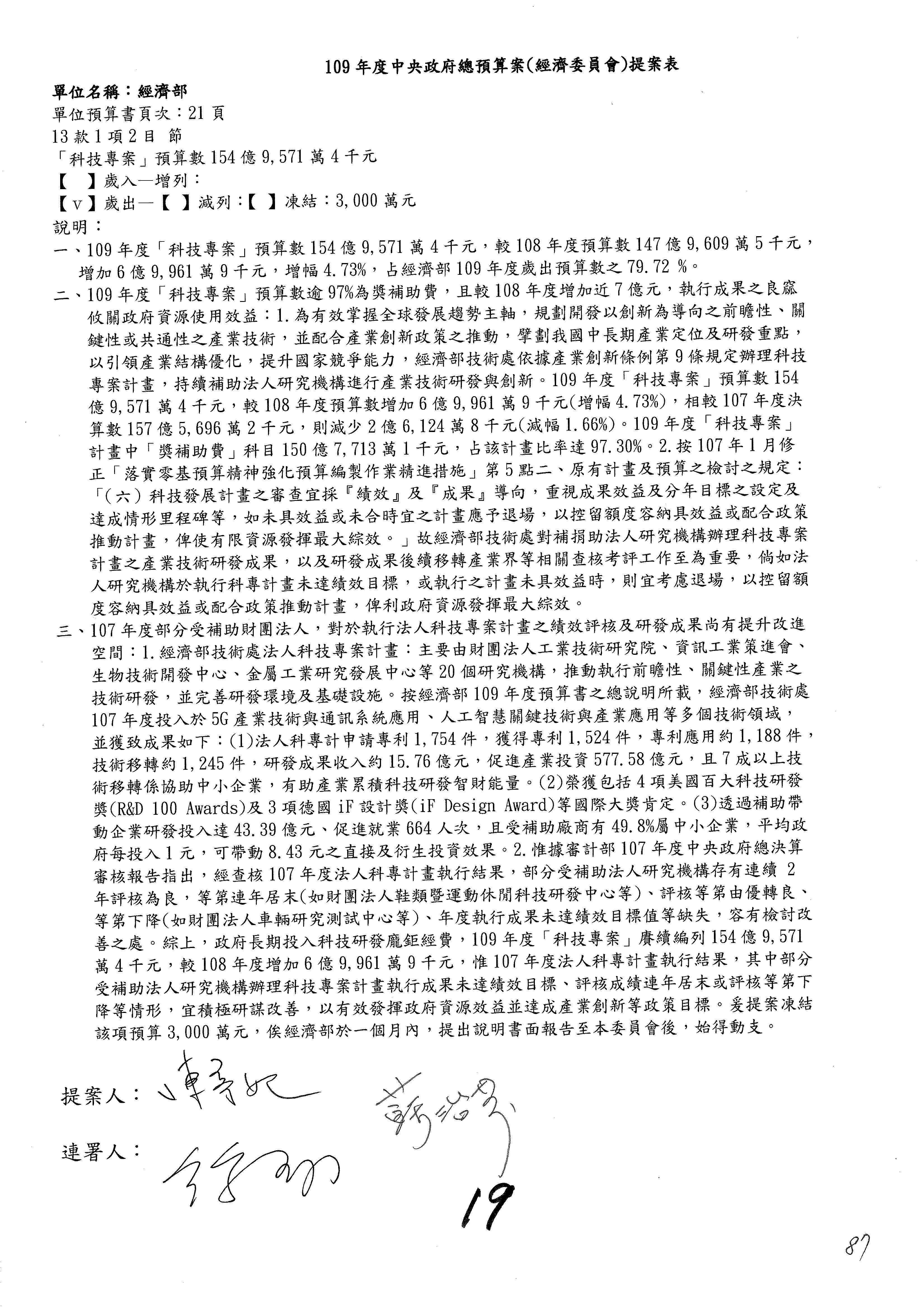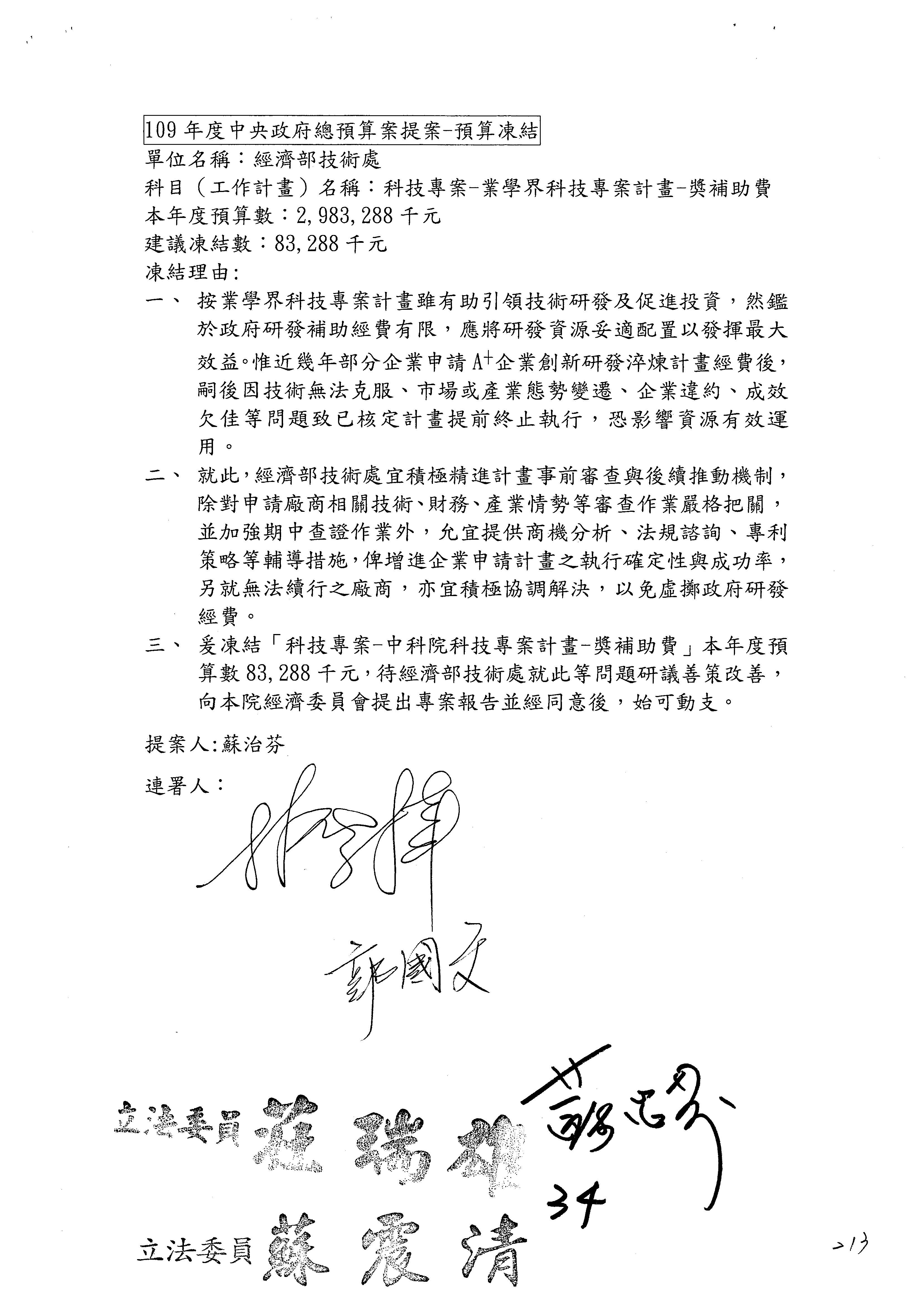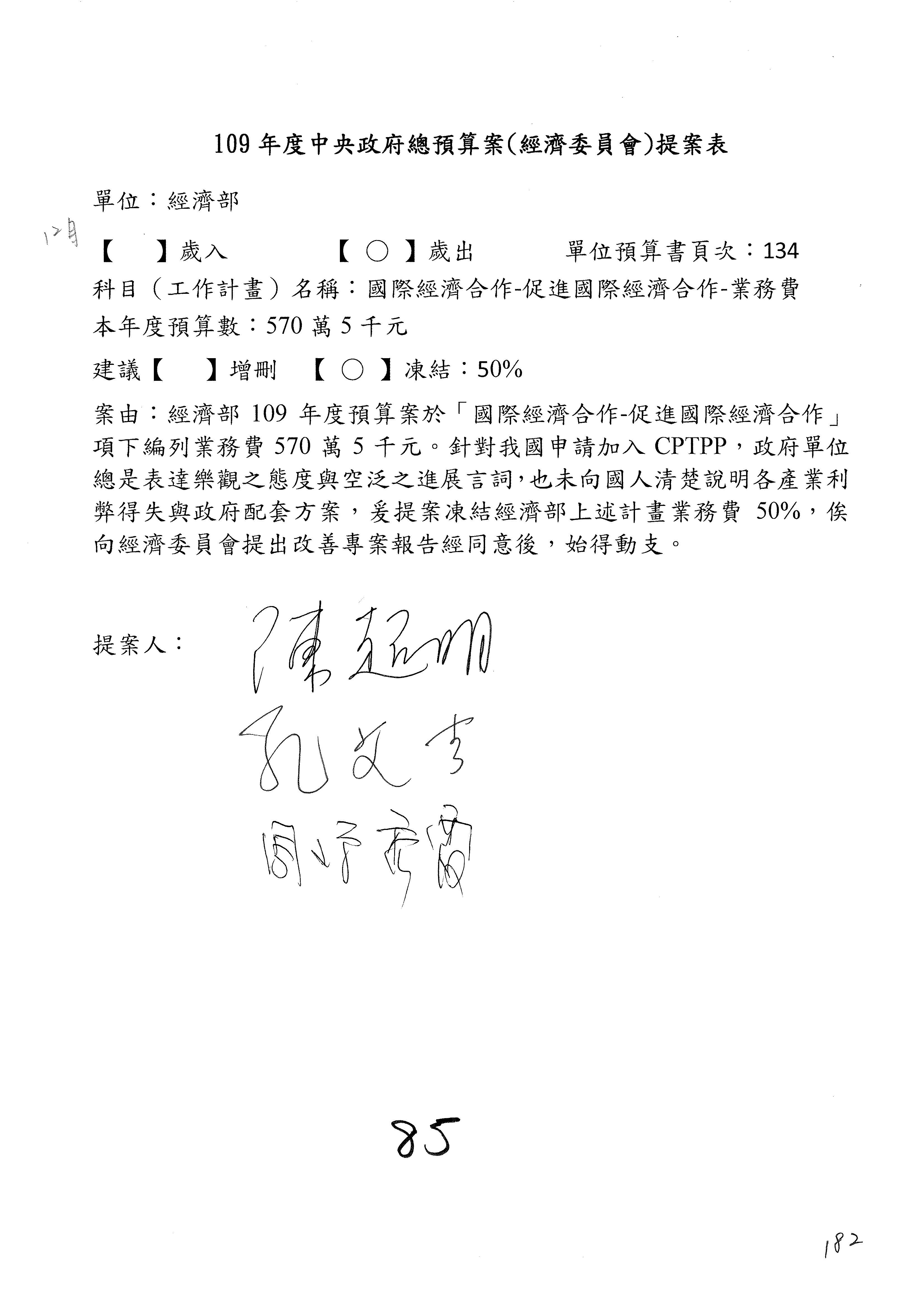 (一)國家發展委員會109年度歲出預算第3目「研擬經濟政策、協調推動財經措施」編列1,773萬3千元,凍結5%,俟向立法院經濟委員會提出書面報告後,始得動支。