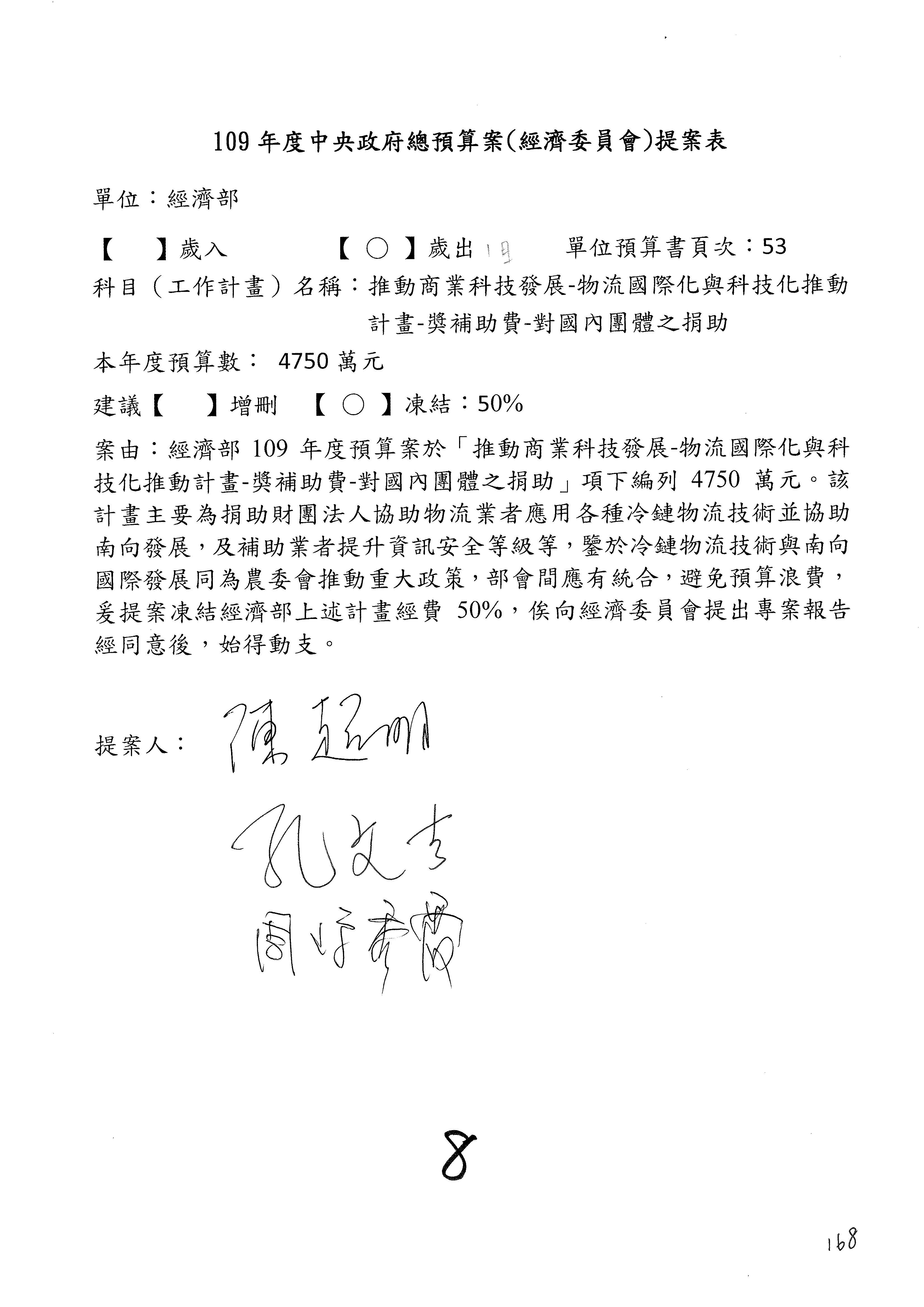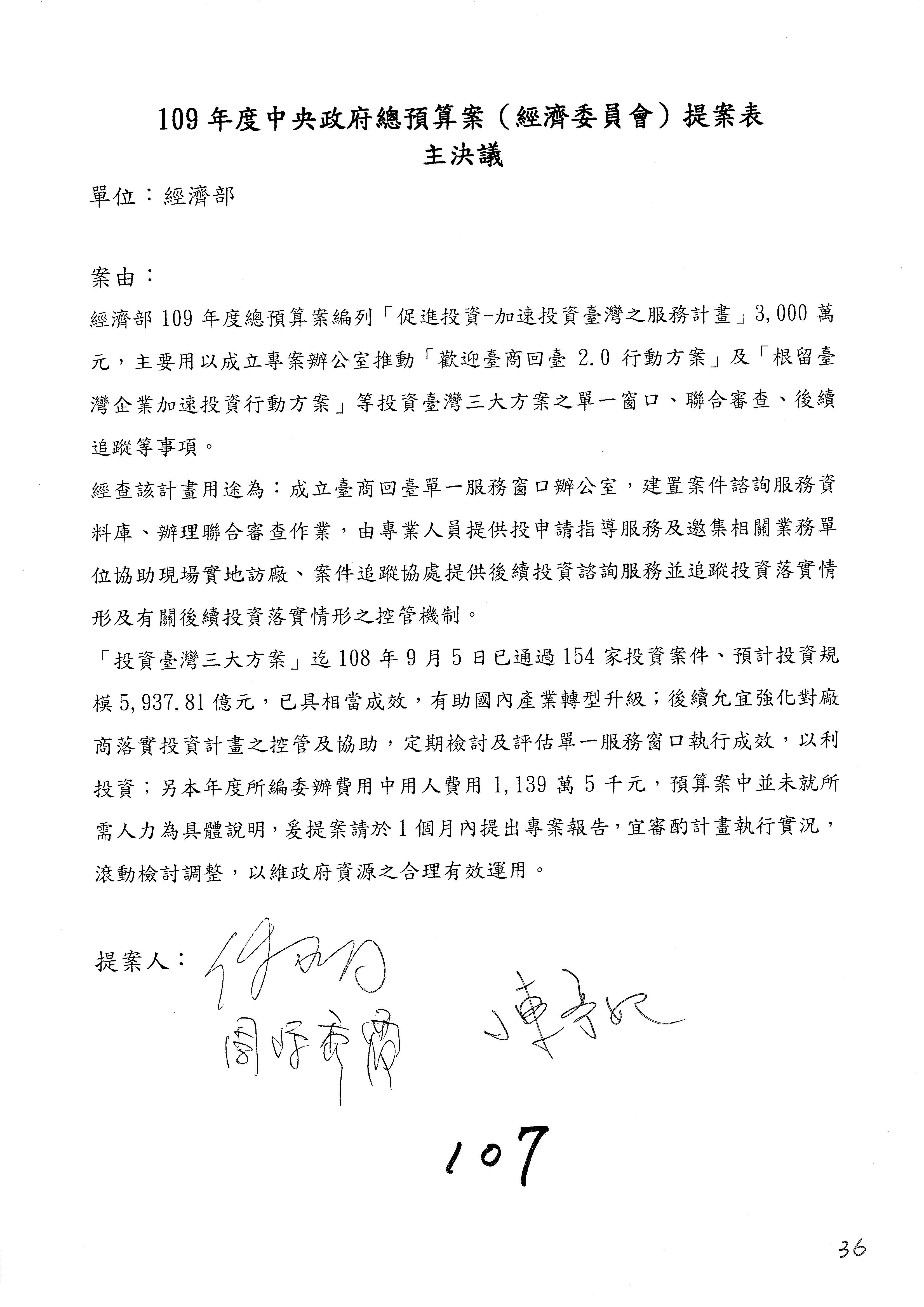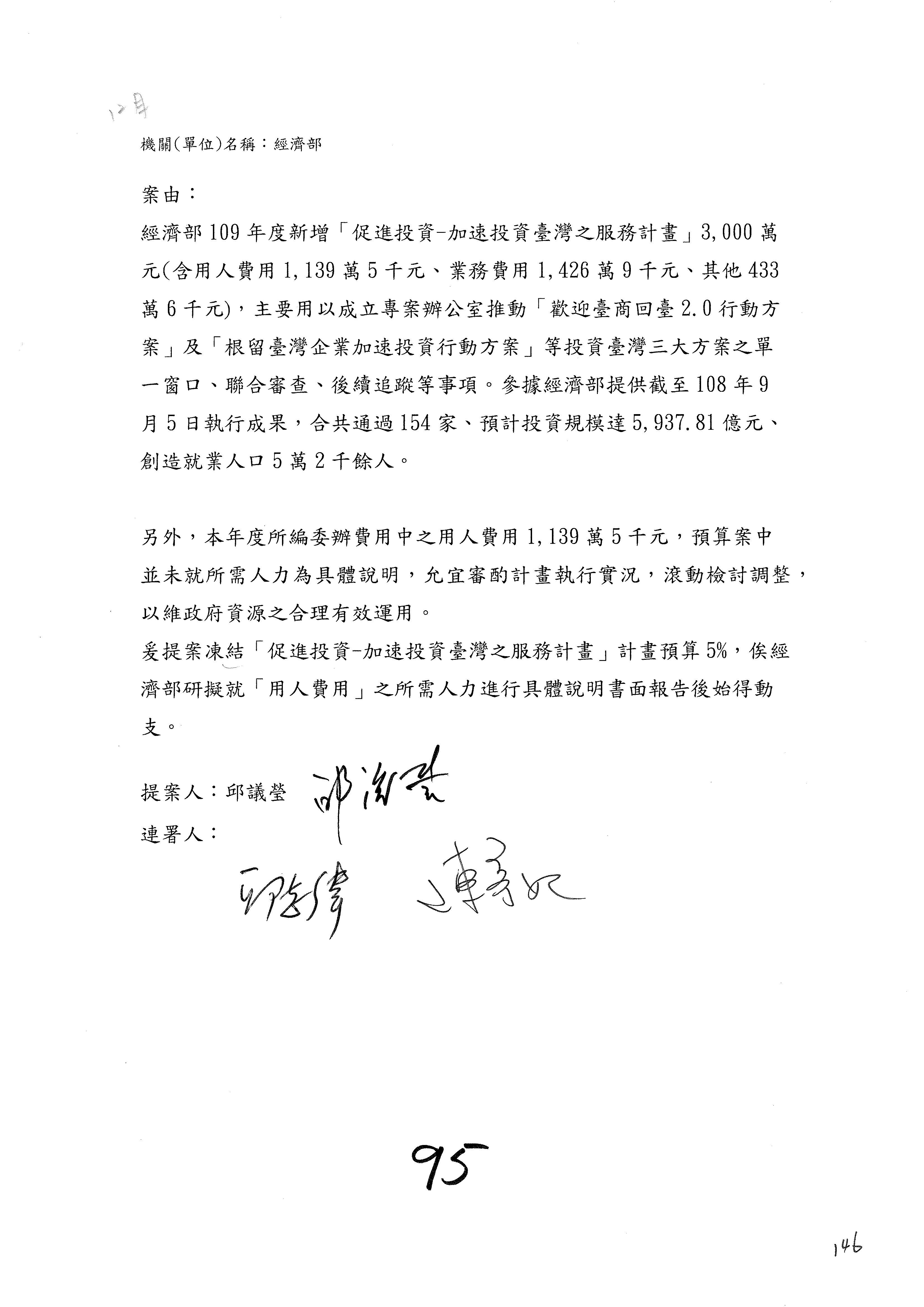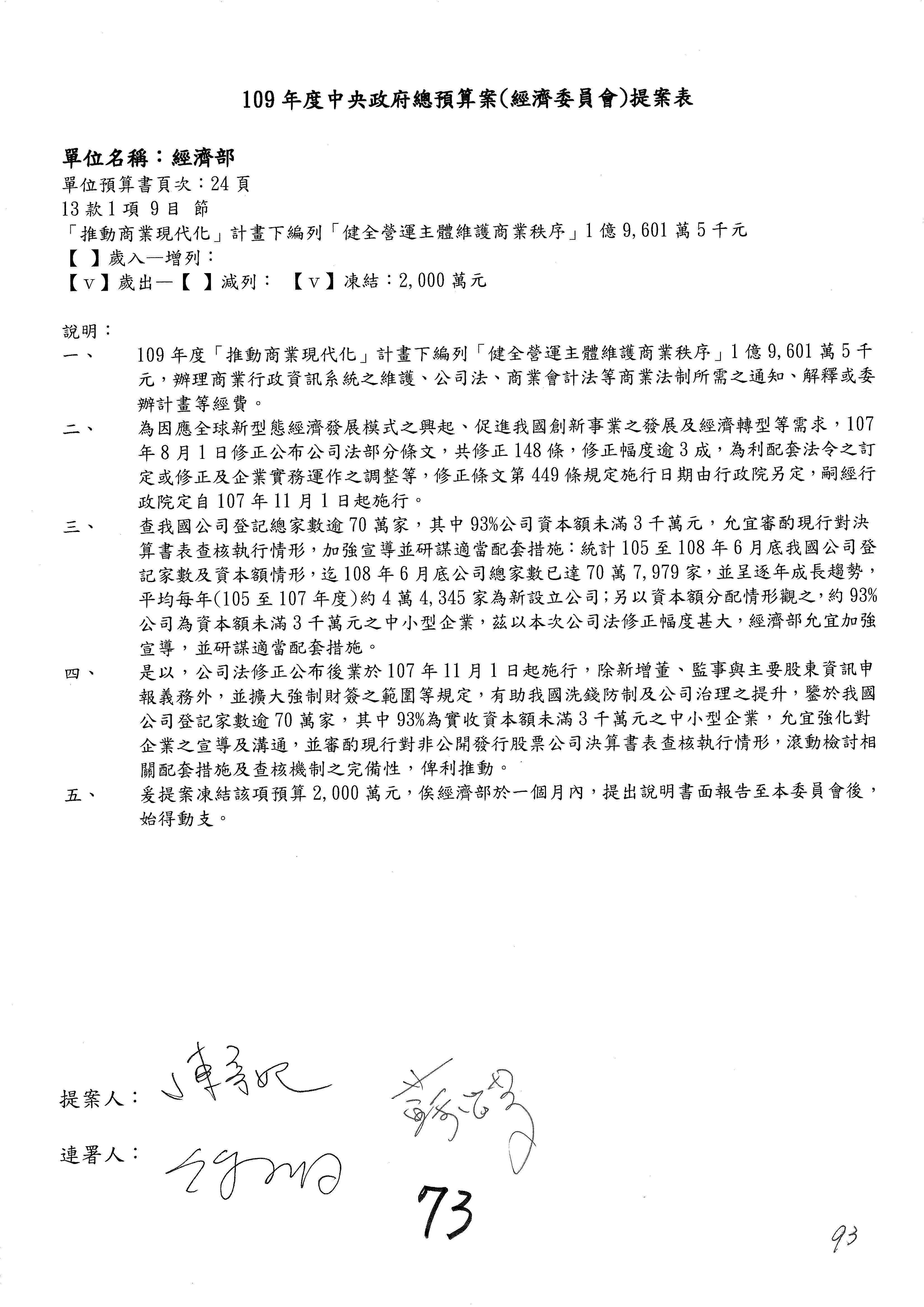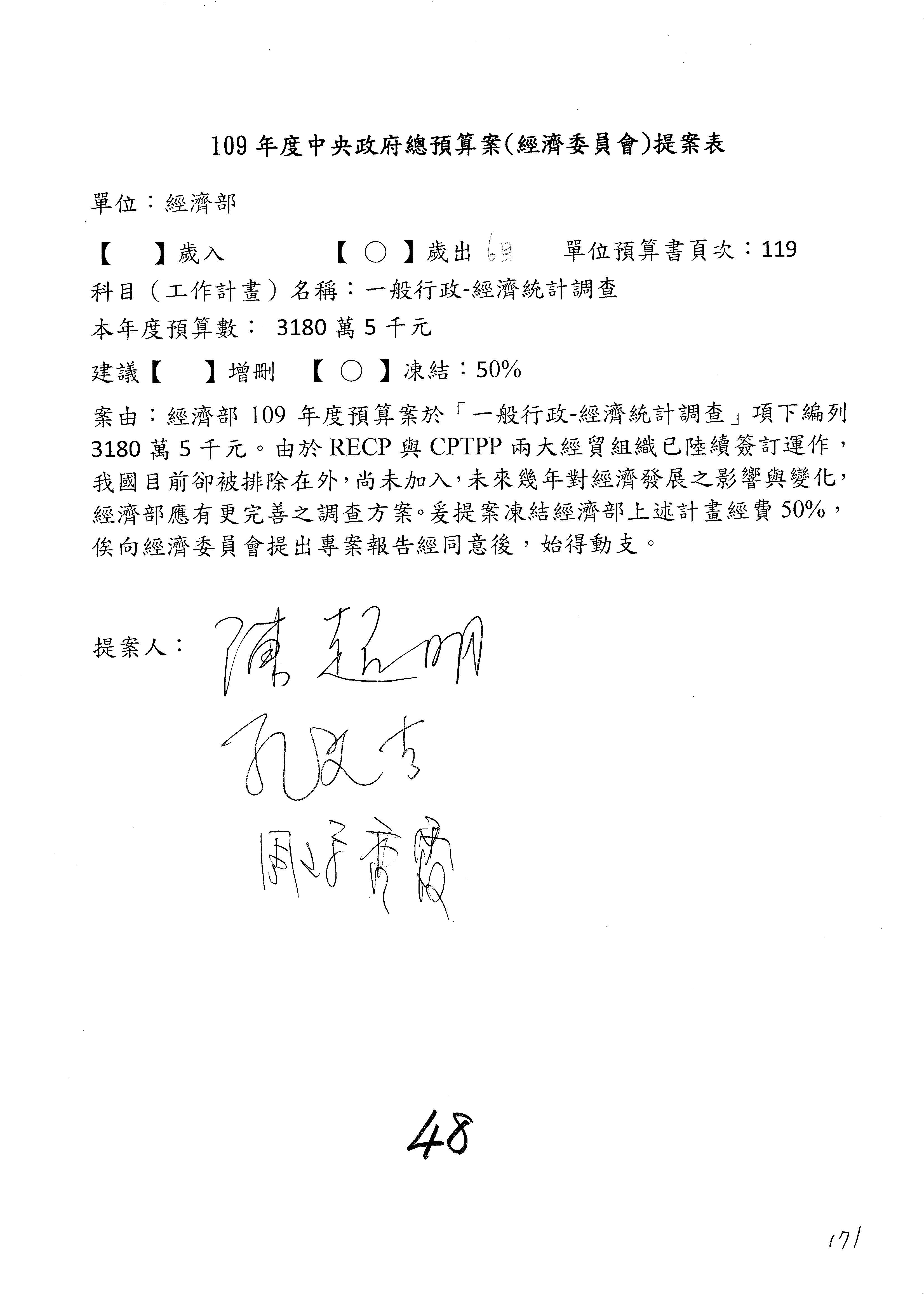 (一)國家發展委員會109年度歲出預算第3目「研擬經濟政策、協調推動財經措施」編列1,773萬3千元,凍結5%,俟向立法院經濟委員會提出書面報告後,始得動支。
