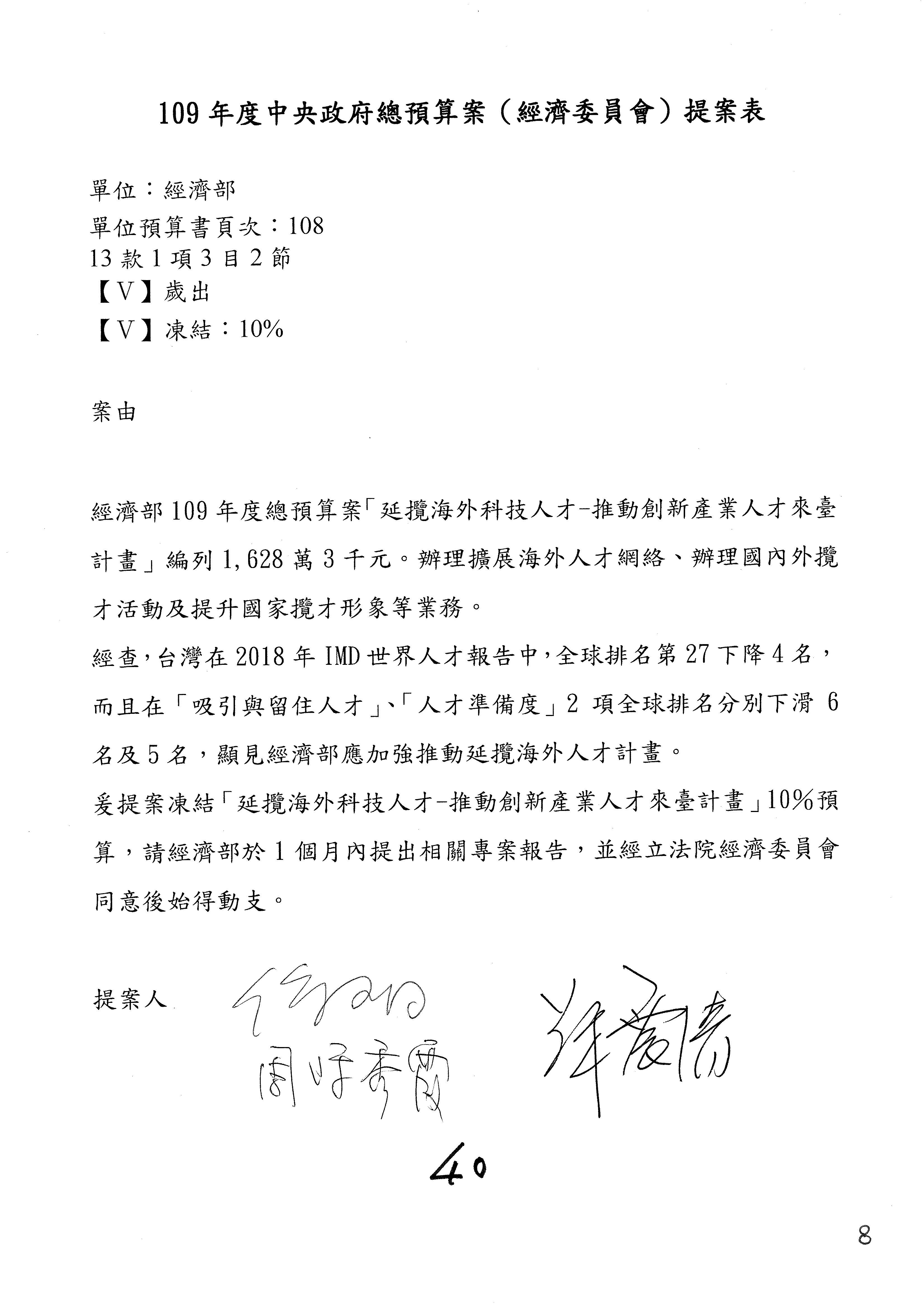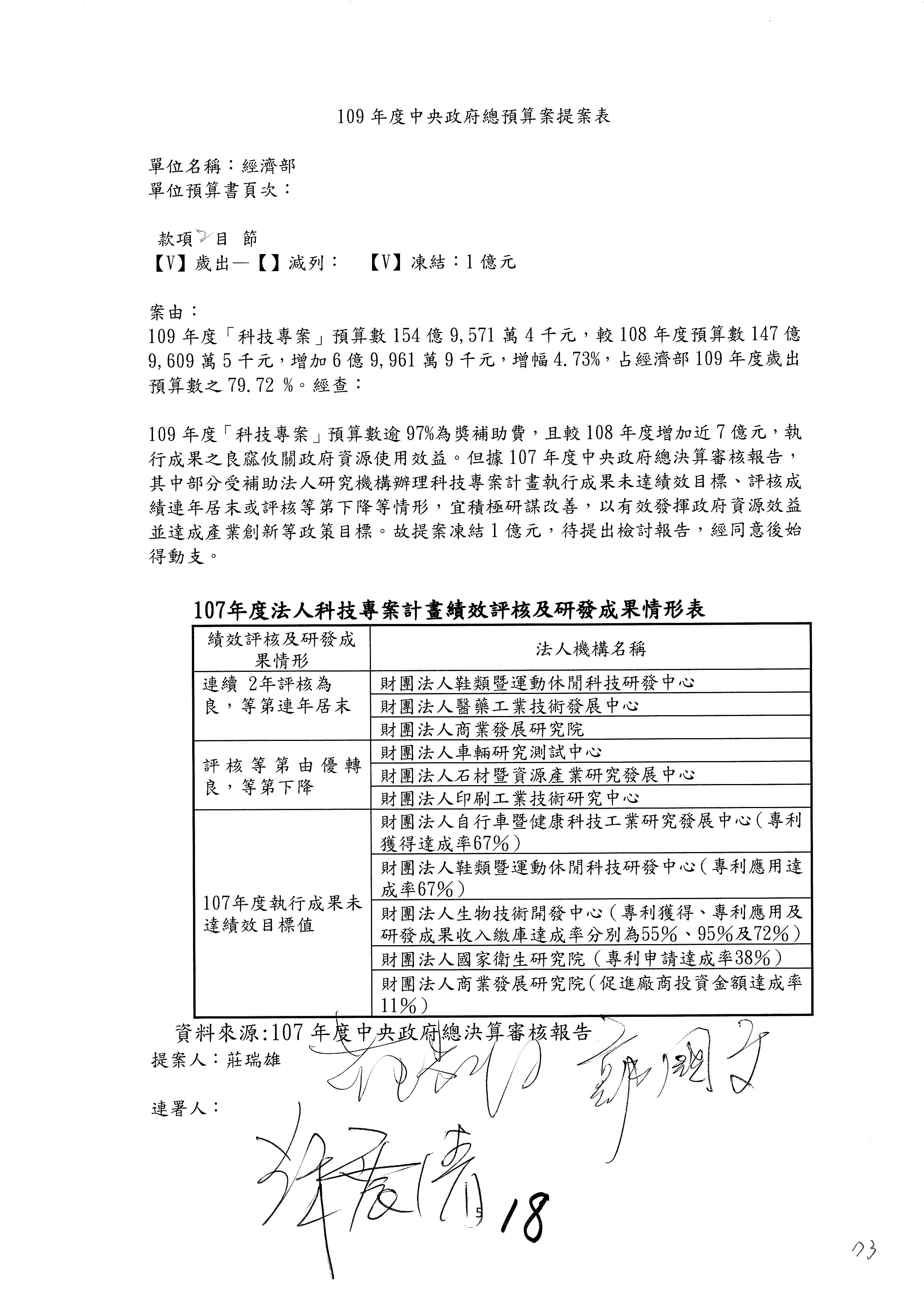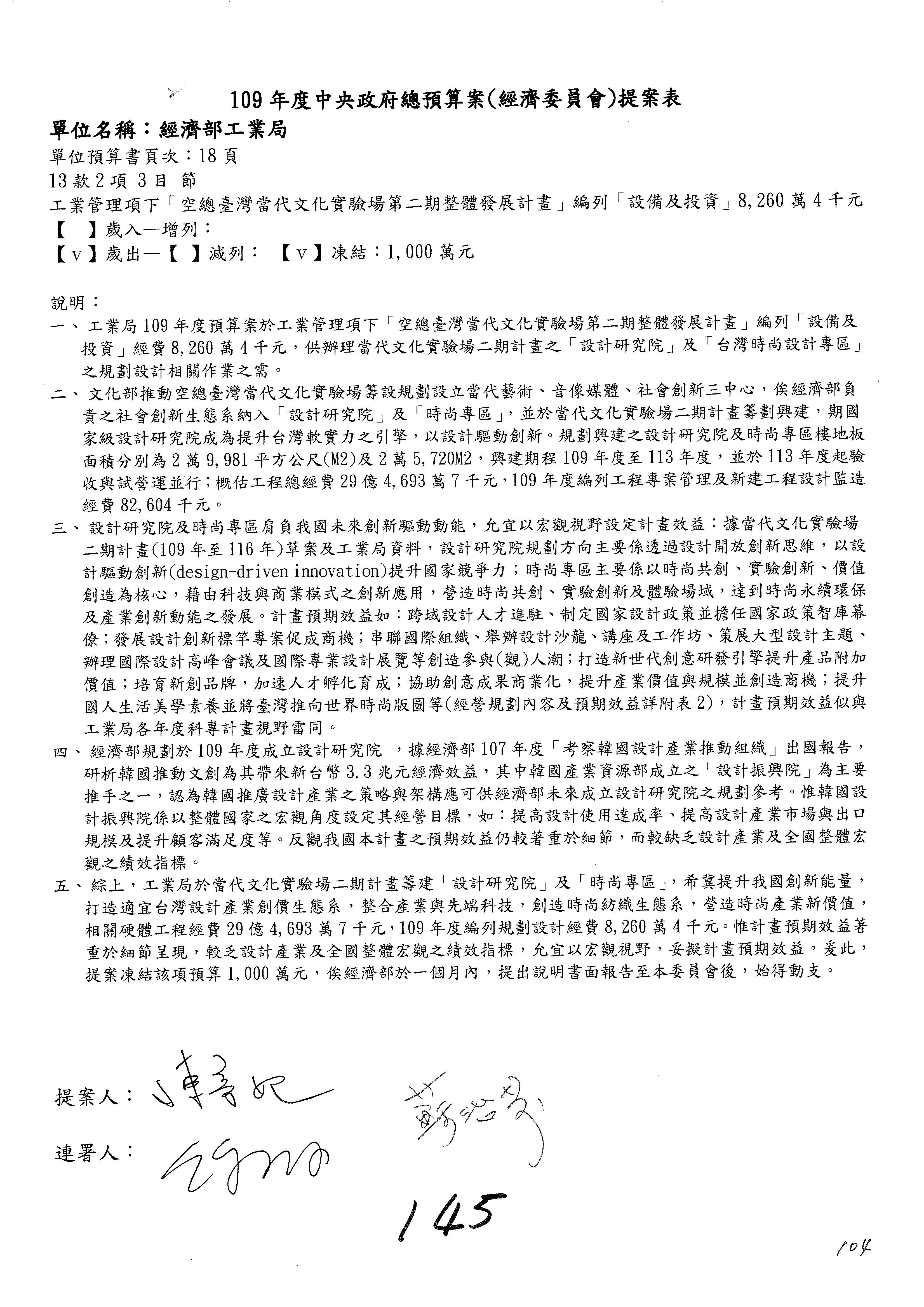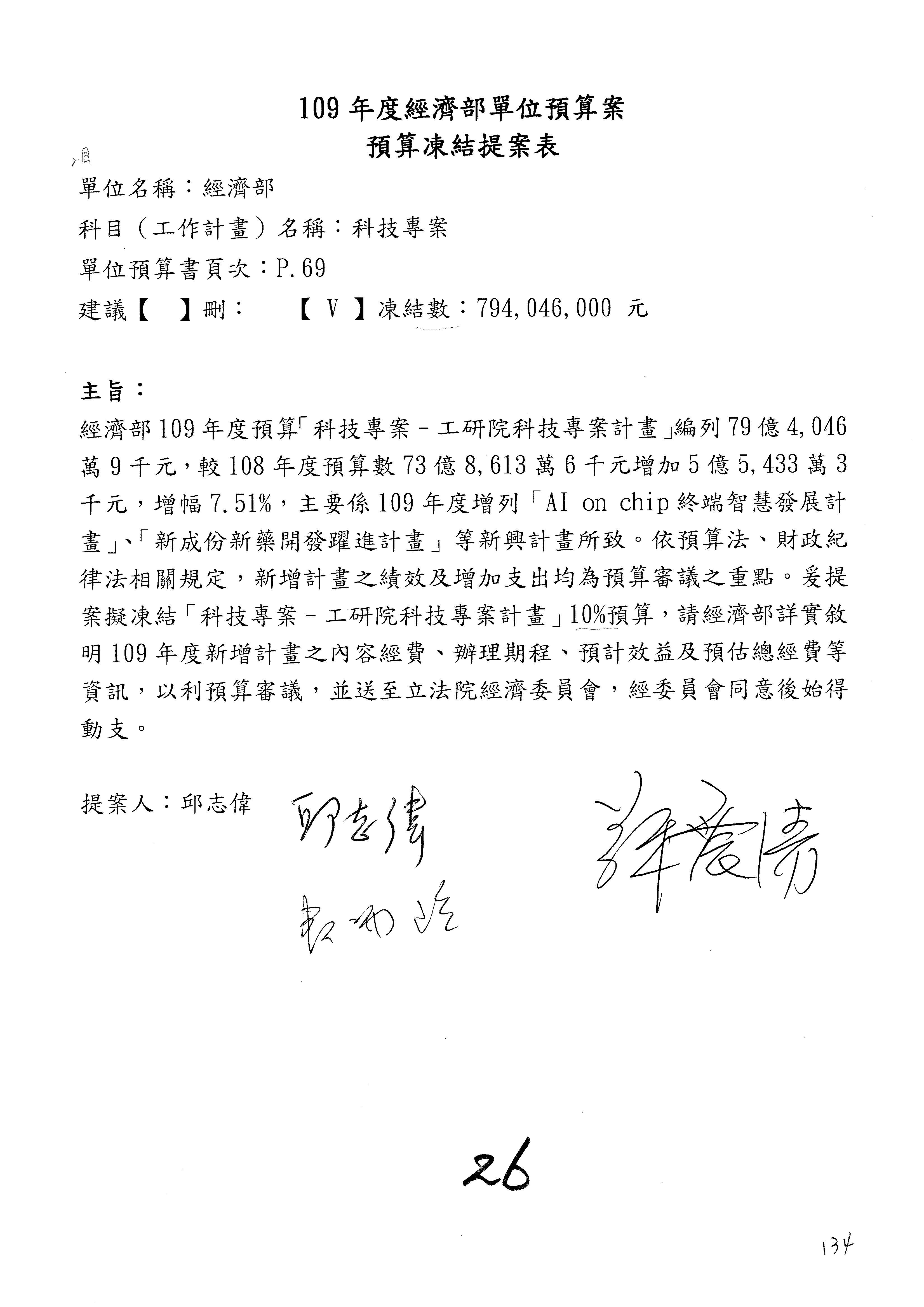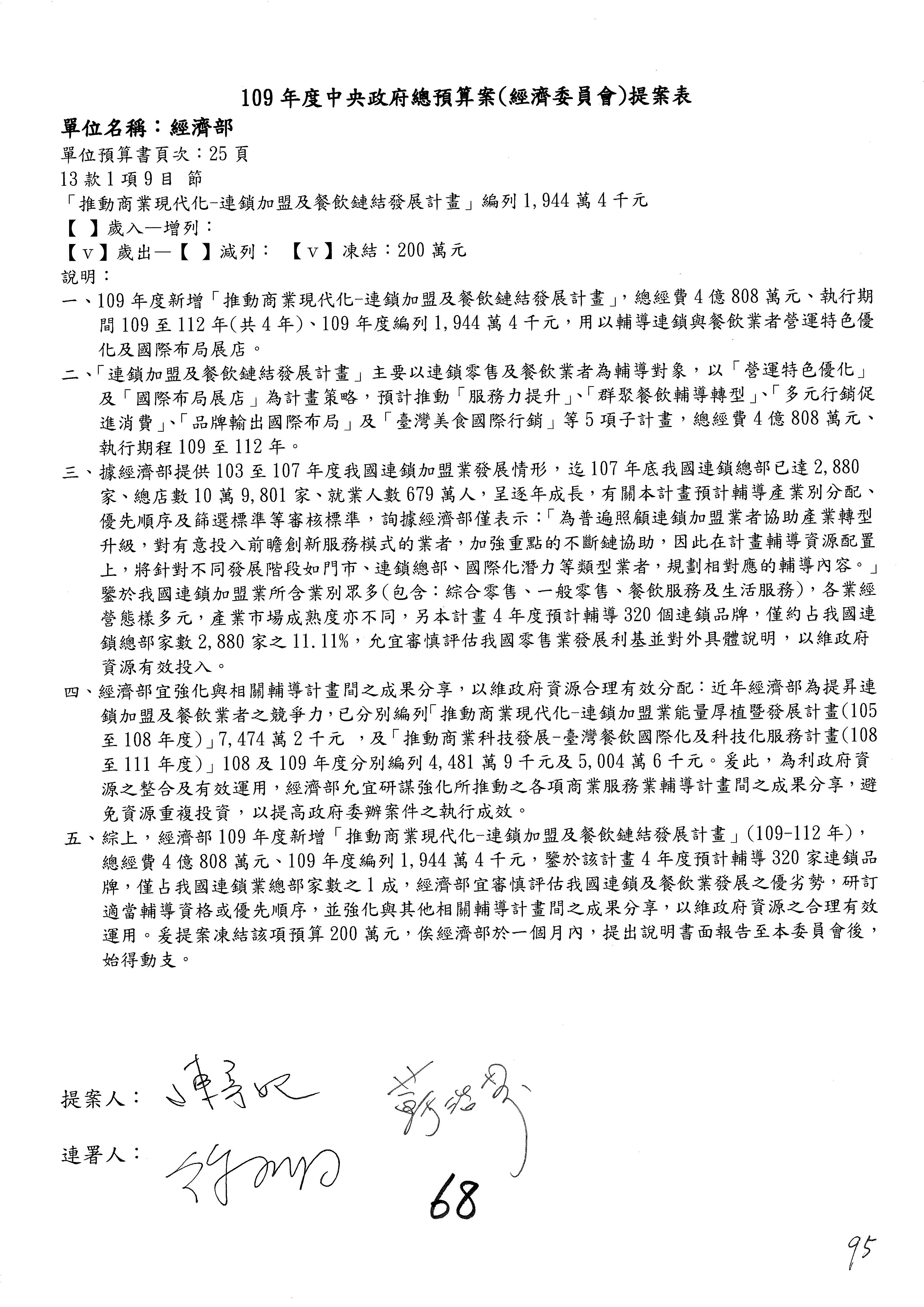 (一)國家發展委員會109年度歲出預算第3目「研擬經濟政策、協調推動財經措施」編列1,773萬3千元,凍結5%,俟向立法院經濟委員會提出書面報告後,始得動支。