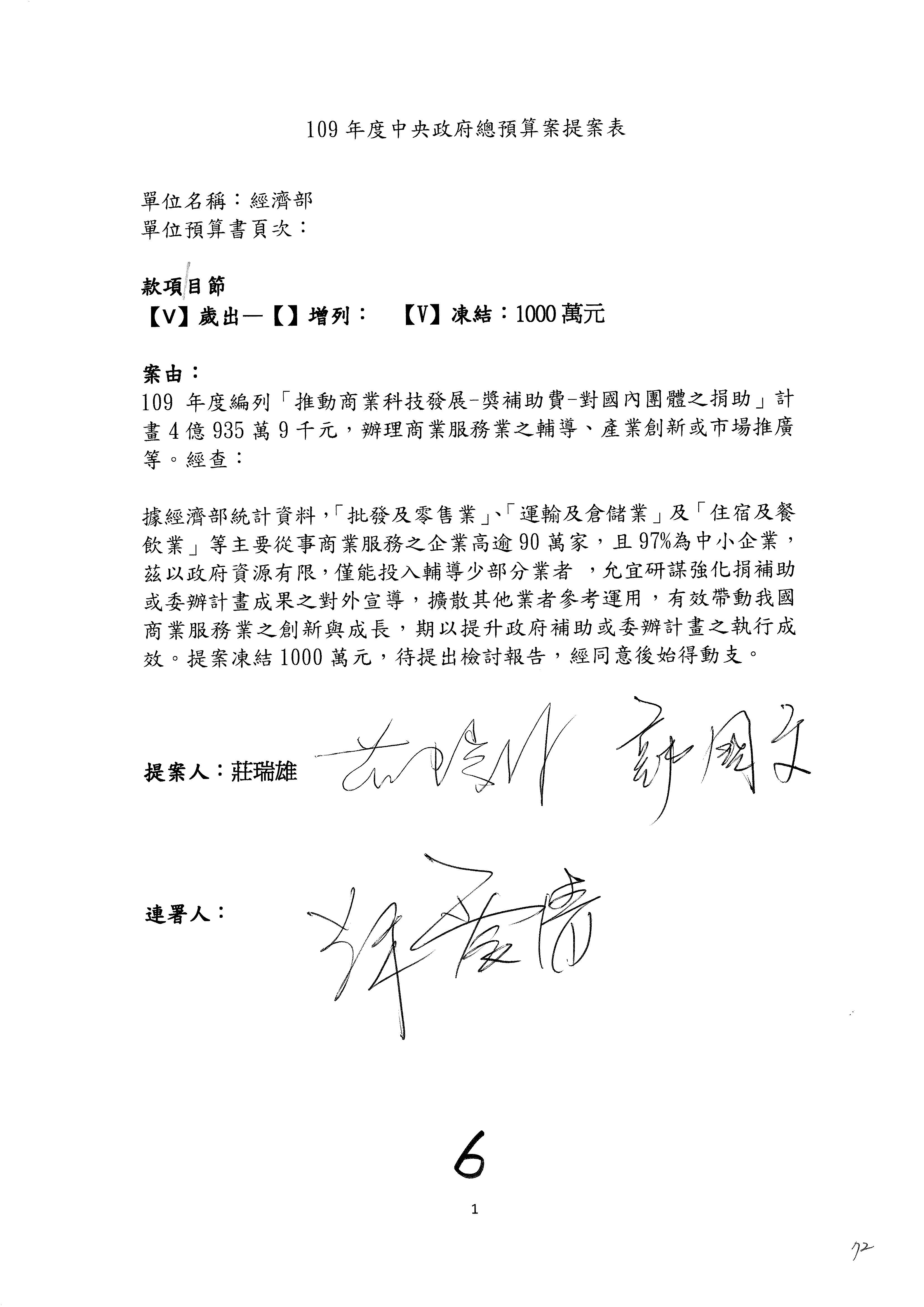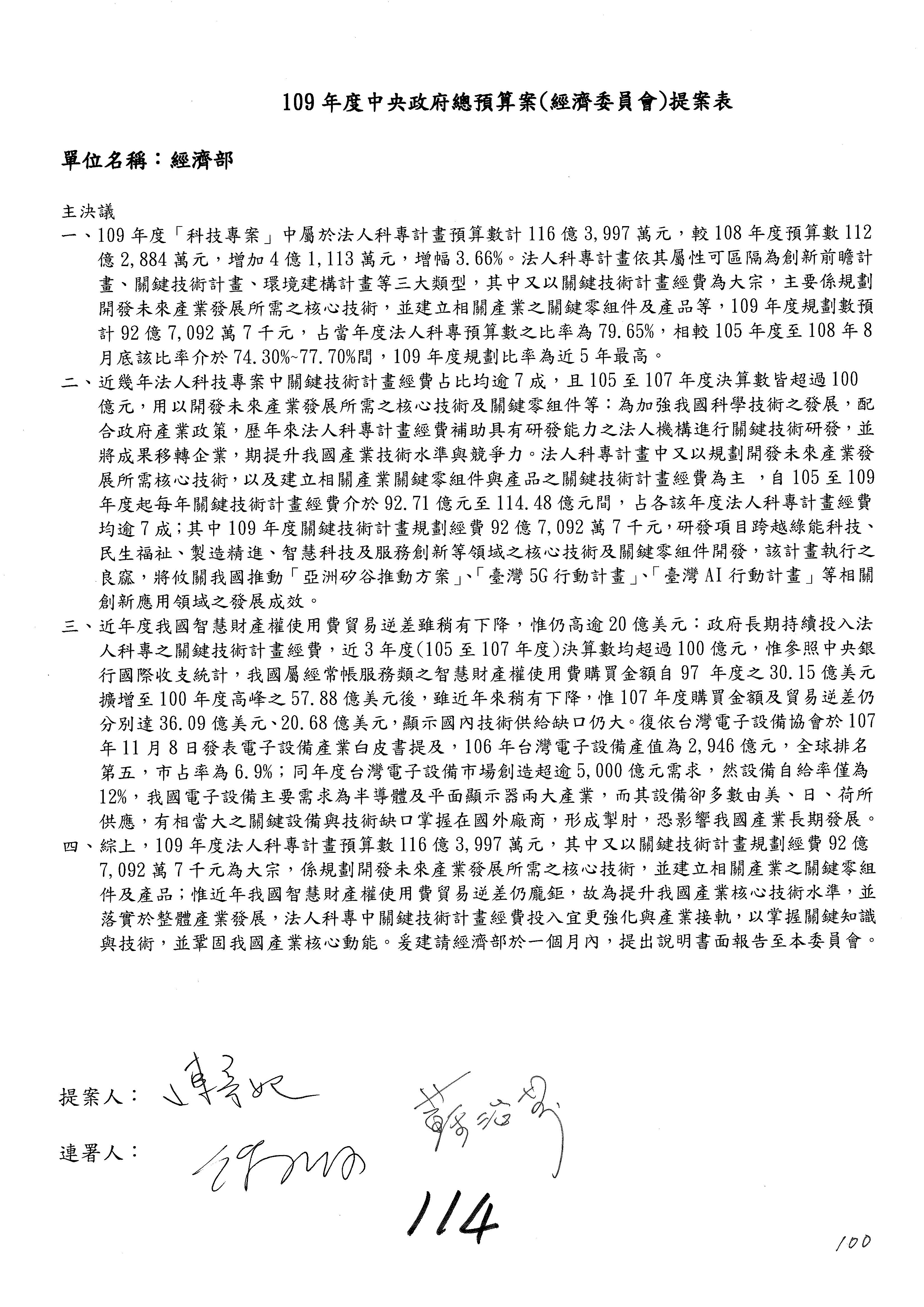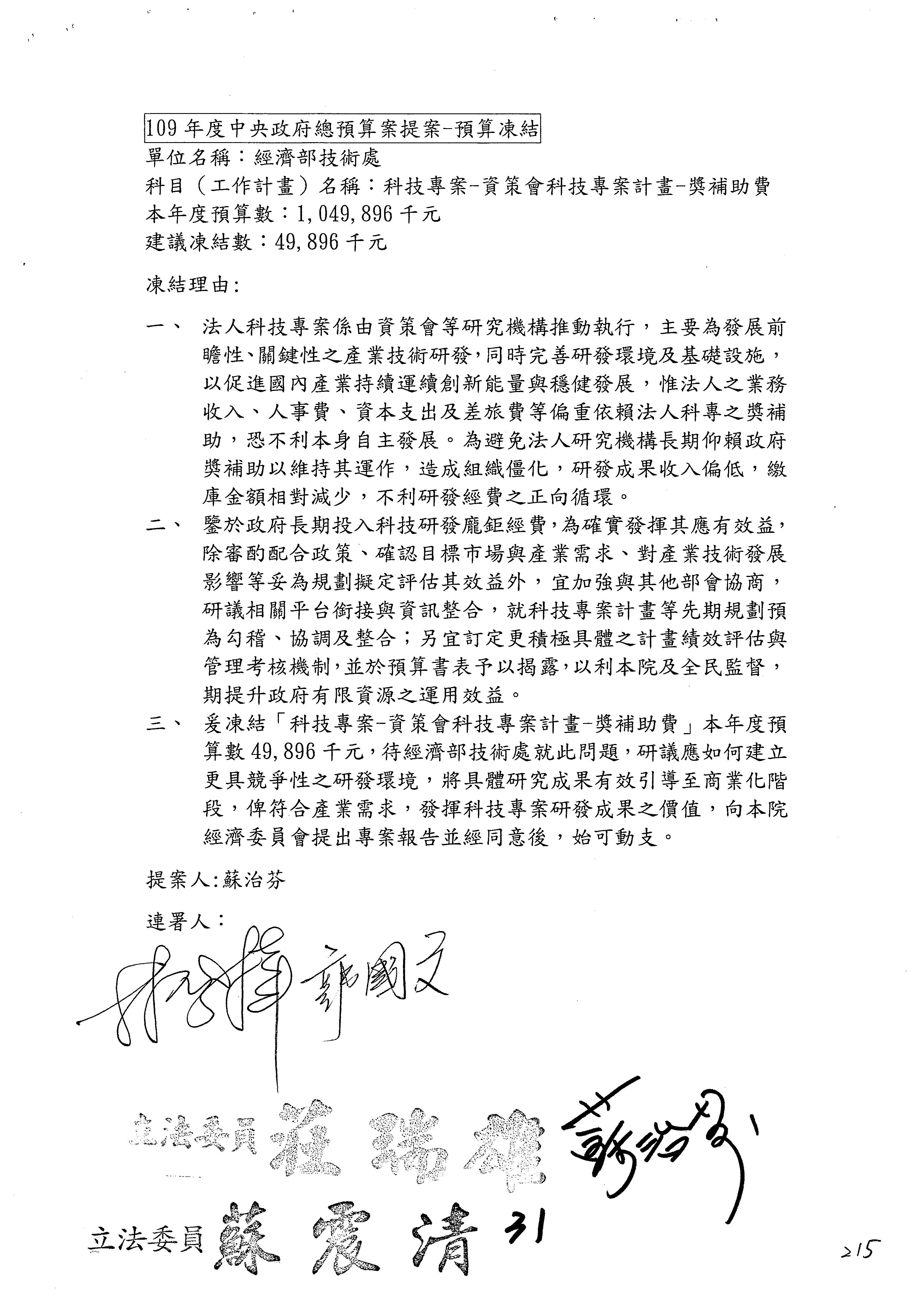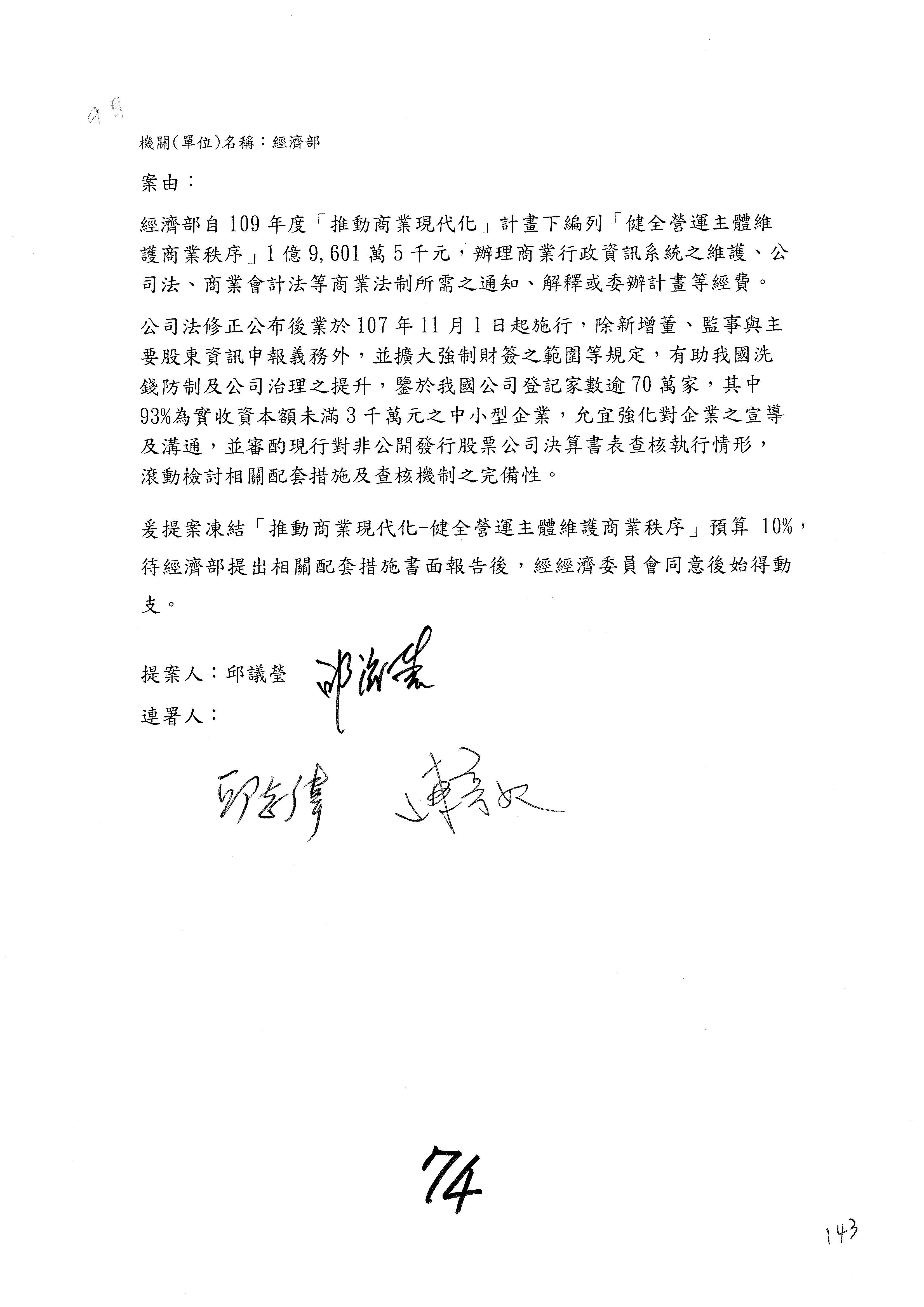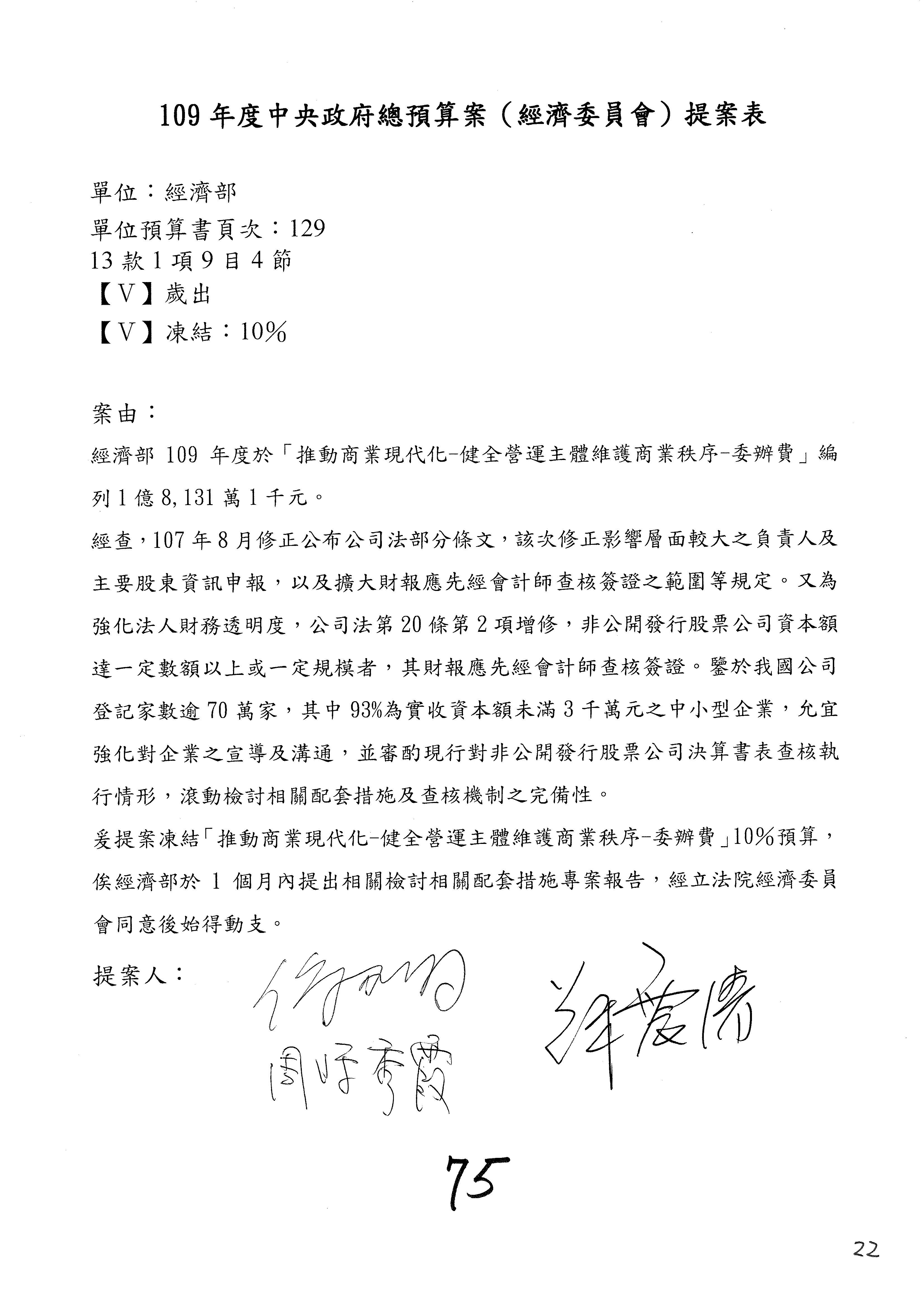 (一)國家發展委員會109年度歲出預算第3目「研擬經濟政策、協調推動財經措施」編列1,773萬3千元,凍結5%,俟向立法院經濟委員會提出書面報告後,始得動支。